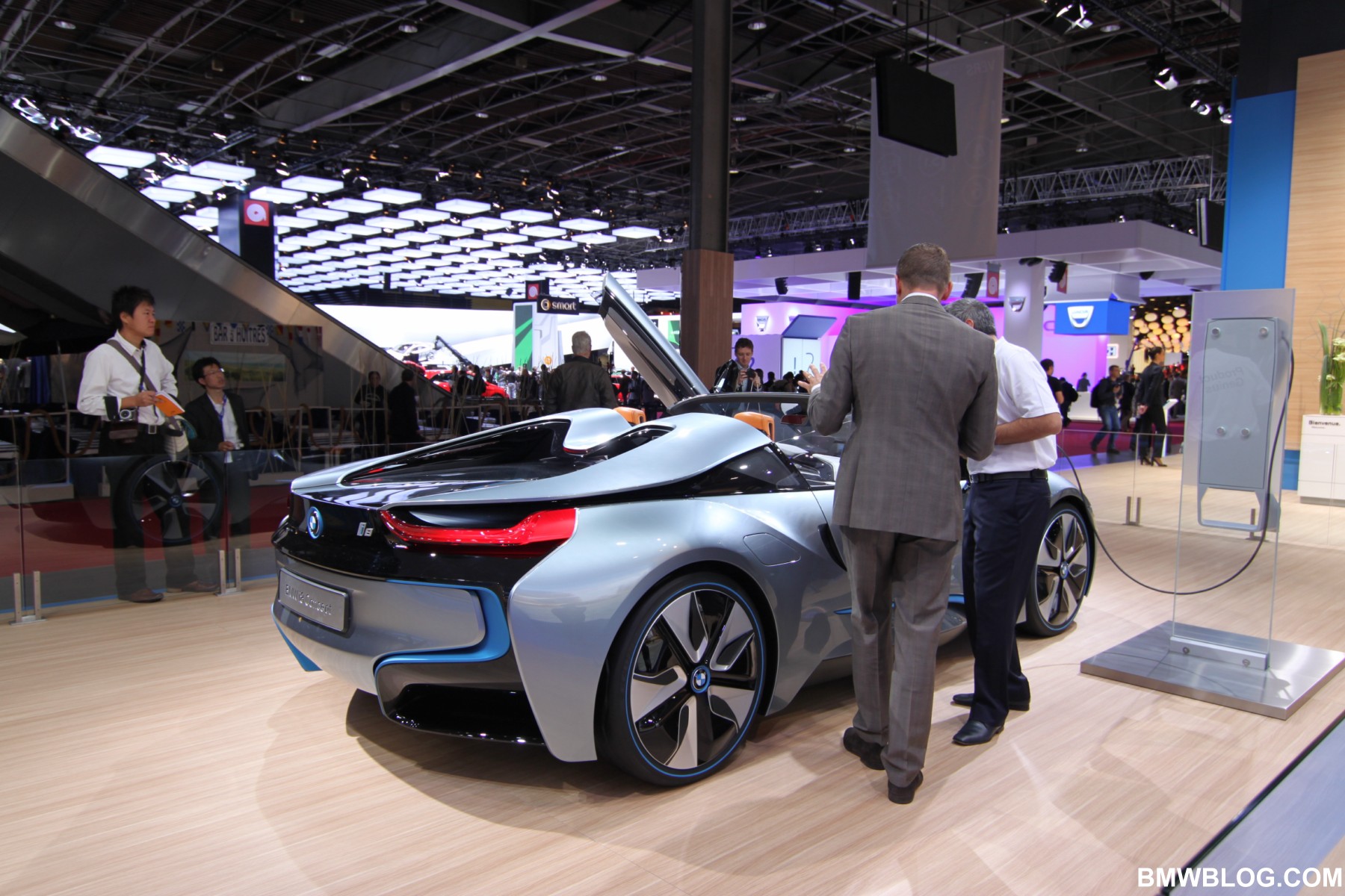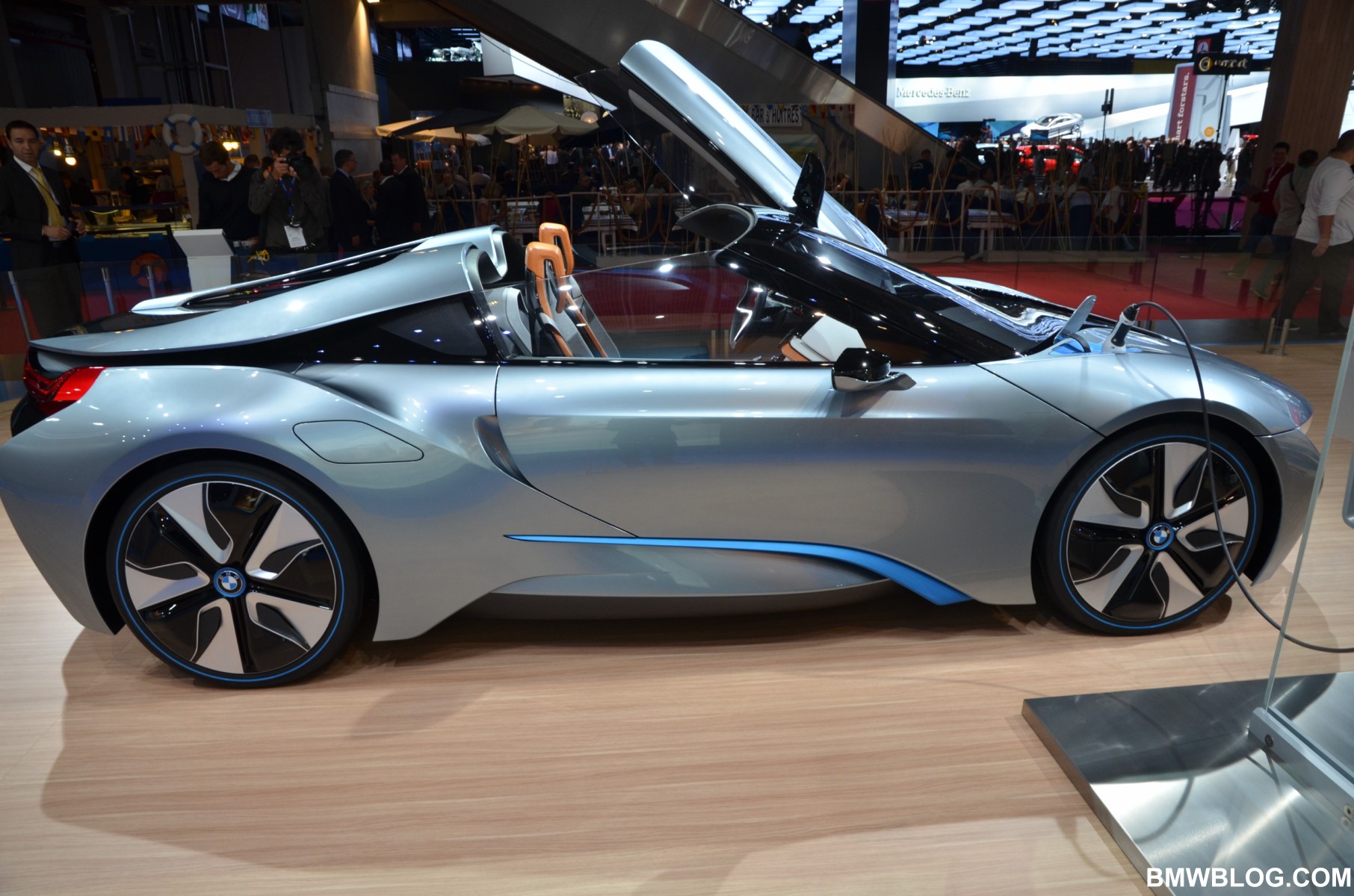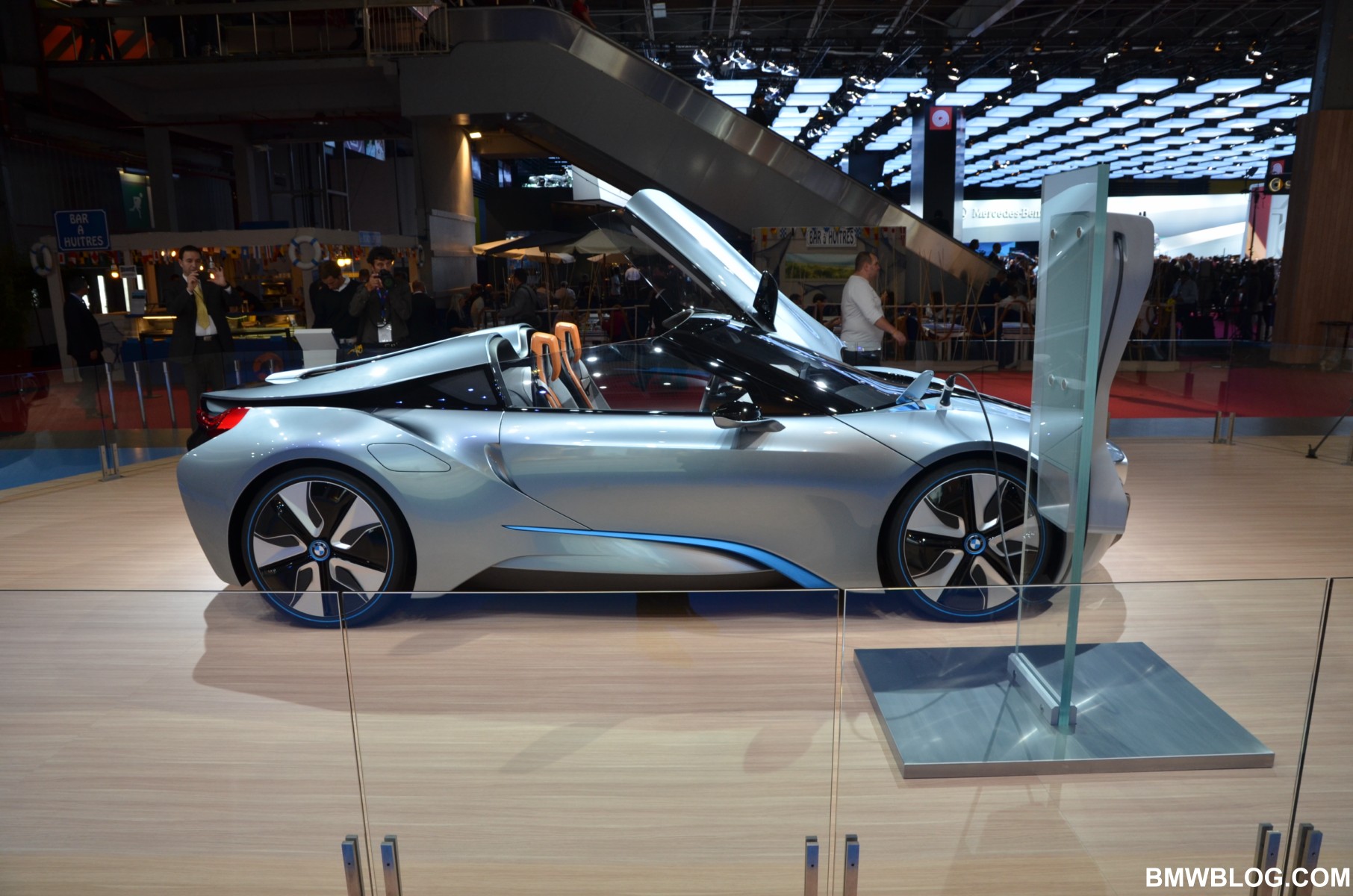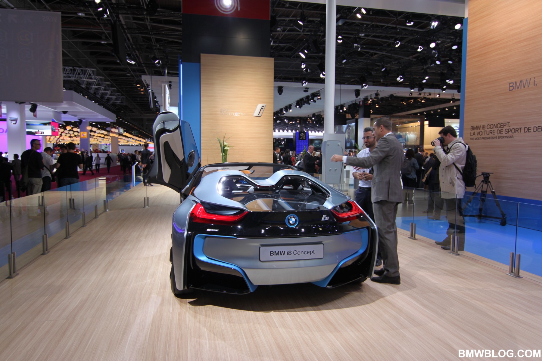 BMW displayed today at the Paris Motor Show the BMW i8 Spyder Concept. The Spyder Concept is a two-seater, open top variant with the same architecture but with a lot more curb appeal. Among the most eye-catching features of the BMW i8 Concept Spyder are the upward-swivelling, windowless doors.