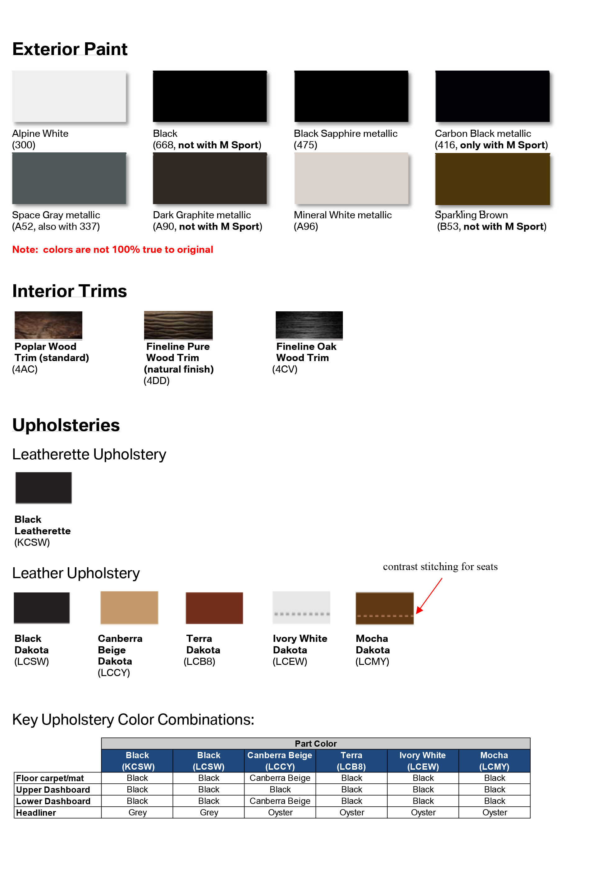 Ahead of its debut, BMW dealerships are starting to receive the ordering guides that give us a look at the options, paints and upholsteries for the new X5. The following exterior colors will be offered for the F15 X5: Alpine White, Black, Black Sapphire Metallic, Carbon Black Metallic, Space Gray Metallic, Dark Graphite Metallic, Mineral White Metallic and Sparkling Brown.