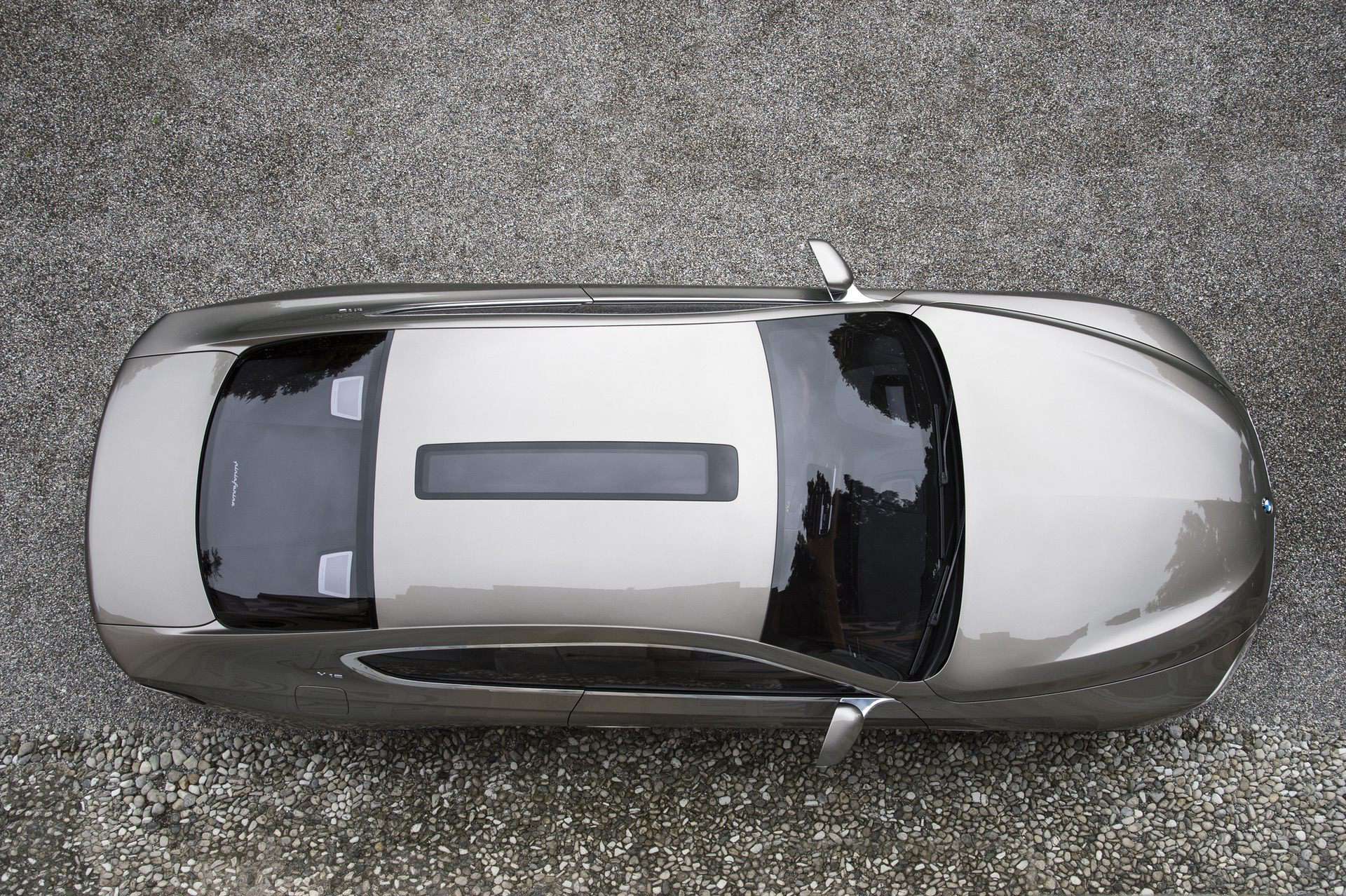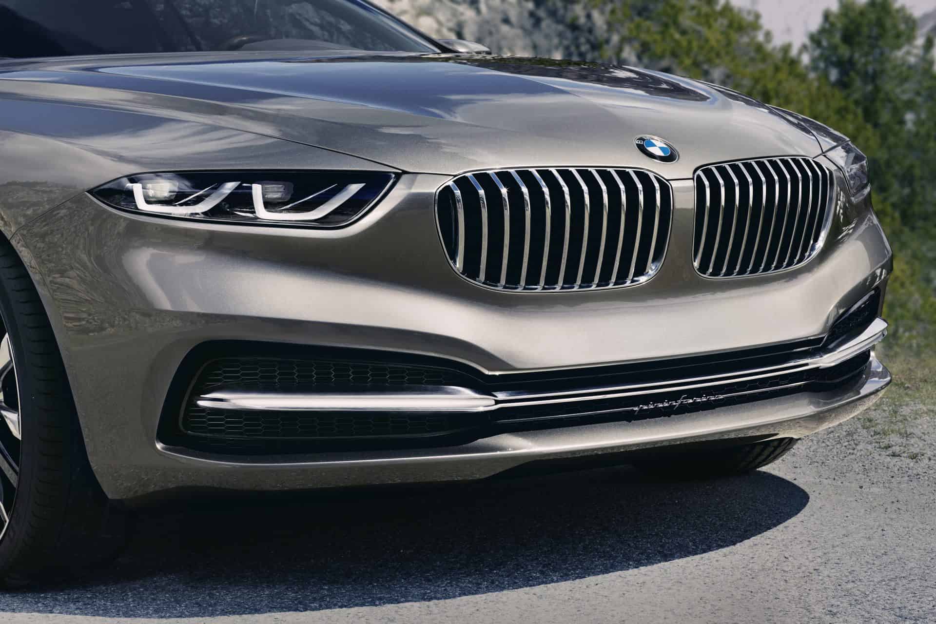 The trademark BMW kidney grille forms the central element of the front-end design, and all surfaces and lines take their bearings from it. It symbolically points to the engine at the heart of the vehicle, its size reflecting the power of the V12 unit nestling behind it. The “kidneys” are angled towards the road, citing the typical BMW “shark nose” and lending the front end an even more dynamic look, particularly when seen from the side. Viewed up close it discloses highly accomplished detail work: the front part of the bipartite kidney grille is made of matt-sheen aluminium, while behind it an identically shaped part in high-gloss black adds visual depth and makes for an exciting contrast of materials.