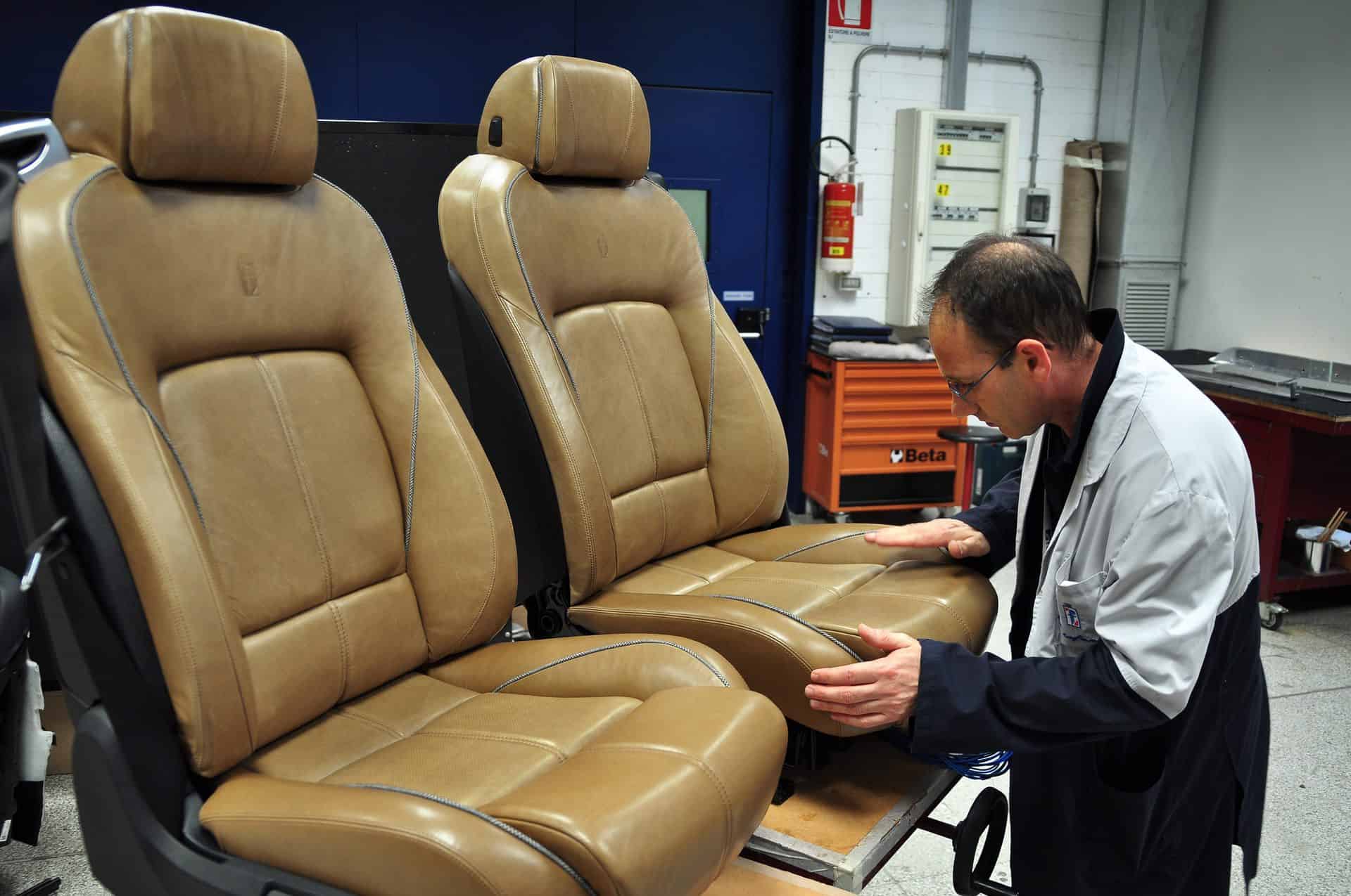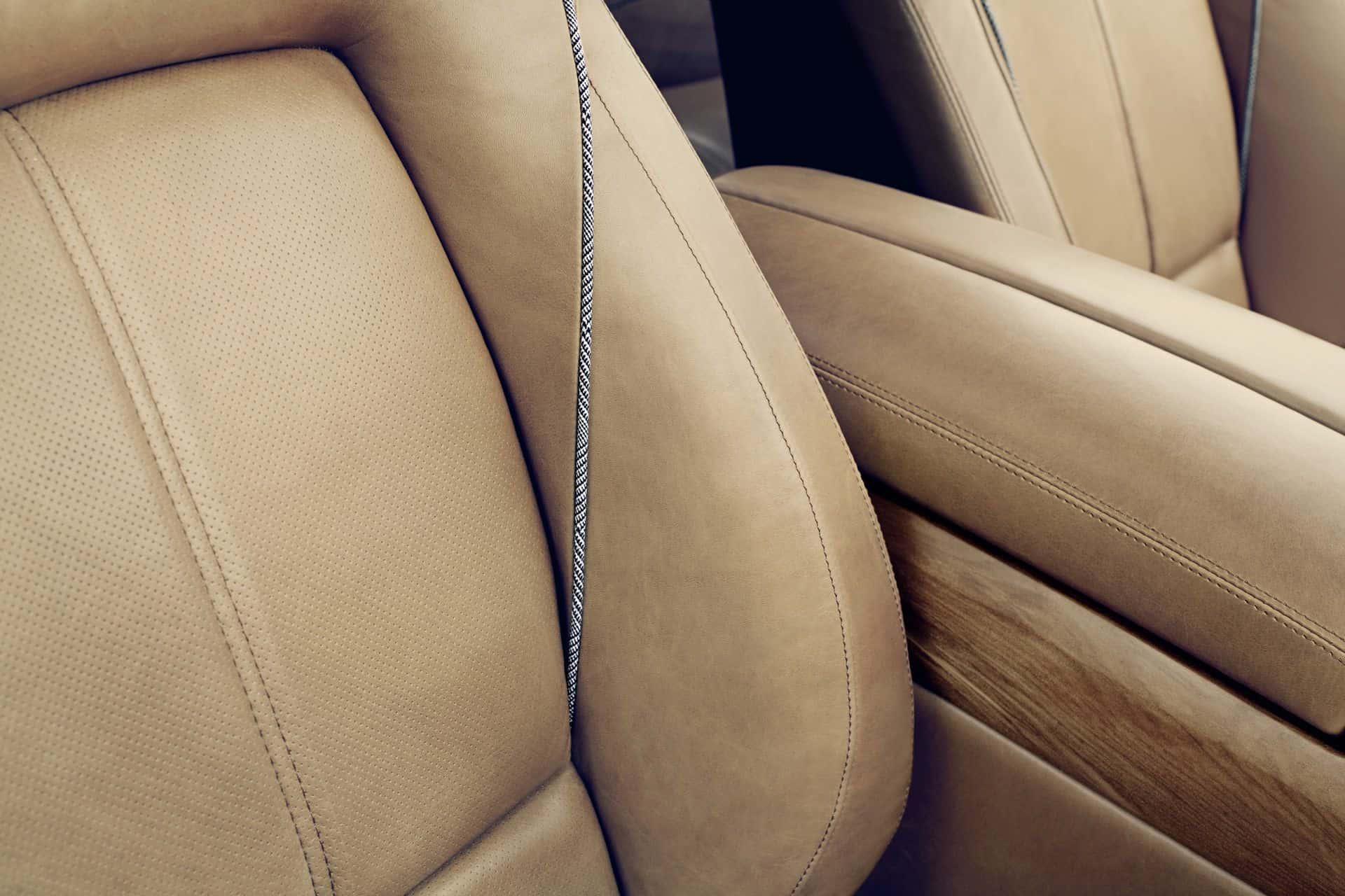 The roof liner of finest Italian virgin wool features the striking “Principe di Galles” pattern. This grey plaid strikes a bold contrast to the traditional materials used for the doors and dashboard. The brown leather seats also pick up on the pattern in their all-round piping. Allowing extra light into the interior is an oblong aperture in the roof liner which is additionally illuminated by white LEDs. In the footwell areas, a soft deep-pile carpet in dark grey adds to a subtle sense of wellbeing. Another interior detail are the freestanding B-pillars, whose elegant design when viewed from the outside creates a homogeneous glazed area and frameless doors that appear very light.