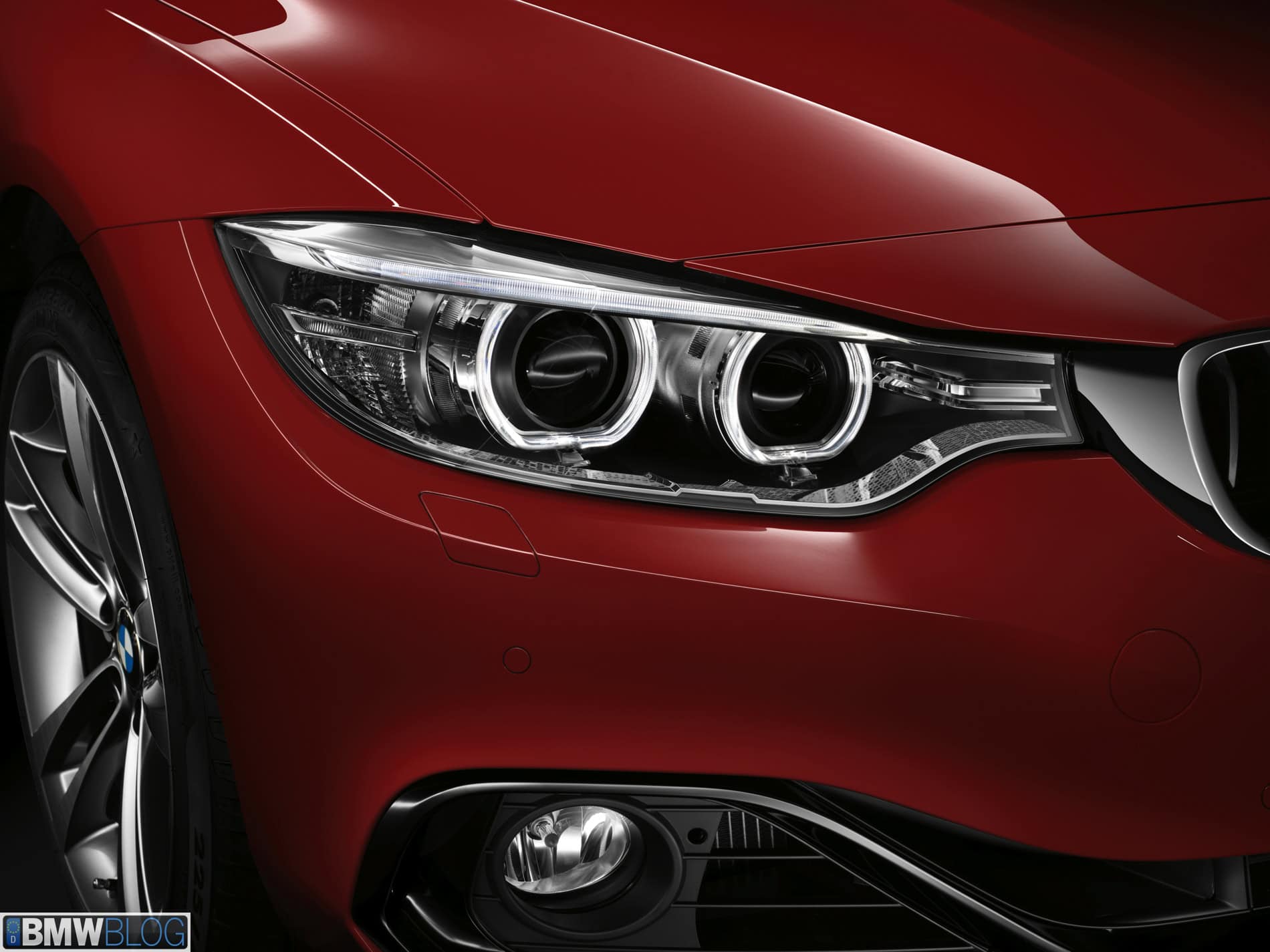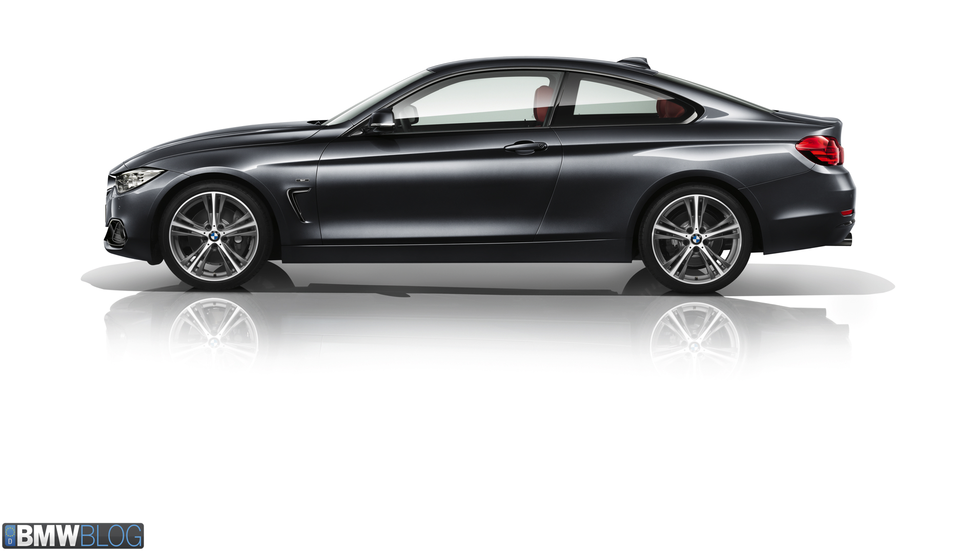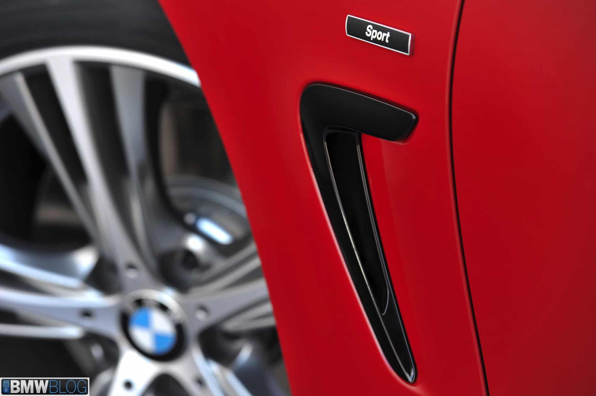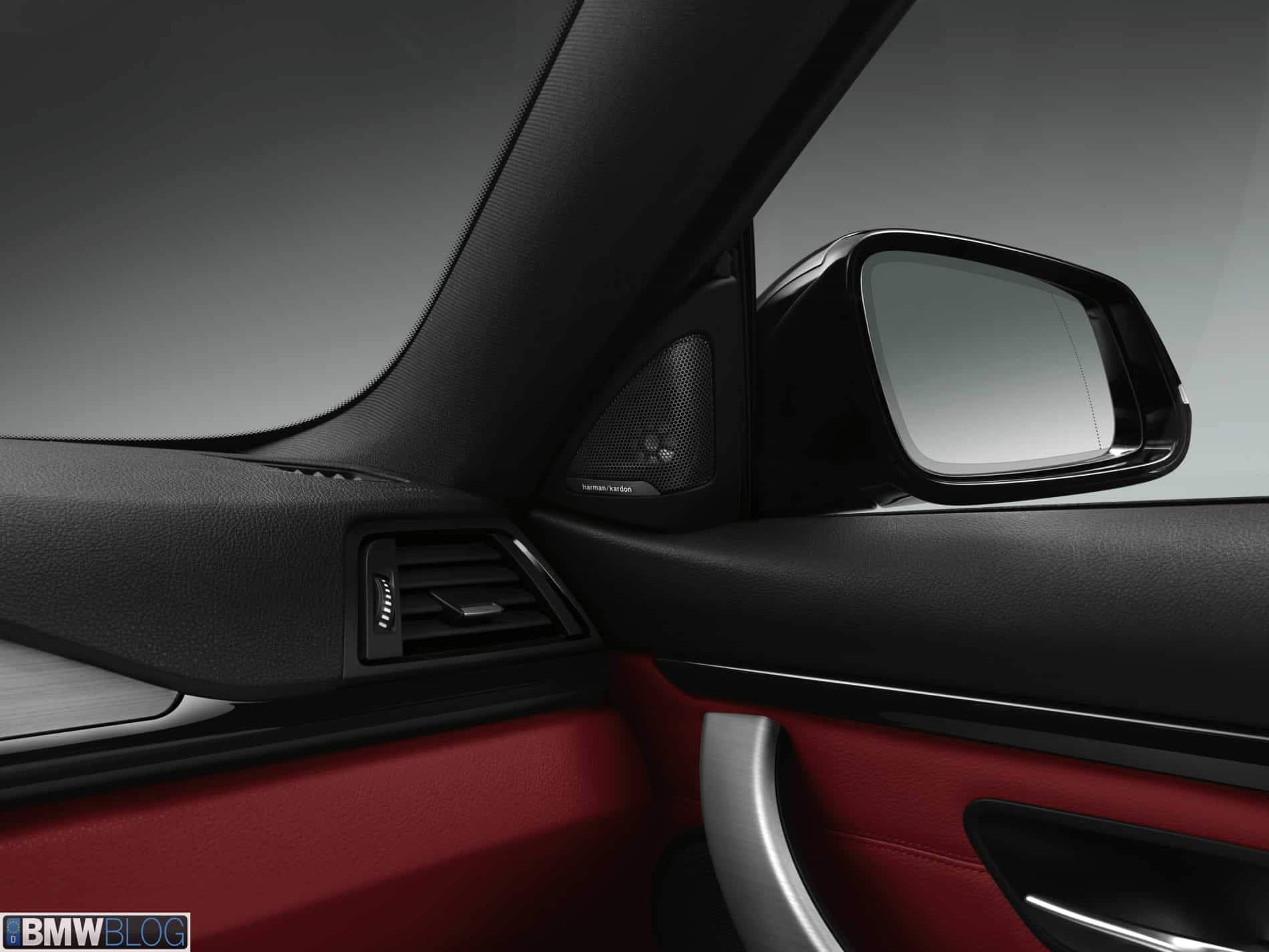 Sport Line: The Sport Line adds extra depth to the BMW 4 Series Coupe with a selection of exterior body features in high-gloss black. A sport suspension is included for rear-wheel drive models, setting an exciting tone for the driving experience. The standard high-gloss black B-pillars and black wrap-around window strip give the car an even sportier look, along with nine molded high-gloss black kidney grille slats in a chrome-colored surround. The three black air intakes in the front apron and the likewise black Air Breathers draw the eye to the car’s aerodynamic features. 18-inch or optional 19-inch light-alloy wheels (435i only) in twin-spoke design provide a more performance-oriented look. From the rear, the BMW 4 Series Coupe with Sport Line can be identified by the black trim strip level with the rear apron and the black exhaust tips. Inside the car, black and red accents, such as the red trim rings in the inner circle of the instrument dials and red stitching on the sport steering wheel, provide a pronounced contrast. An anthracite-colored headliner is also included to reduce sun glare during dynamic driving. The available Coral Red interior includes Coral Red leather sport seats, red door panel trim and a red lower section for the instrument panel.