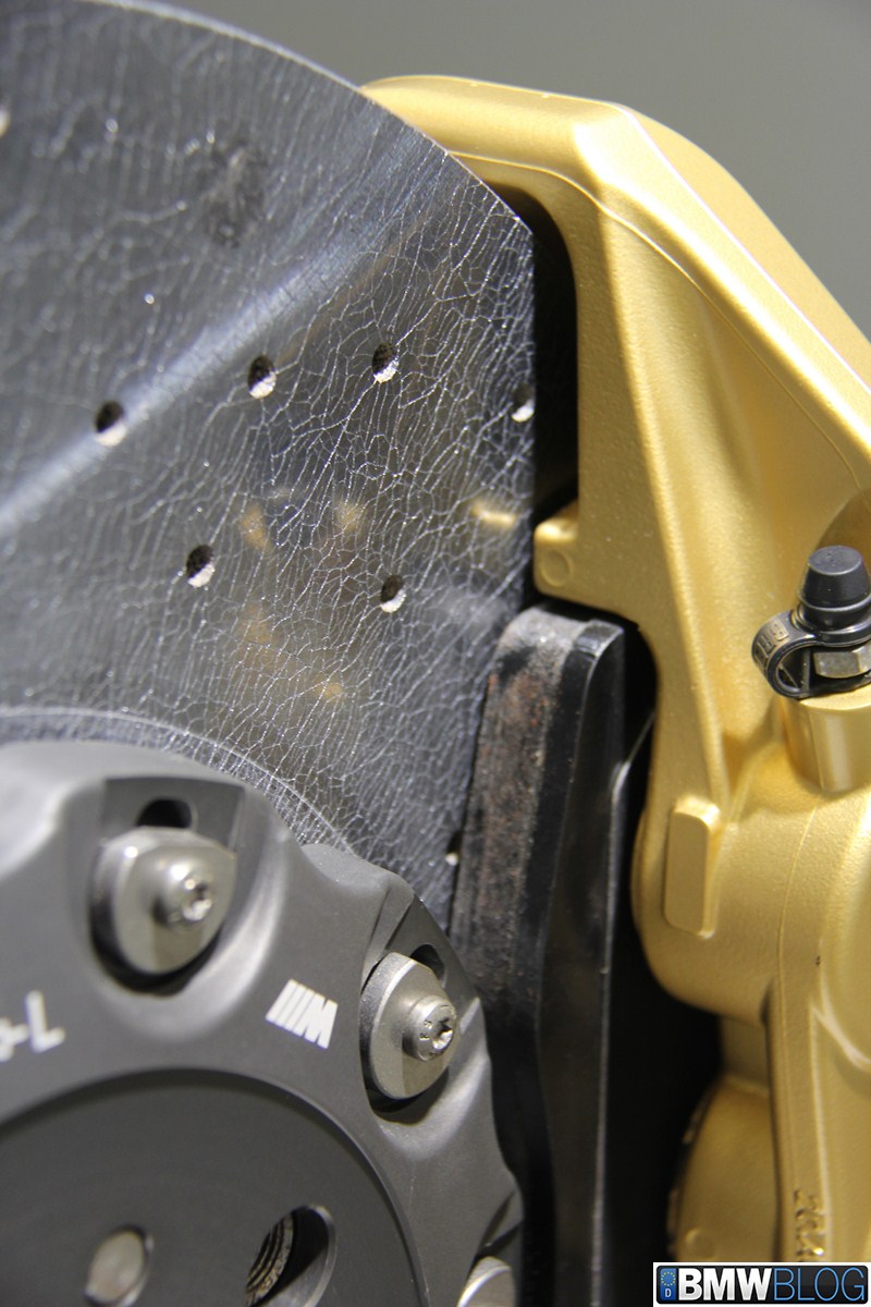The brake discs of the carbon ceramics are sourced from Brembro. These are laminated just as Porsche’s Carbon Ceramics are. The brake pads for BMW’s Carbon Ceramics, however, are SGL pads. SGL, partly owned by the Quandt family, makes the carbon ceramics in a joint venture with Brembo and SGL Group. The Carbon Ceramic Brakes are last 3-4 times longer than regular steel brakes in addition to their weight savings and increased braking force. The brake fluid is the same as steel brakes. In order to determine the wear of Carbon Ceramics, you have to weigh them. That’s right, the spec is not thickness but weight!
