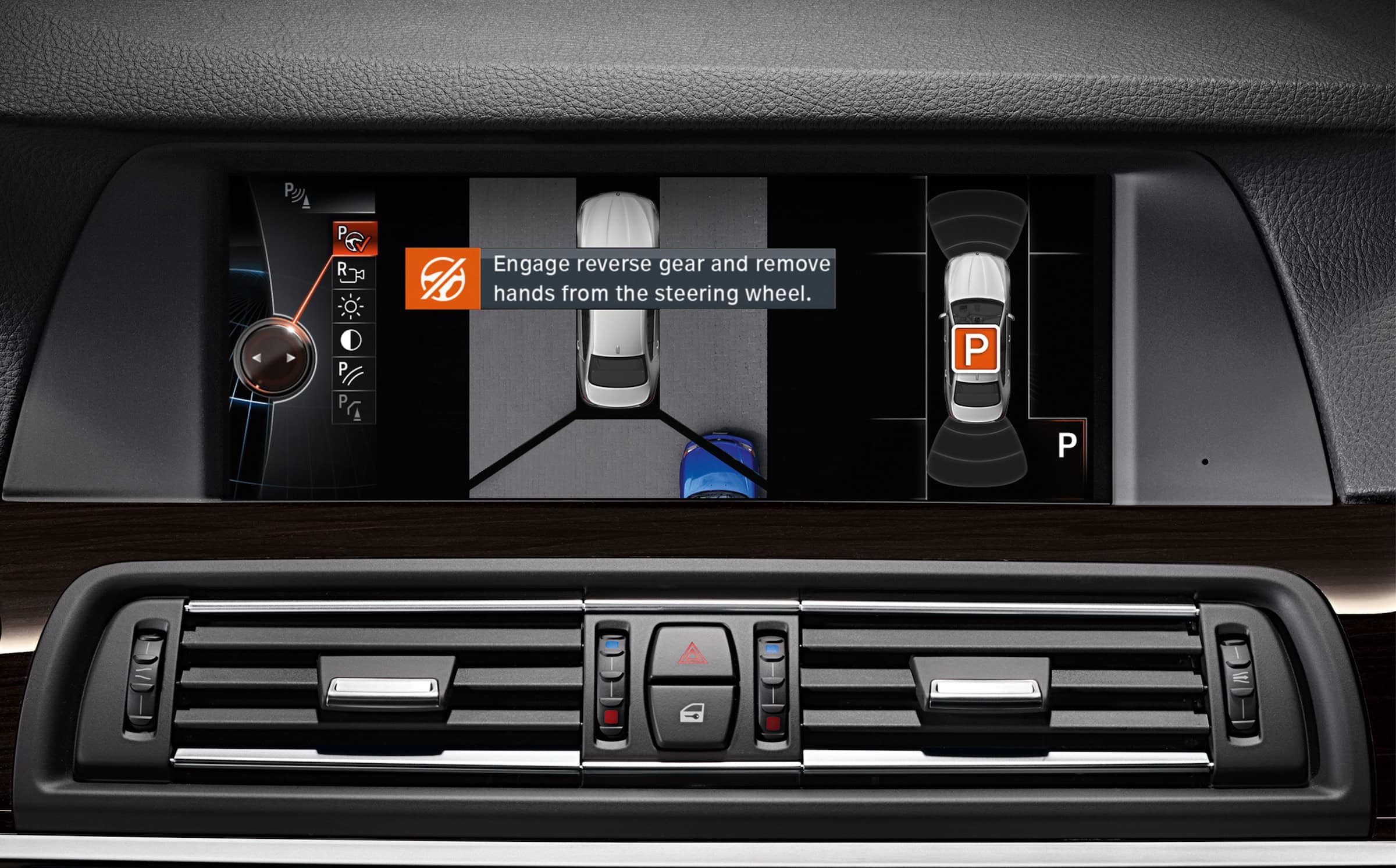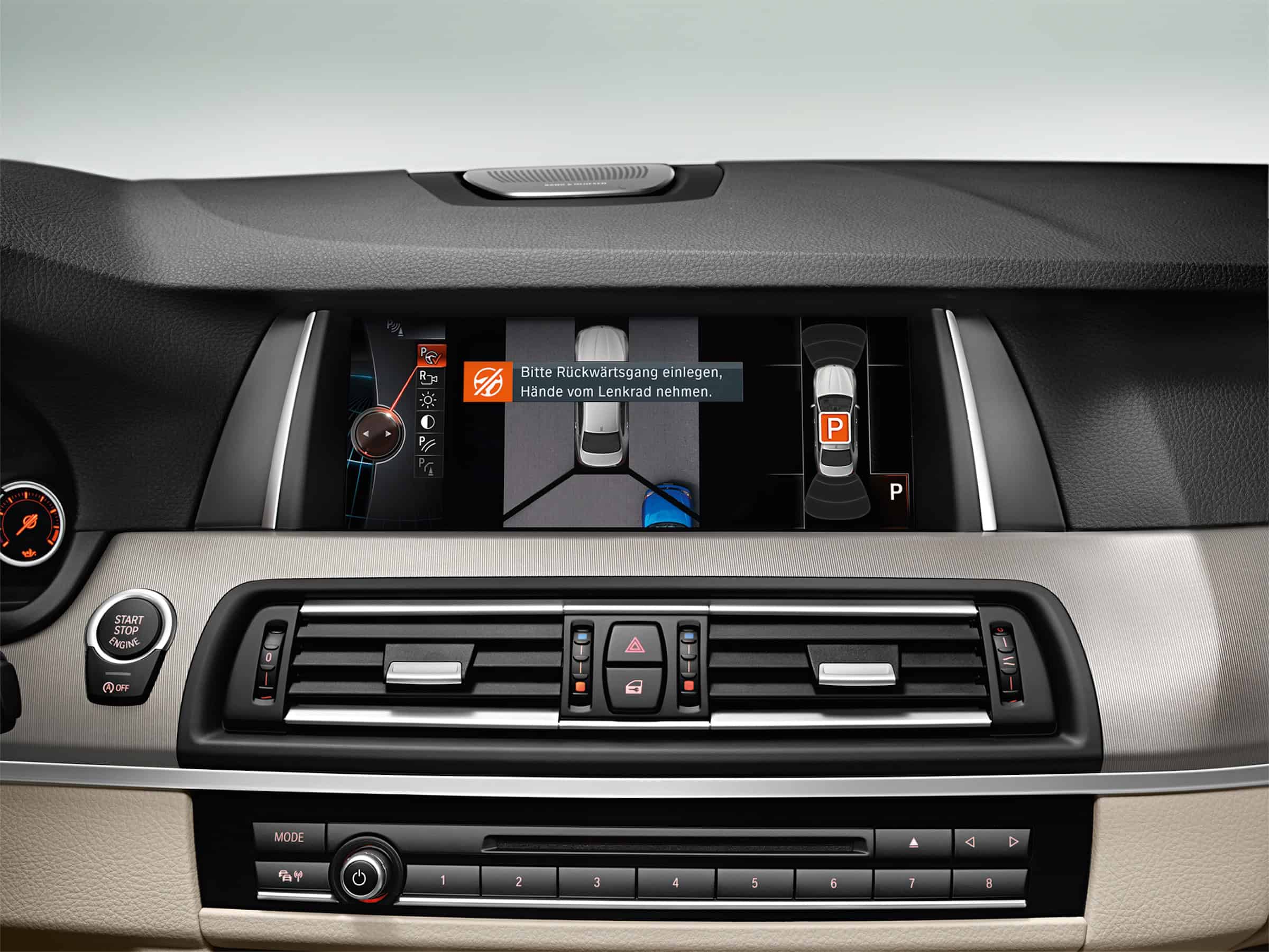 The fully automatic BMW Parking Assistant – which will be available for the first time from autumn 2013 – also boasts extended functionality. This system helps the driver to identify and drive into parking spaces positioned parallel to the road. The new version of the Parking Assistant not only carries out the steering movements required to reverse across into the parking space, it also controls the accelerator and brake pedal and selects the correct gear – all the driver has to do is activate the relevant turn signal indicator and hold down the Parking Assistant button, and the vehicle will glide fully autonomously into the parking space selected. The fully automatic Parking Assistant will be available for the BMW 5 Series Sedan and BMW 5 Series Touring from November 2013 and for the new BMW X5 from December 2013.
