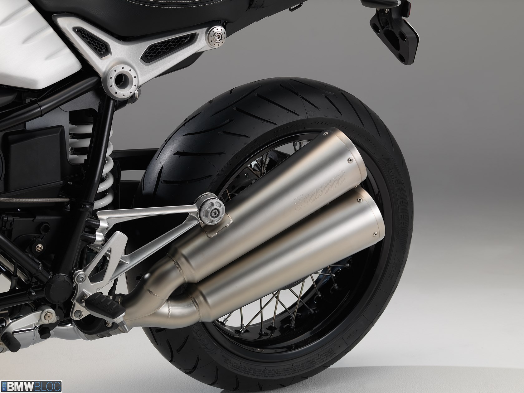 The exhaust system that runs down the left-hand side with two silencers placed one above the other is fully in keeping with the concept of a classic sporty roadster. There is room for customisation here too, courtesy of the BMW Motorrad accessory range. Adding a real touch of technical finesse to the nineT, for instance, is the Akrapović unit made of titanium. By fitting a short or long connecting pipe, the silencer can furthermore be mounted in either a lowered or a raised position, radically altering the appearance and character of the nineT.