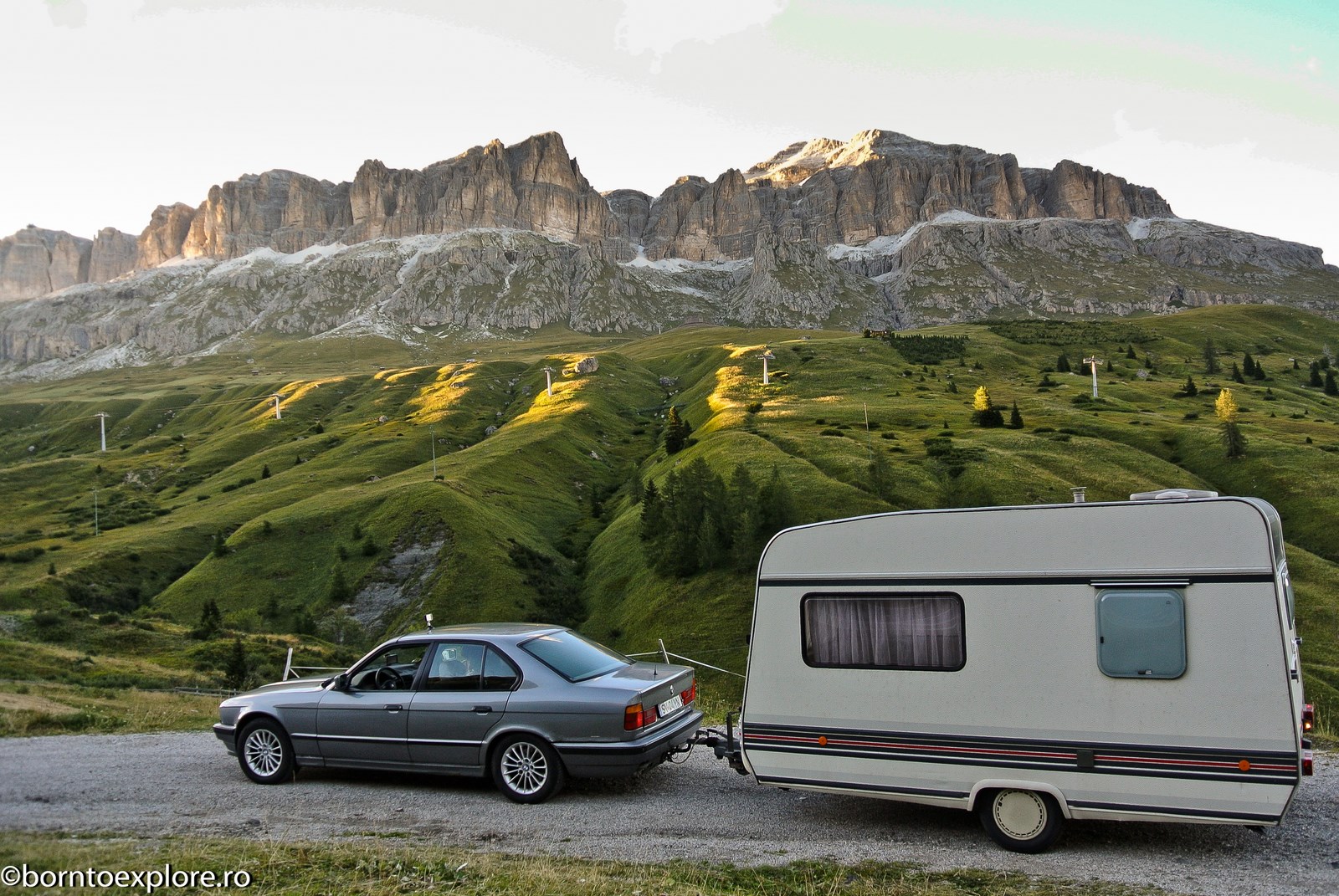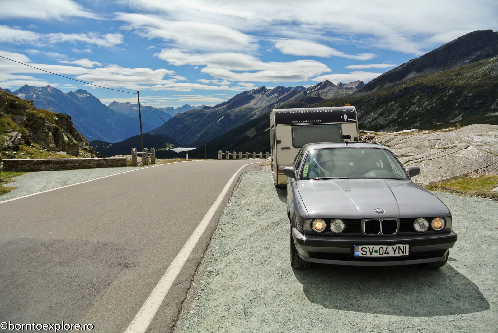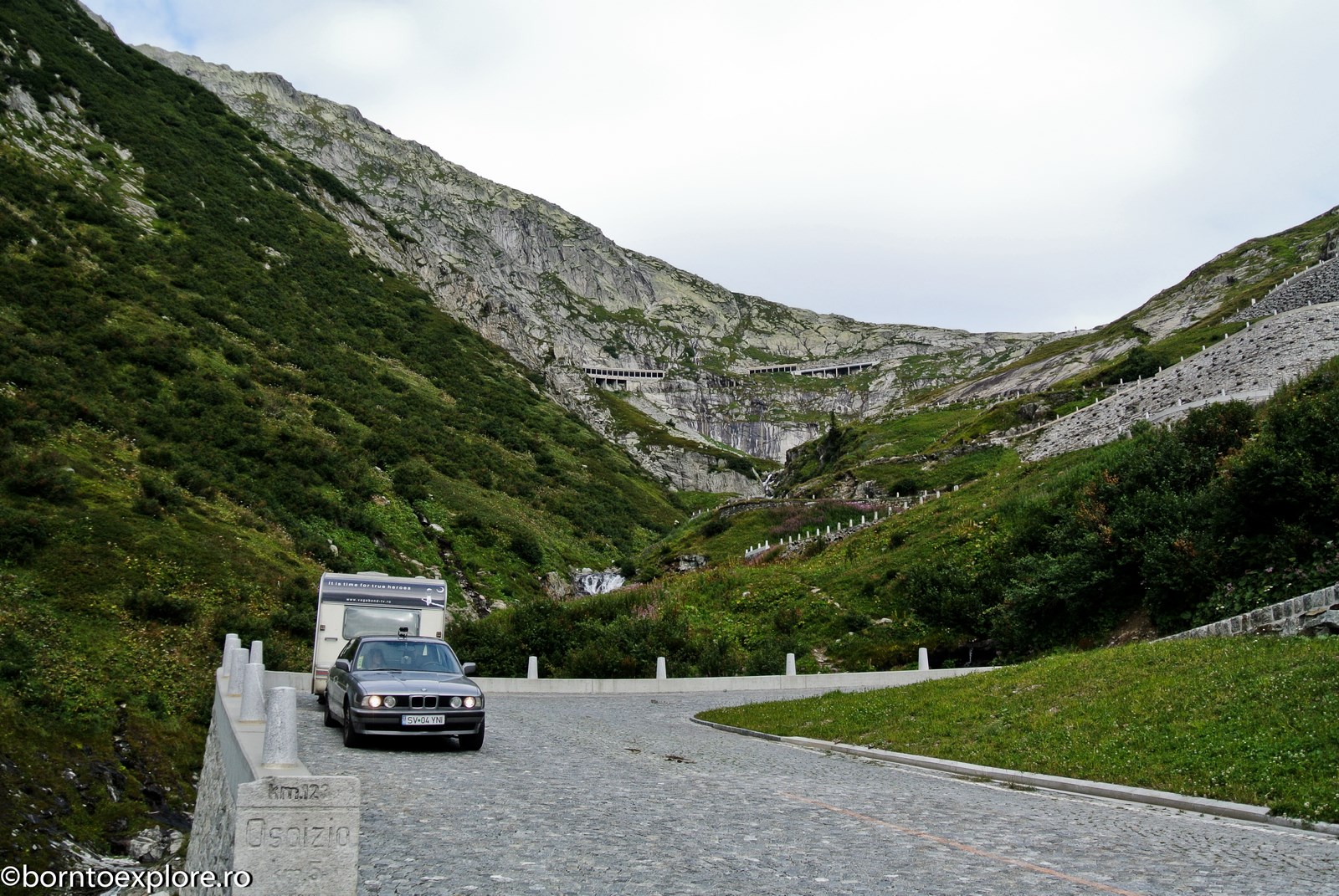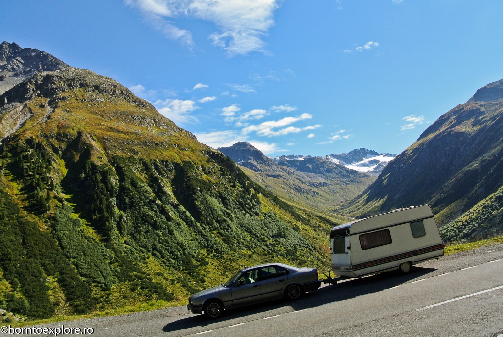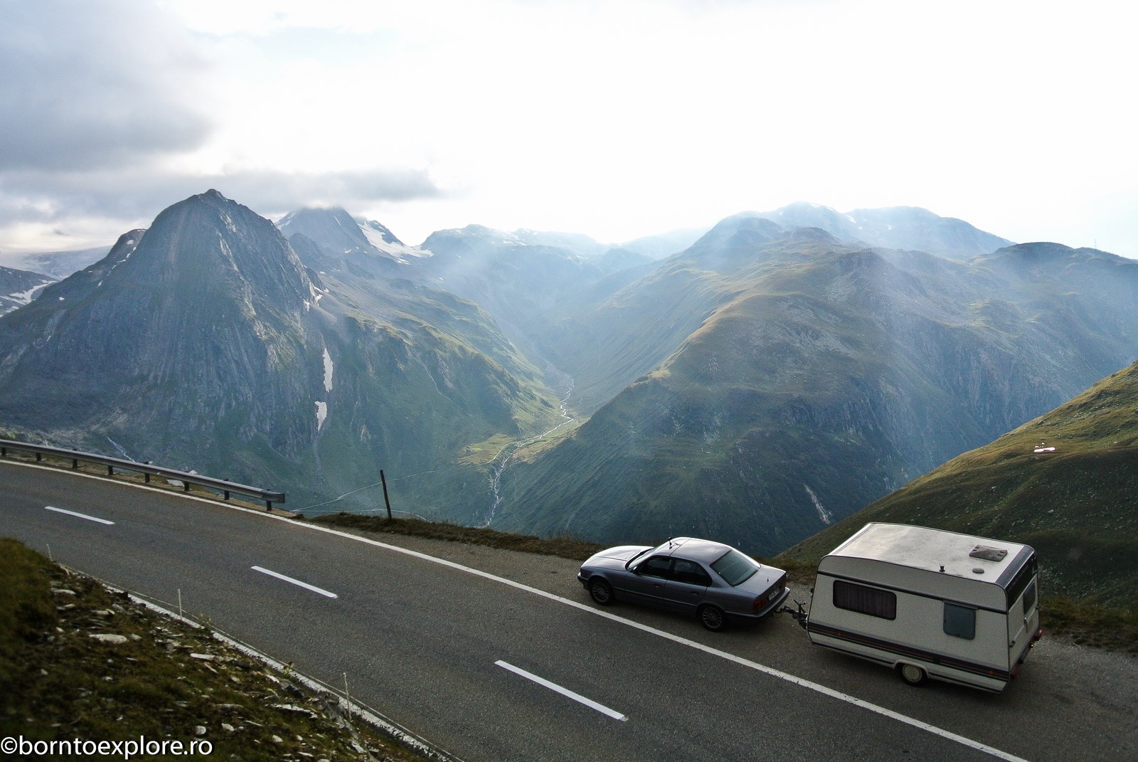 Perhaps you are wondering how the experience was as a driver and which was the most beautiful step. I’ll start by mentioning that I am a fan of gas engines and that although this route is accessible to any car, towing a caravan can make the difference between a very pleasant experience, in which you always have the taste of freedom and a terrible one. There are many hairpin curves and steep slopes and since I stopped many times uphill, sometimes just for taking pictures, I felt how important it is to have 192 horse power that pull stronger, if only encouraged. An inappropriate engine might have stirred the whole thing, but it would have been stuck at shifting from bottom gear into the higher gear, all in a roar of overspeed and clutch smell. The old E34 left each time without any problem, climbing most of the passes in second gear without ever exceeding 3500 rpm, even in the most difficult sectors. This is what the whole experience was like, equal to a pleasant stroll along the most beautiful roads of Europe.