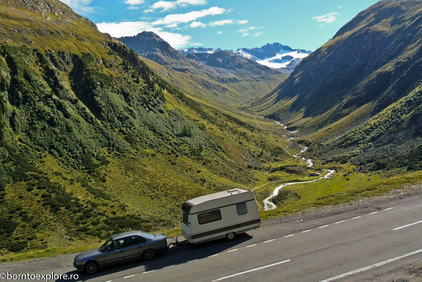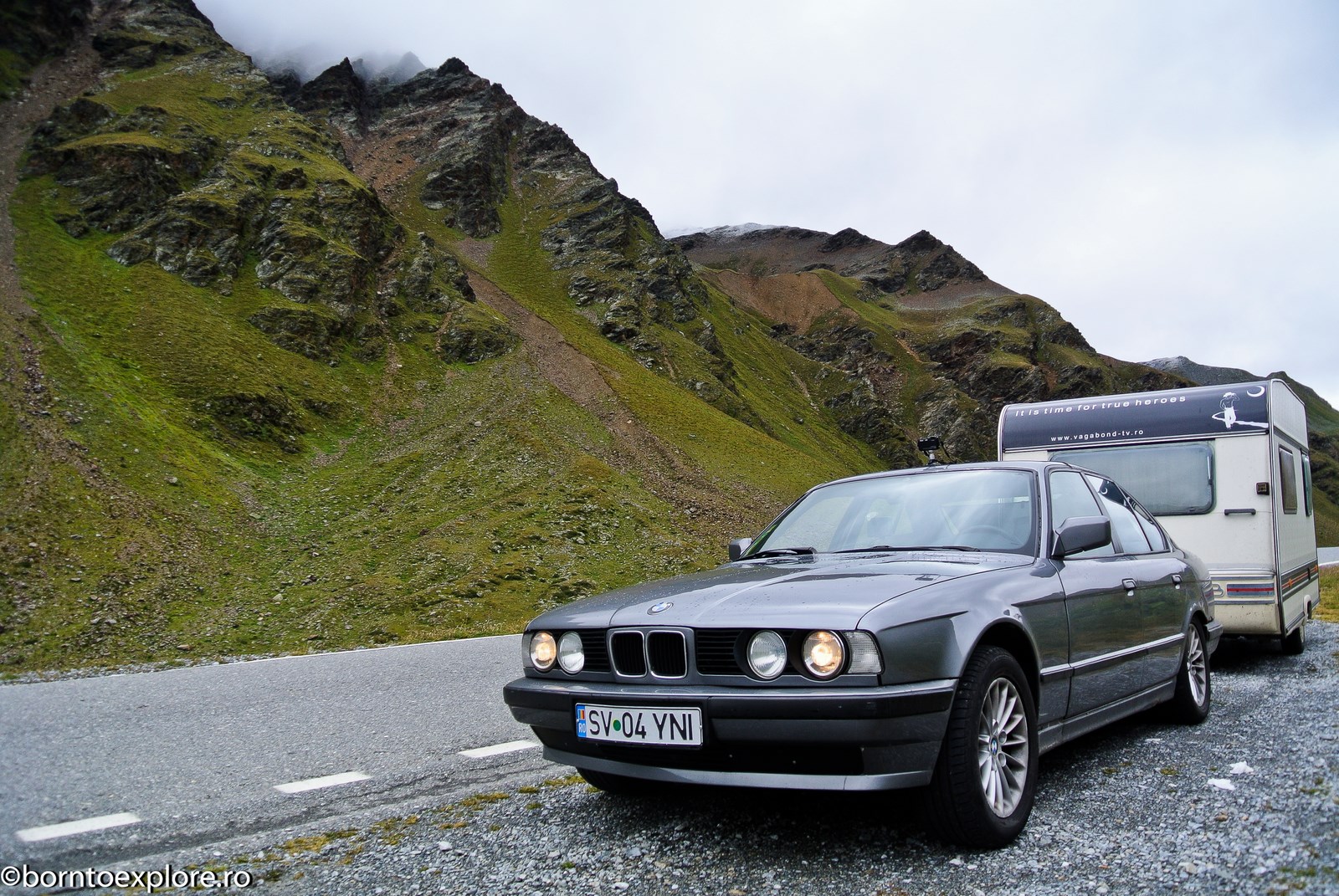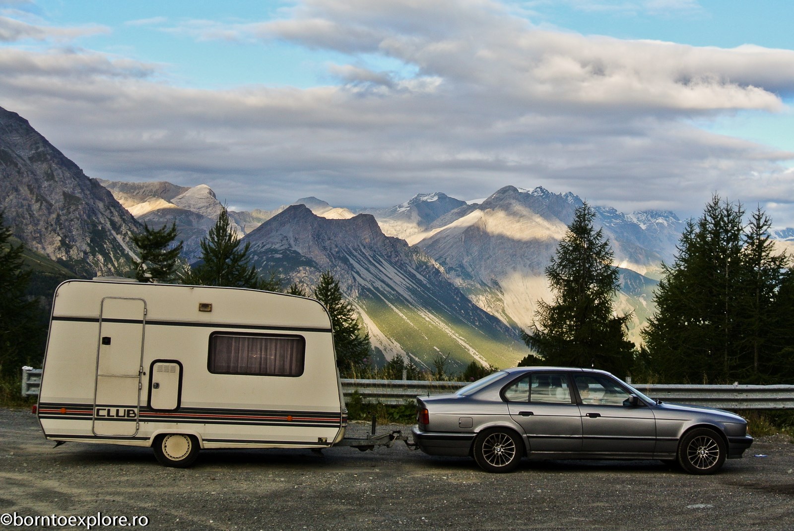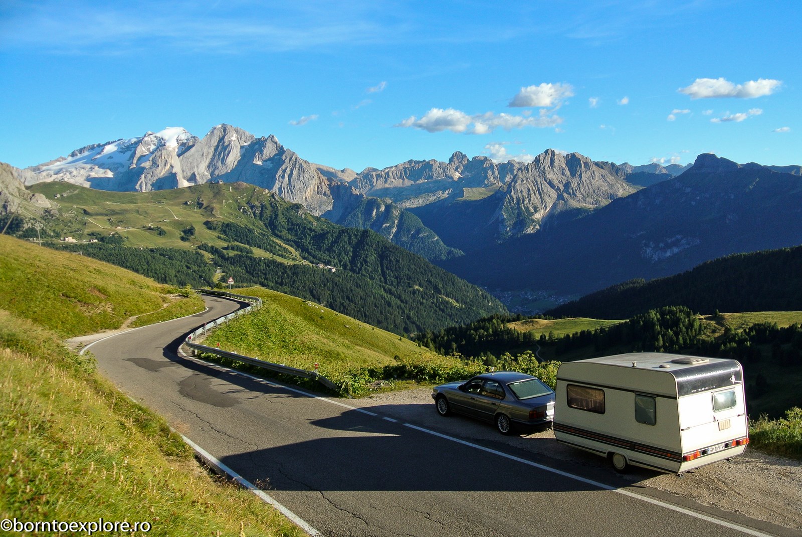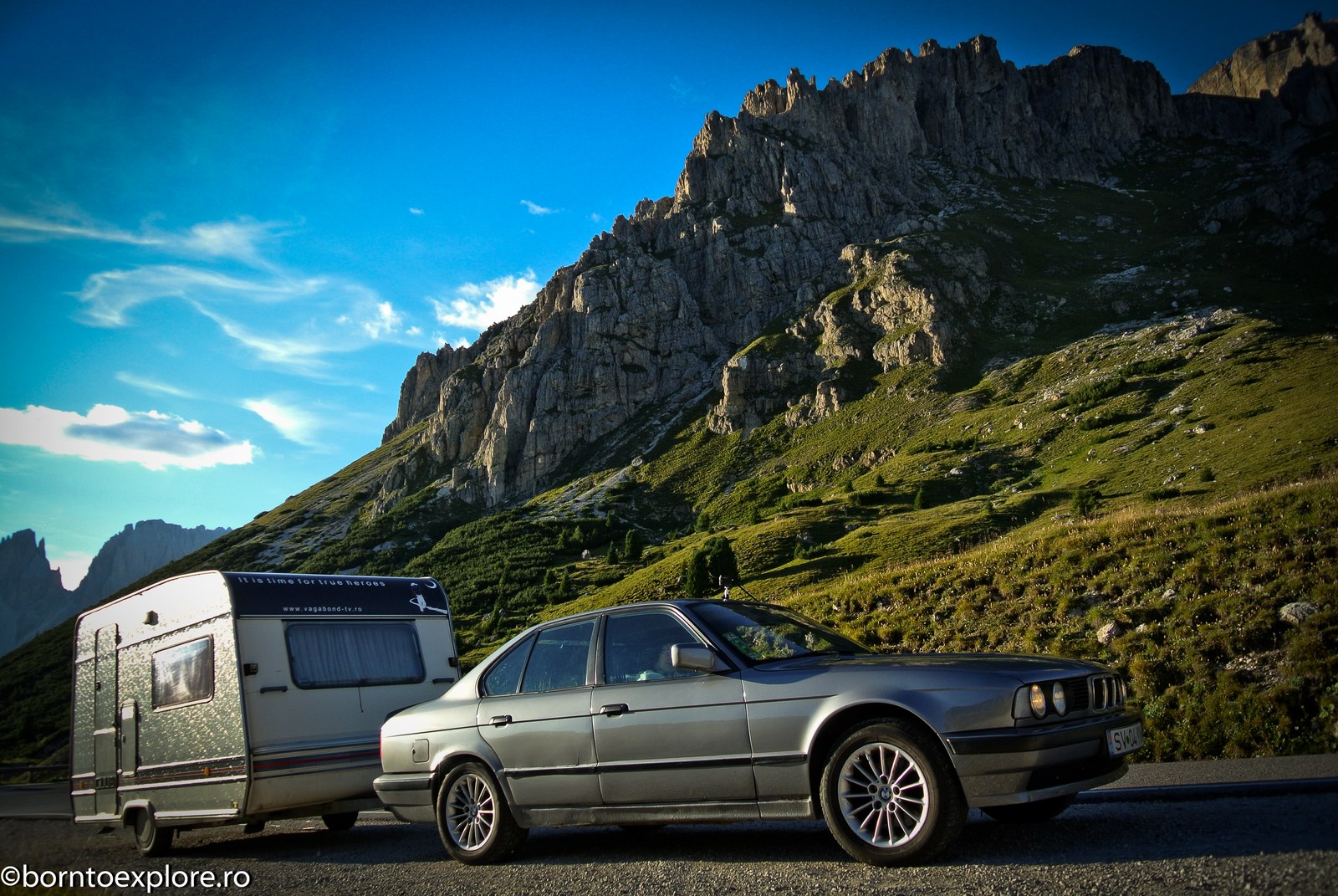 Perhaps you are wondering how the experience was as a driver and which was the most beautiful step. I’ll start by mentioning that I am a fan of gas engines and that although this route is accessible to any car, towing a caravan can make the difference between a very pleasant experience, in which you always have the taste of freedom and a terrible one. There are many hairpin curves and steep slopes and since I stopped many times uphill, sometimes just for taking pictures, I felt how important it is to have 192 horse power that pull stronger, if only encouraged. An inappropriate engine might have stirred the whole thing, but it would have been stuck at shifting from bottom gear into the higher gear, all in a roar of overspeed and clutch smell. The old E34 left each time without any problem, climbing most of the passes in second gear without ever exceeding 3500 rpm, even in the most difficult sectors. This is what the whole experience was like, equal to a pleasant stroll along the most beautiful roads of Europe.