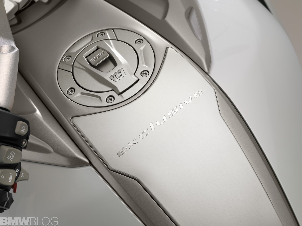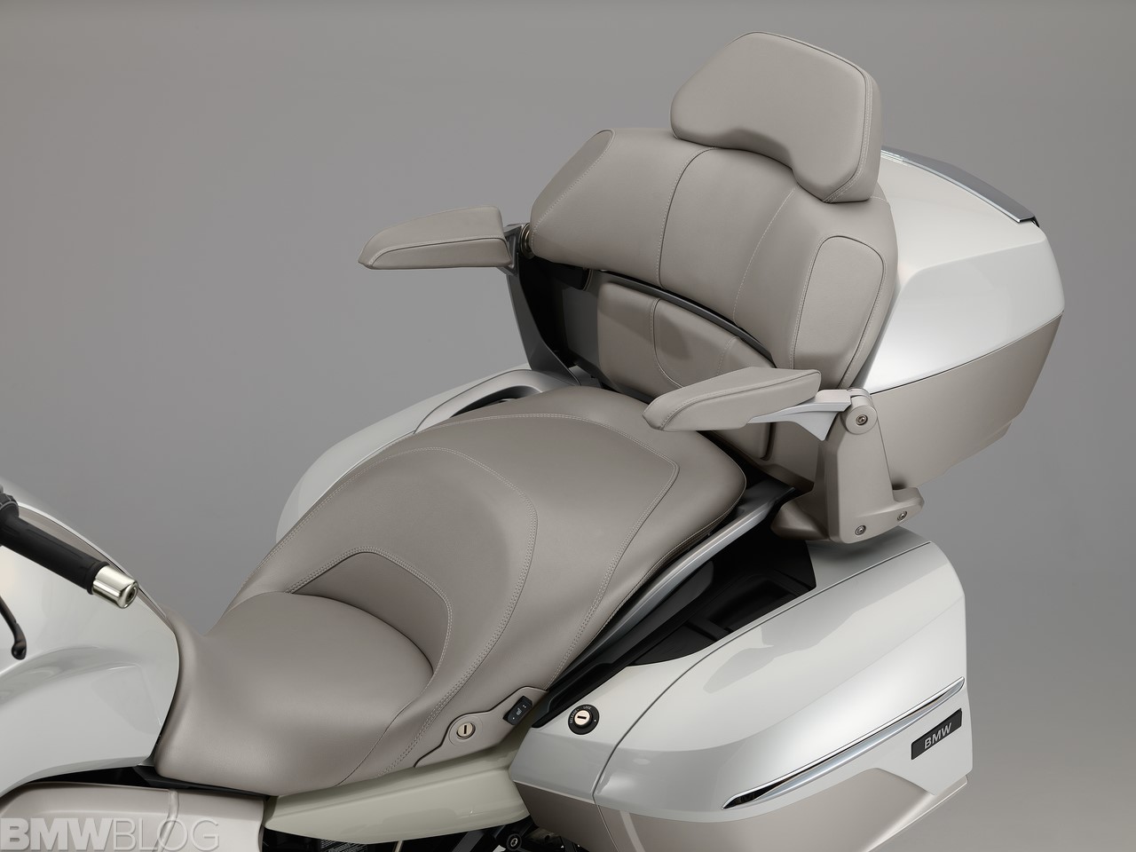 The colour scheme for the new K 1600 GTL Exclusive adds to the sense of elegance and aesthetic appeal. The bodywork’s four-coat paint finish in Mineral white metallic high gloss combines to striking effect with the classy chrome surfaces, the contrasting shade of Magnesium metallic matt and the Glacier silver metallic radiator fins. The colour-coordinated upholstery for the seat cushions, backrest and pillion passenger armrests adds the perfect finishing touch.