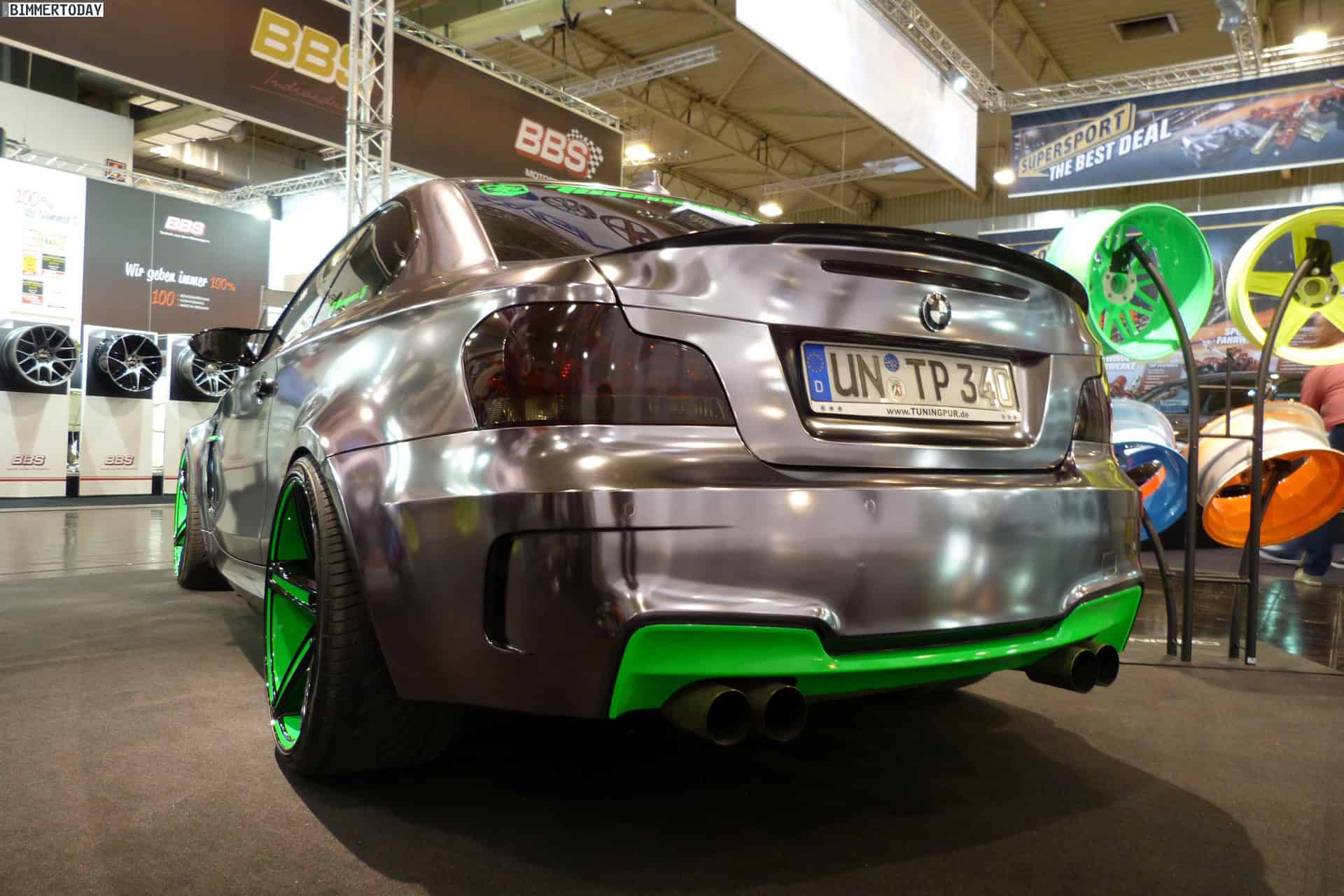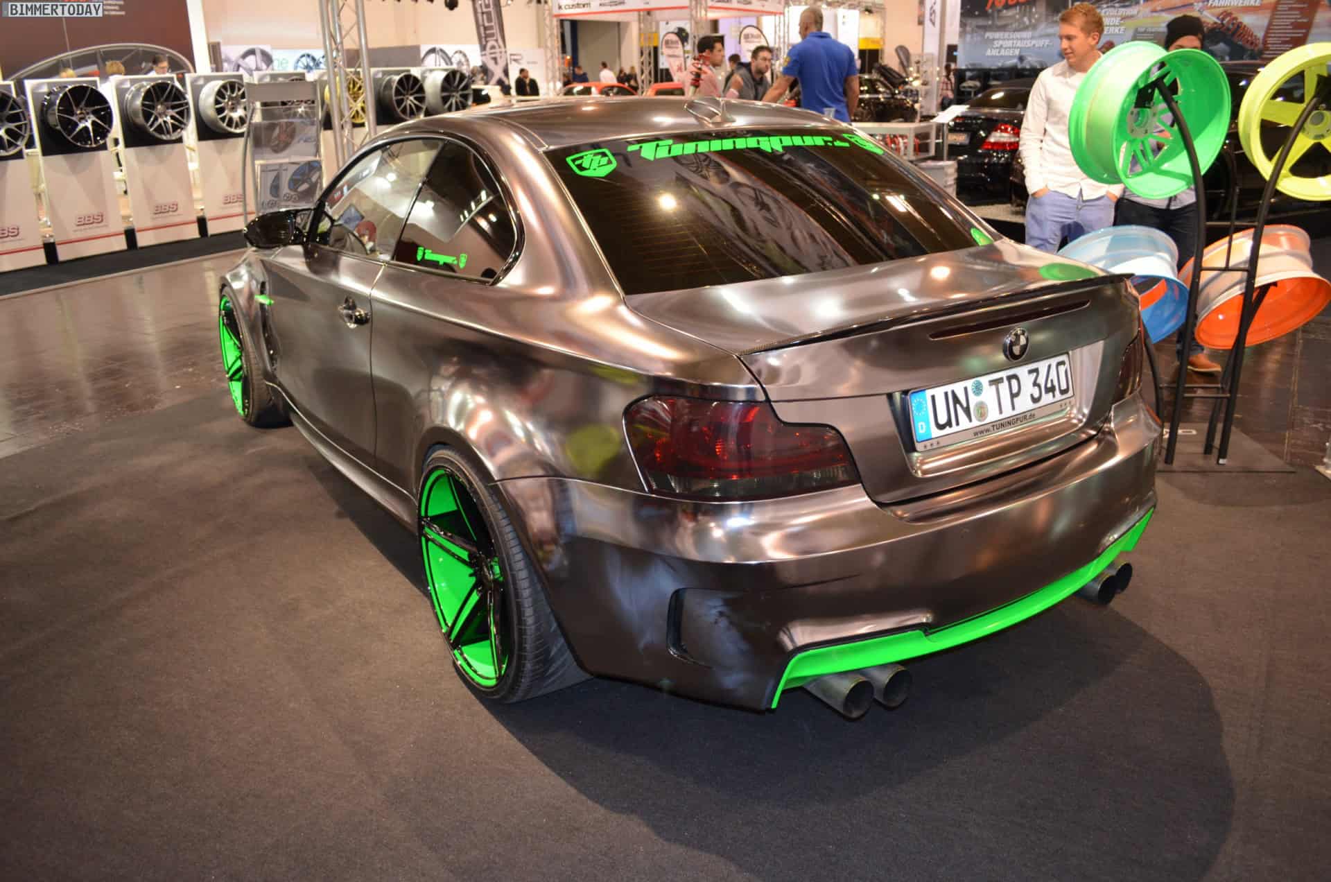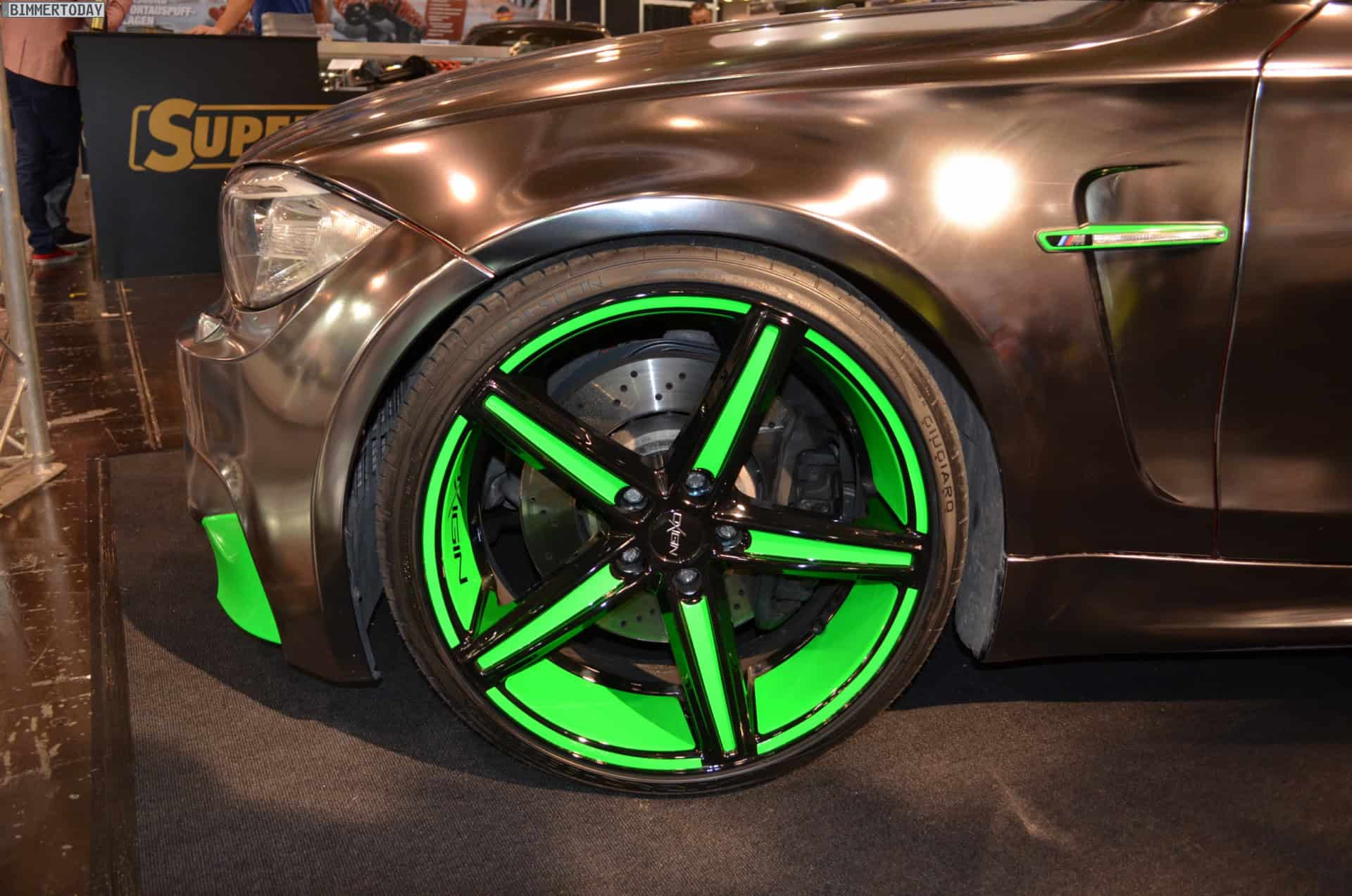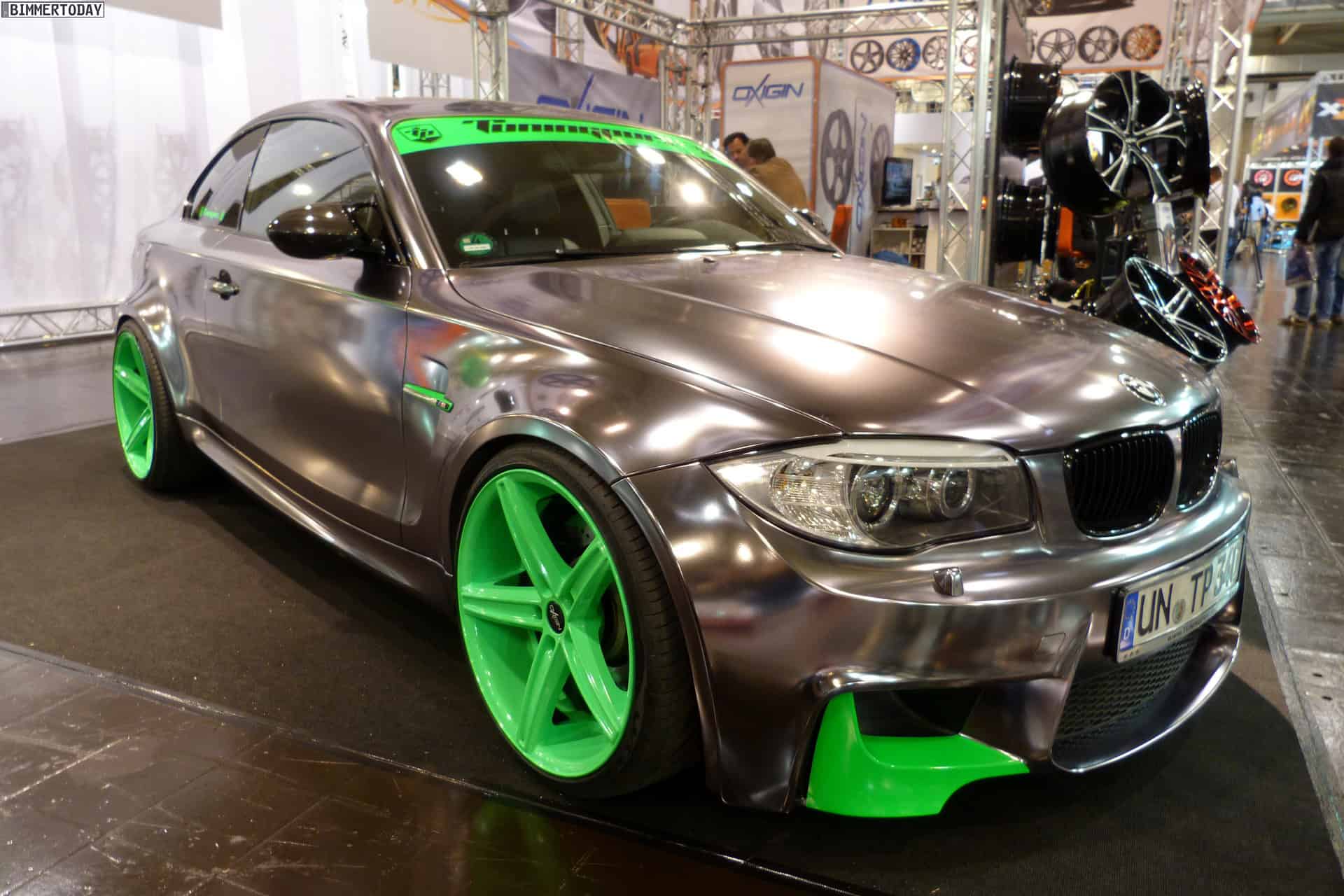 At the 2013 Essen Motor Show, one vehicle stands out in the crowd of super tuned up and modded BMWs: a chrome 1M with green accents. The fellows at Oxigin/Tuningpur draw attention with the chrome wrapped 1M which comes with neon green elements at the front and rear aprons, side gills and wheels.