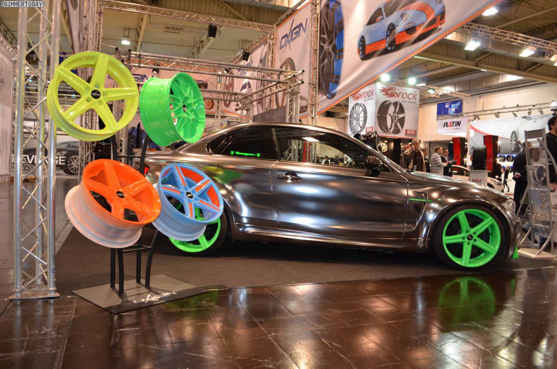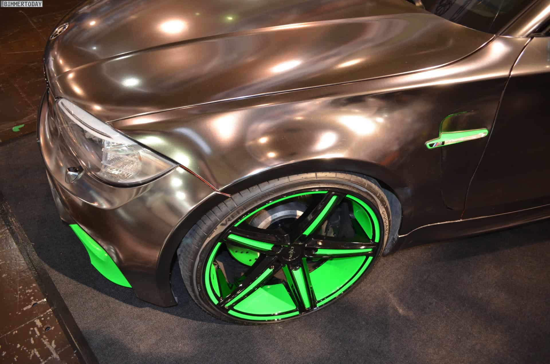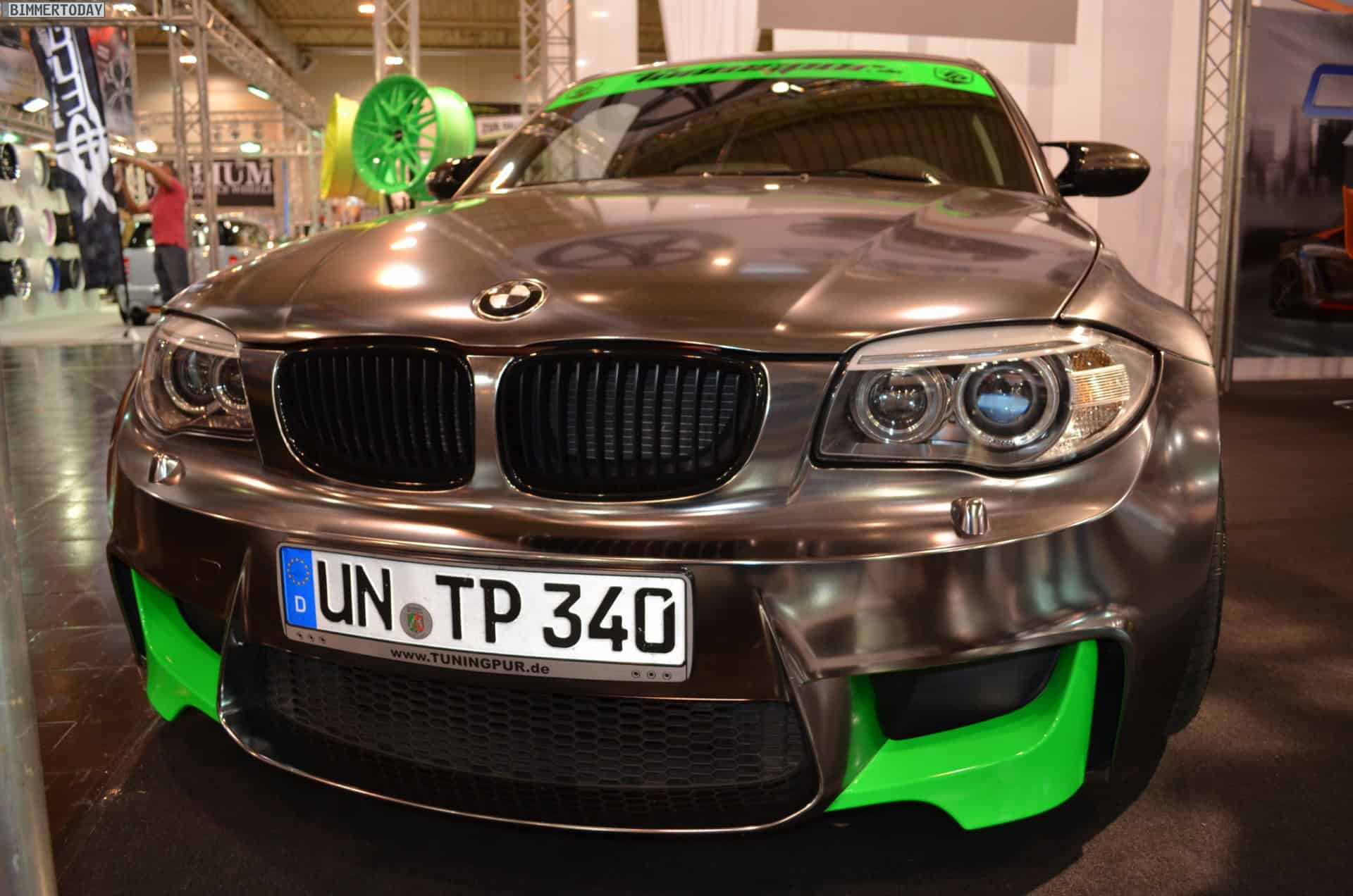 At the 2013 Essen Motor Show, one vehicle stands out in the crowd of super tuned up and modded BMWs: a chrome 1M with green accents. The fellows at Oxigin/Tuningpur draw attention with the chrome wrapped 1M which comes with neon green elements at the front and rear aprons, side gills and wheels.