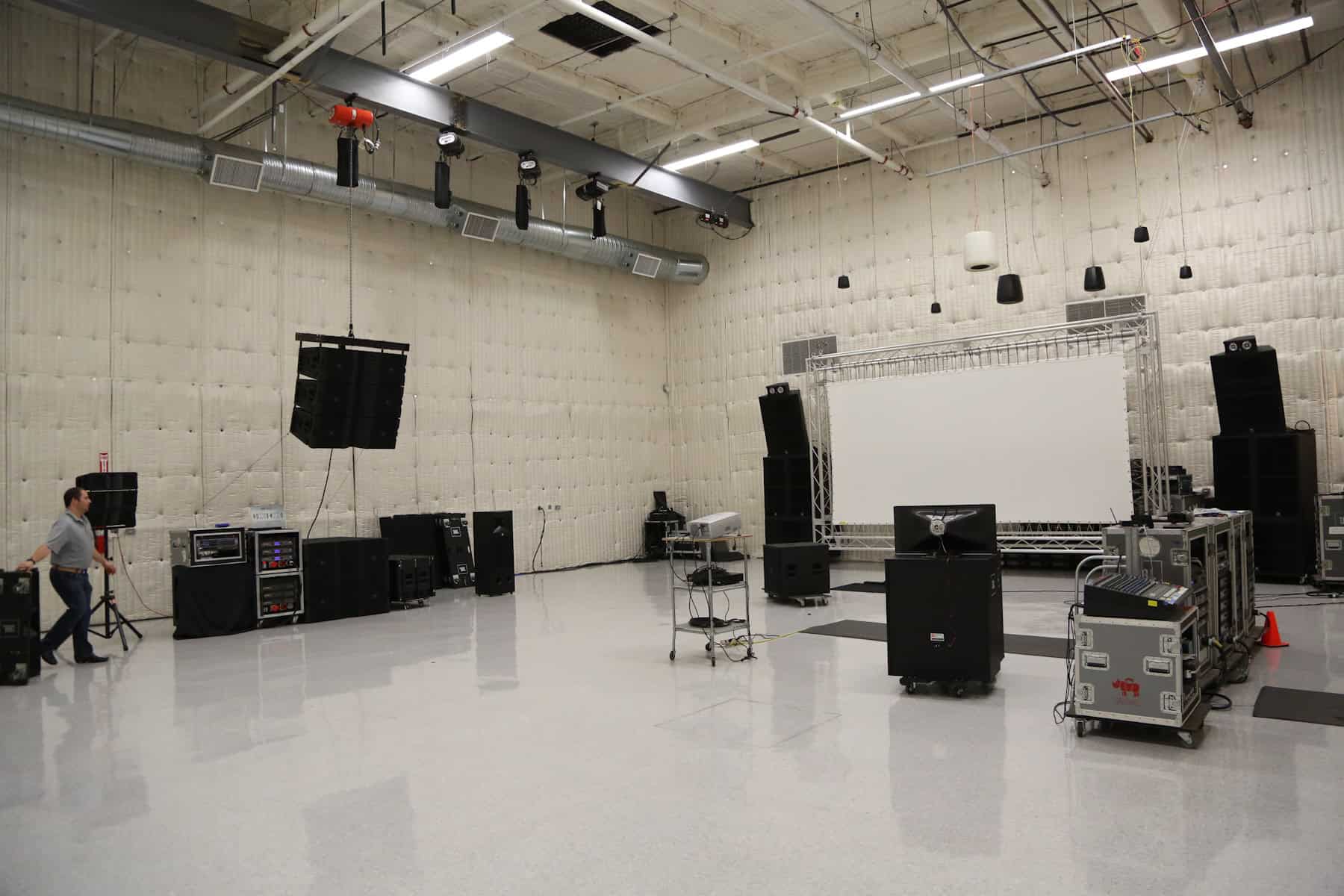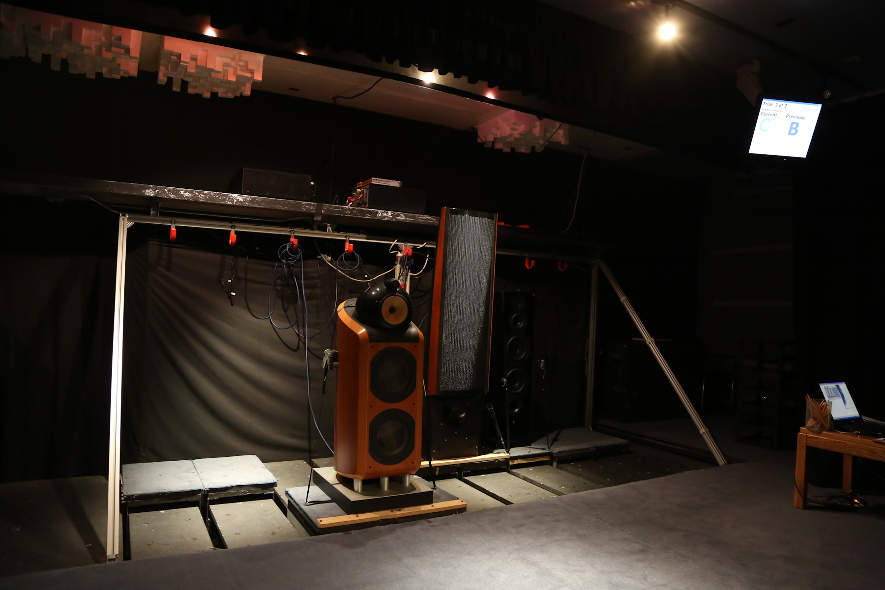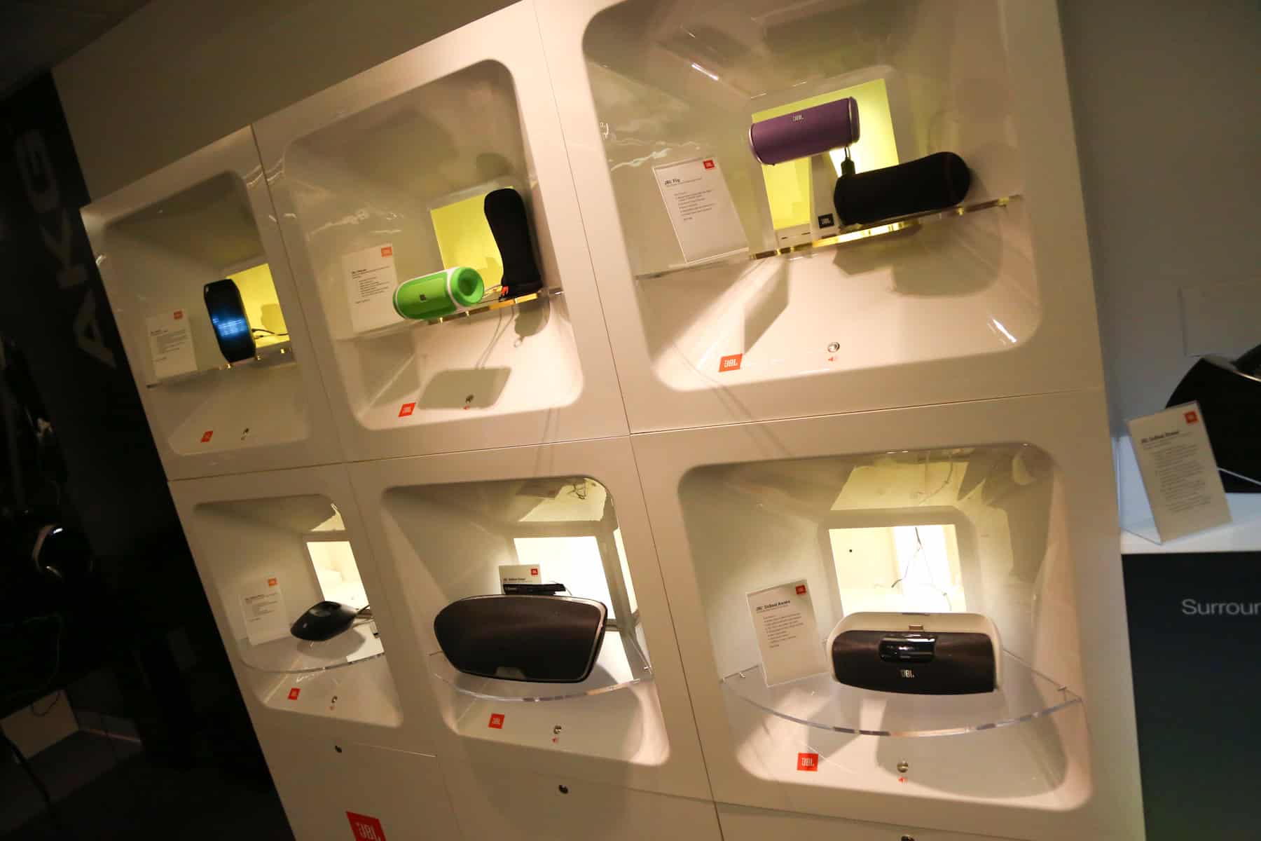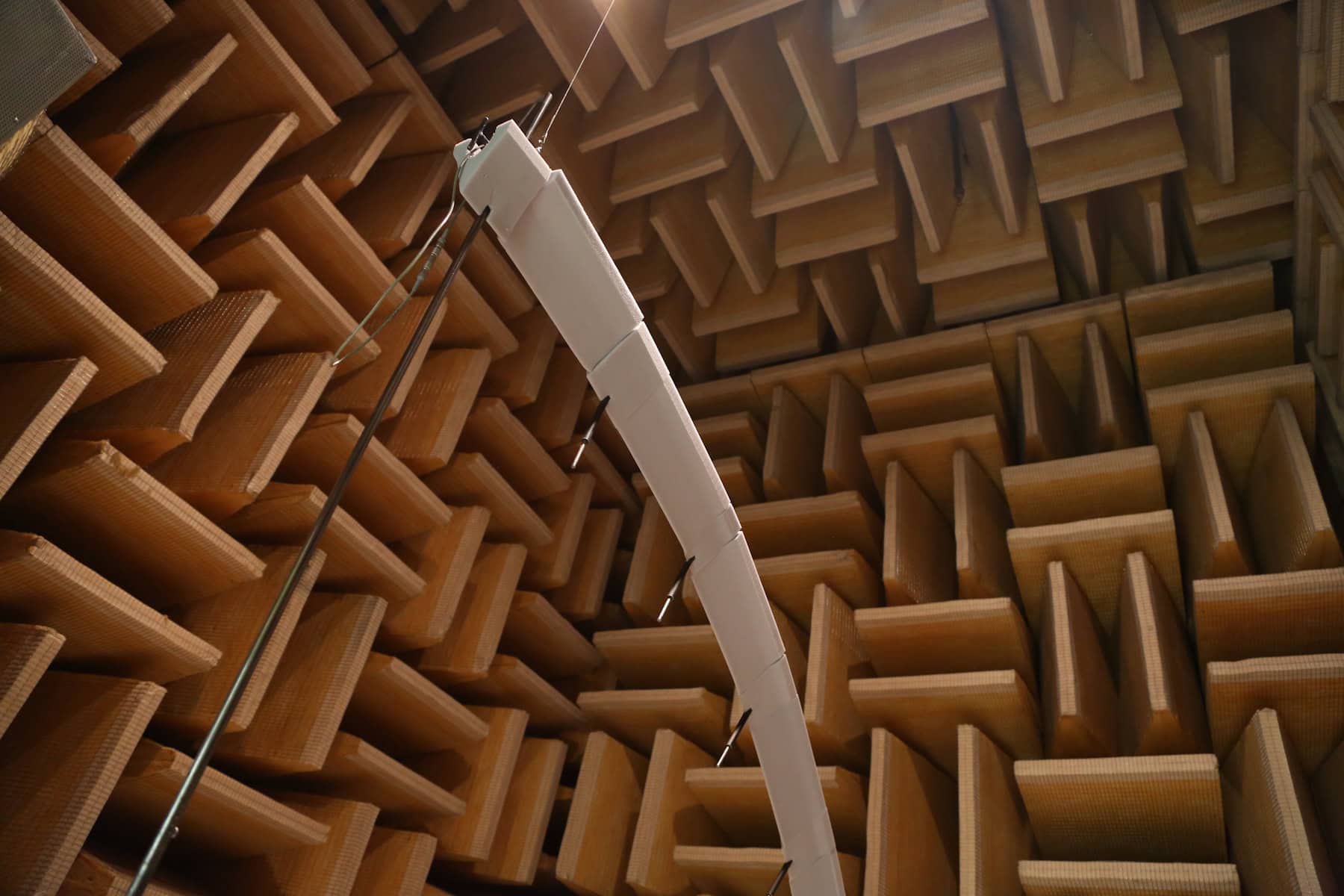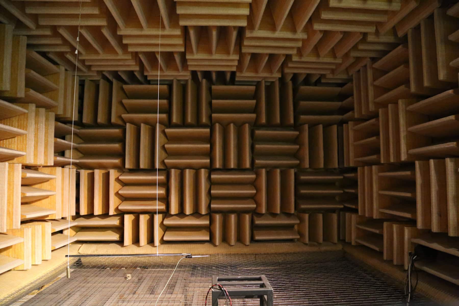 A tour of the Harman laboratory revealed quiet rooms built specifically for sound testing – and at great cost. The walls are coated in foam protrusions designed to absorb and arrest sound waves. Even the floor is coated in this foam labyrinth; I was guided into the room on a wire-mesh gangway elevated floor. So elaborate, so thorough is their testing that Harman’s quiet rooms are built separate from the building complex, essentially floating as an island surrounded by the building complex – thus avoiding even the slightest testing interference from faint vibrations traveling through the adjoining walls and floors.