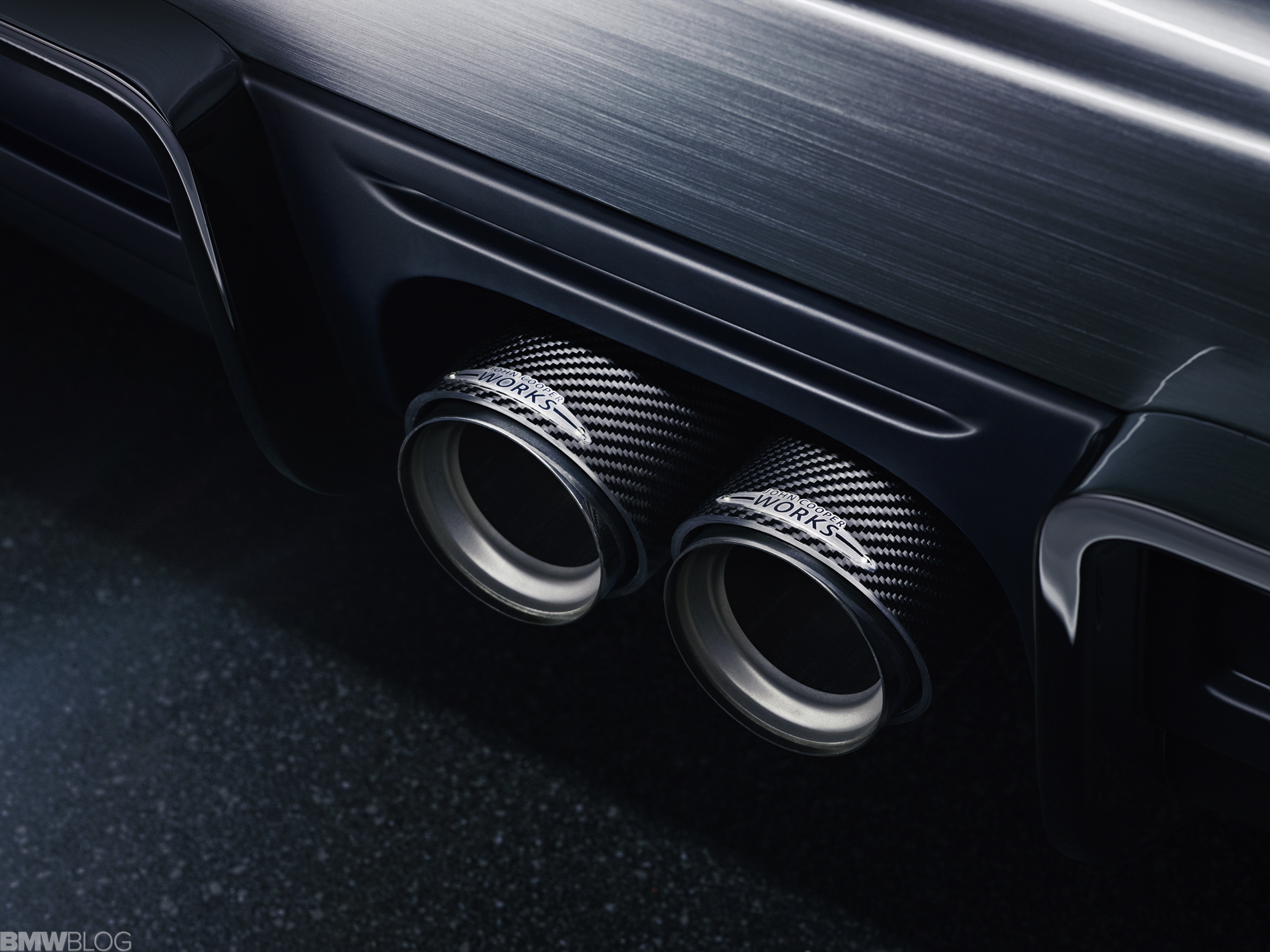 A further nod to the concept car’s impressive sporting focus can be found in the centre of the rear apron. The MINI John Cooper Works Concept is fitted with a sports exhaust system including John Cooper Works silencer system, and the striking twin tailpipes with chrome finish also carry the John Cooper Works logo. With the new elite sports model destined to benefit from further development, these features suggest its enticingly sporting aura will not be restricted to visual features: an unmistakable engine soundtrack promises to share centre stage.