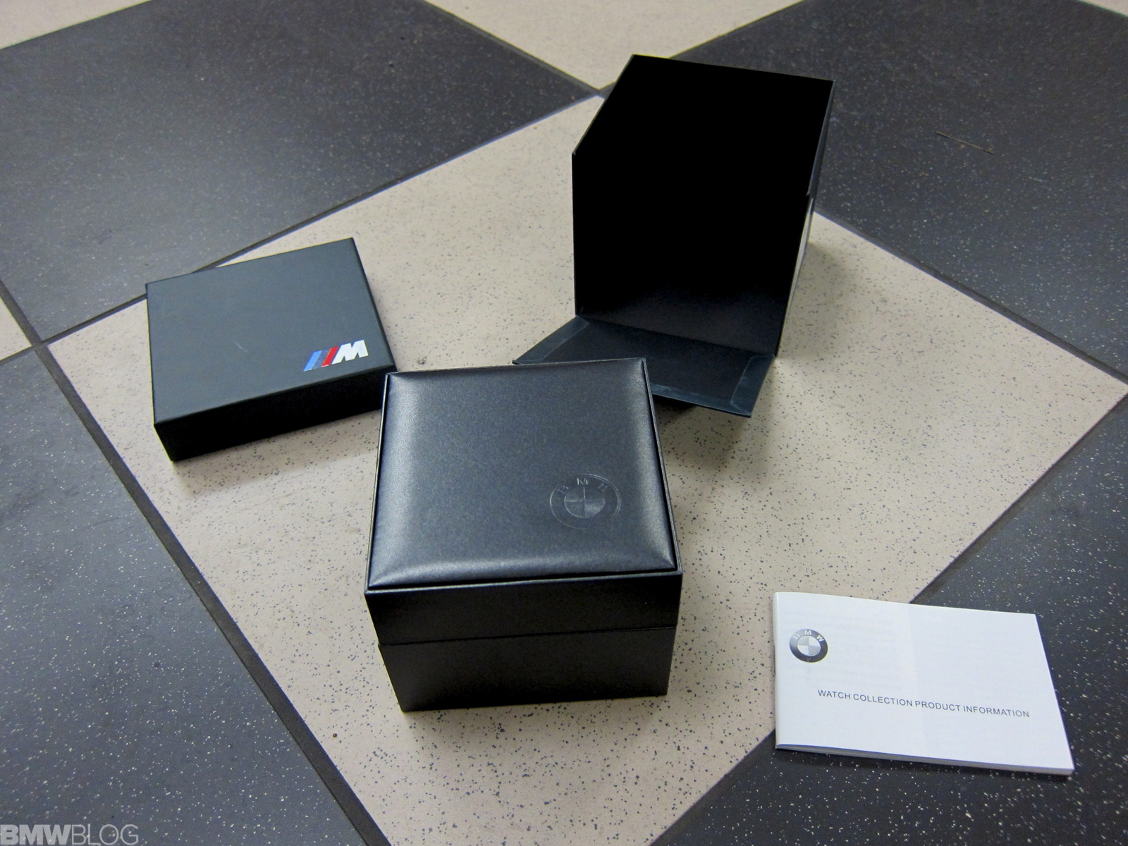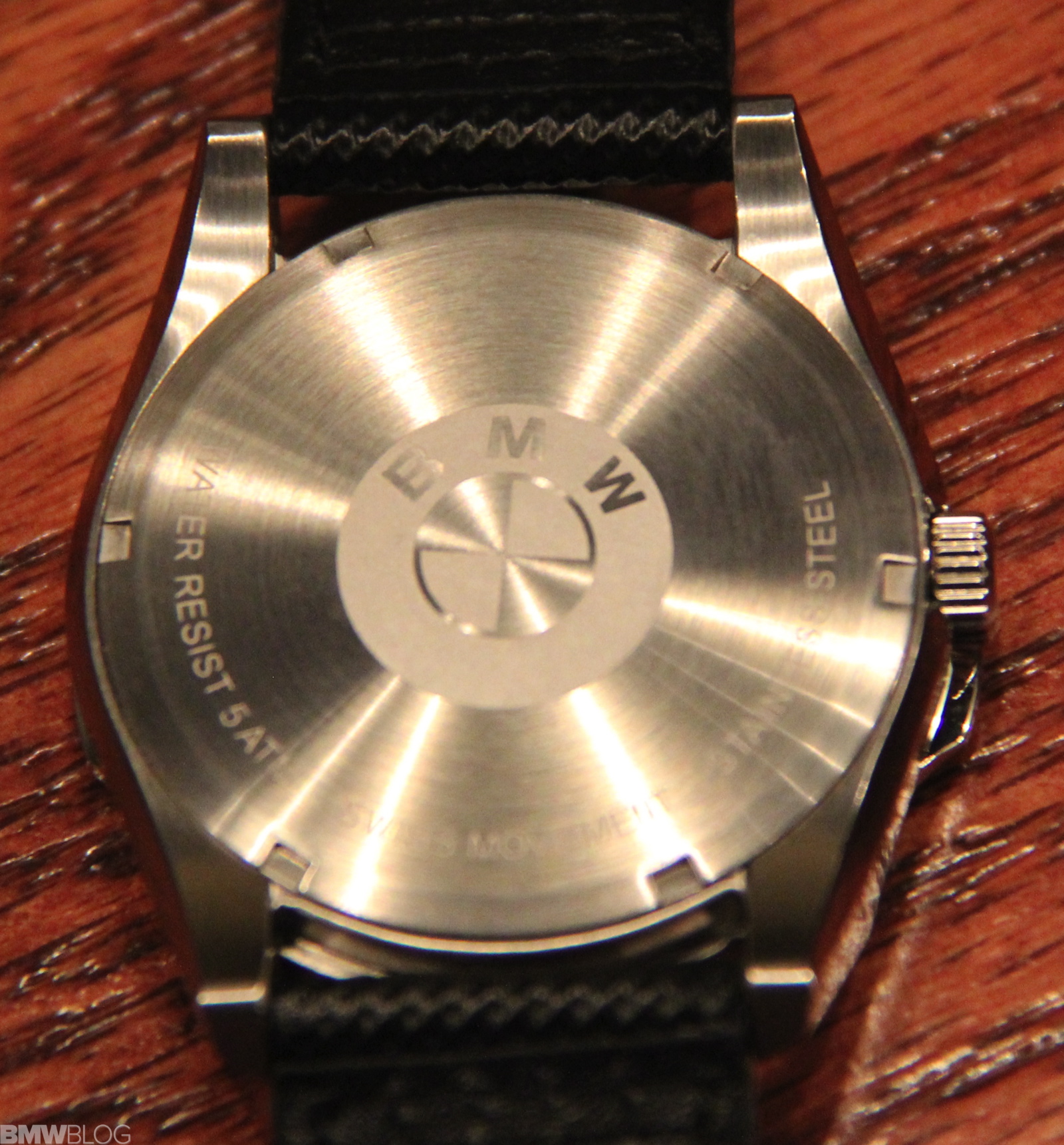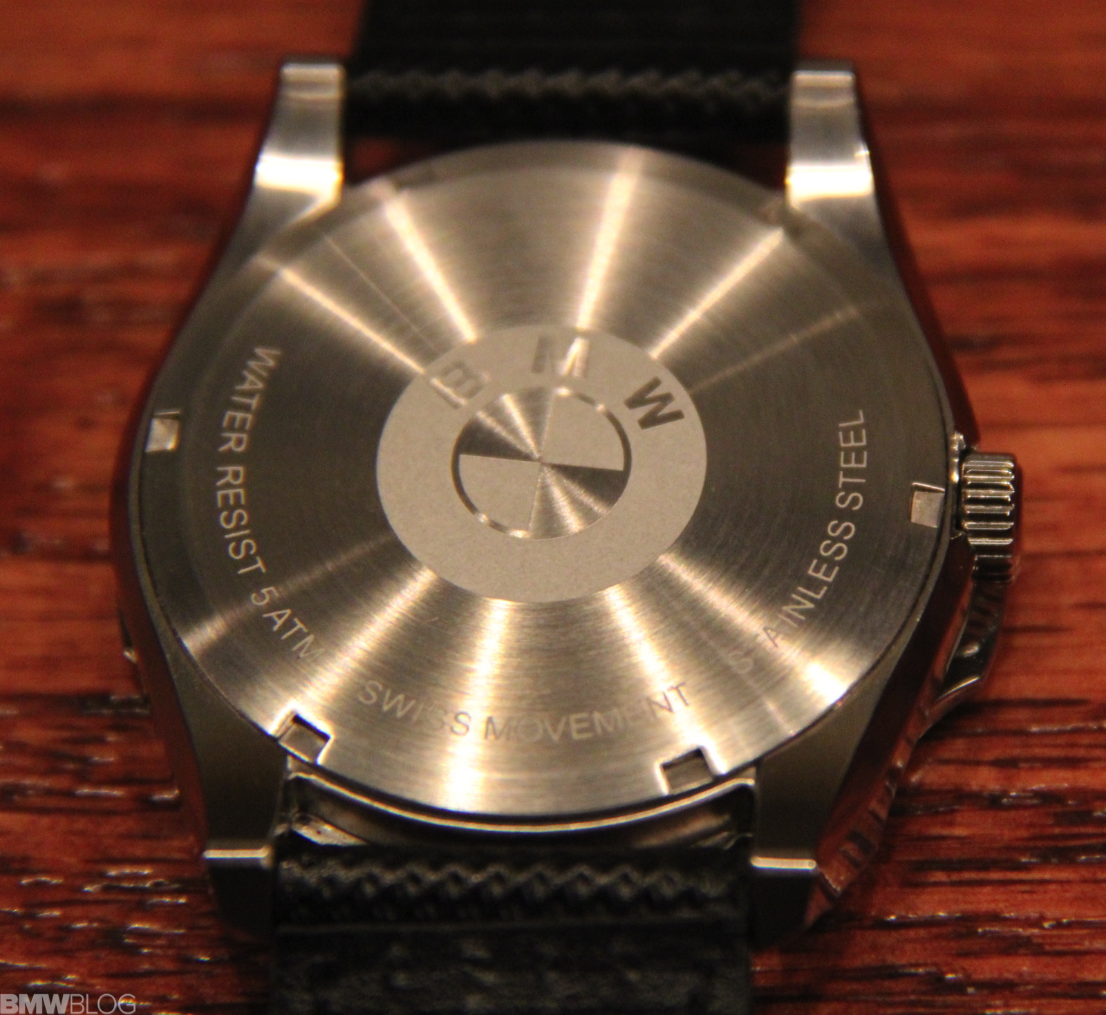 In the center of the back case, the watch has BMW etched in a circular pattern surrounding their familiar propeller. Also stamped on the back edge of the watch along the outside edge is “WATER RESIST TO 5 ATM SWISS MOVEMENT STAINLESS STEEL.”