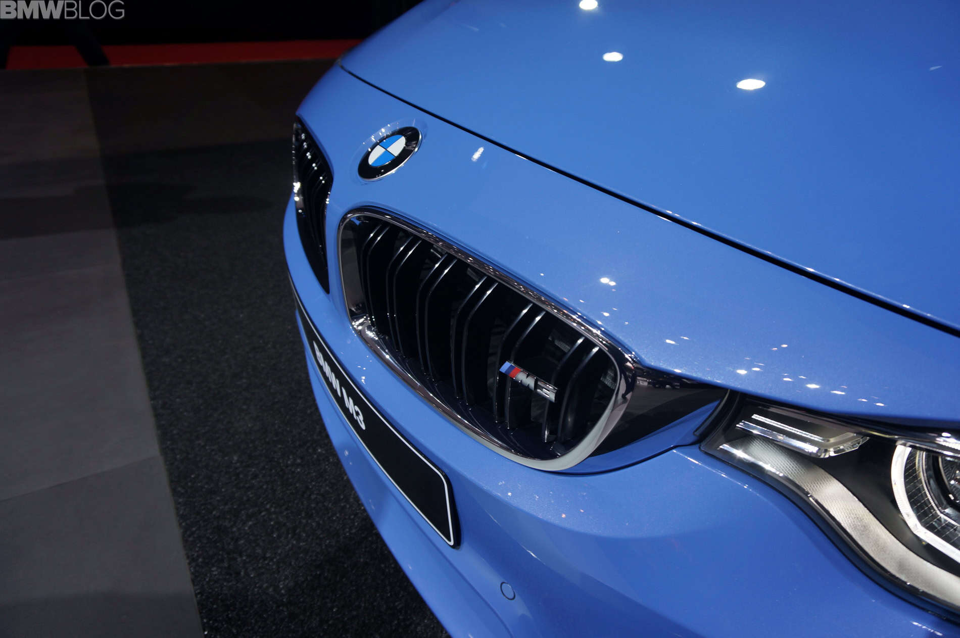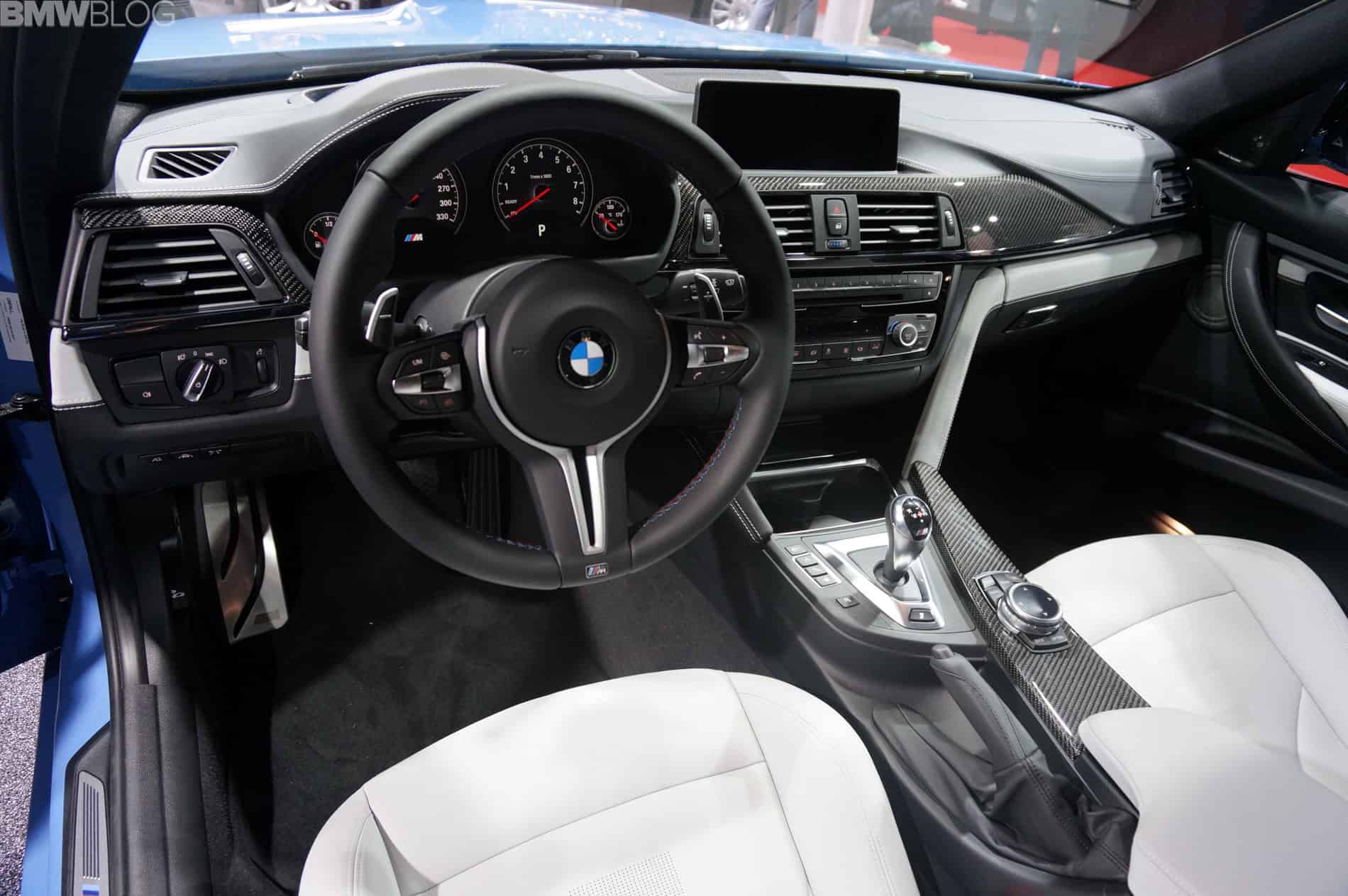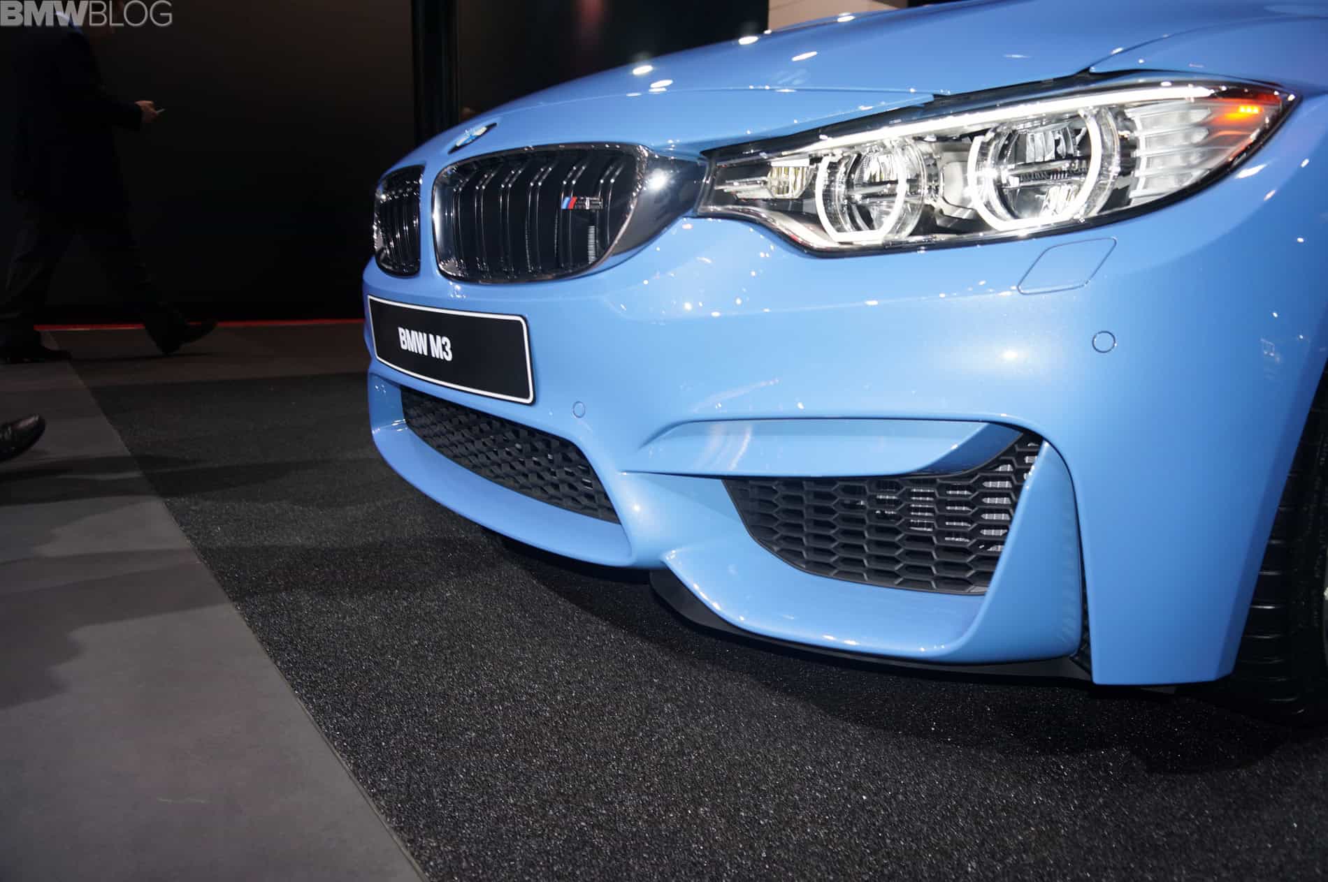 The display model sports the Yas Marina Blue paint job which is also available for the M4 Coupe. The M3 Sedan and M4 Coupe can be ordered in Alpine White, Sakhir Orange, Black Sapphire, Silverstone, Mineral White, Mineral Grey, Austin Yellow and Yas Marina.