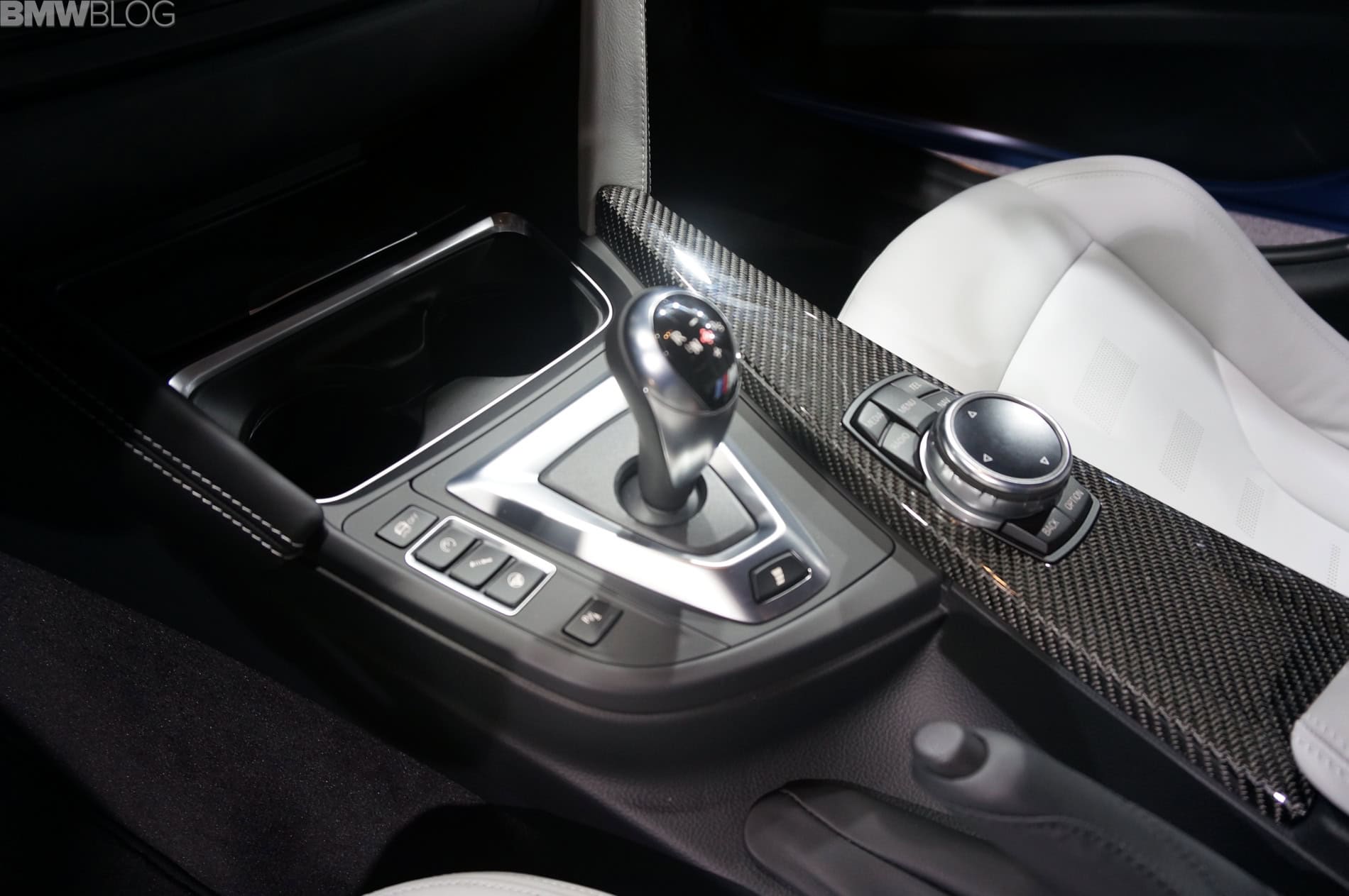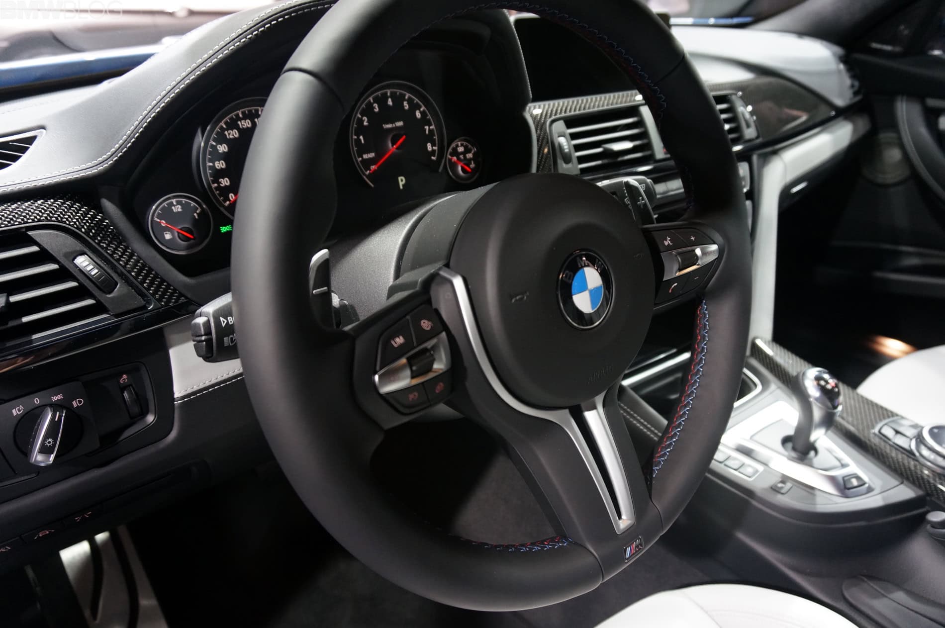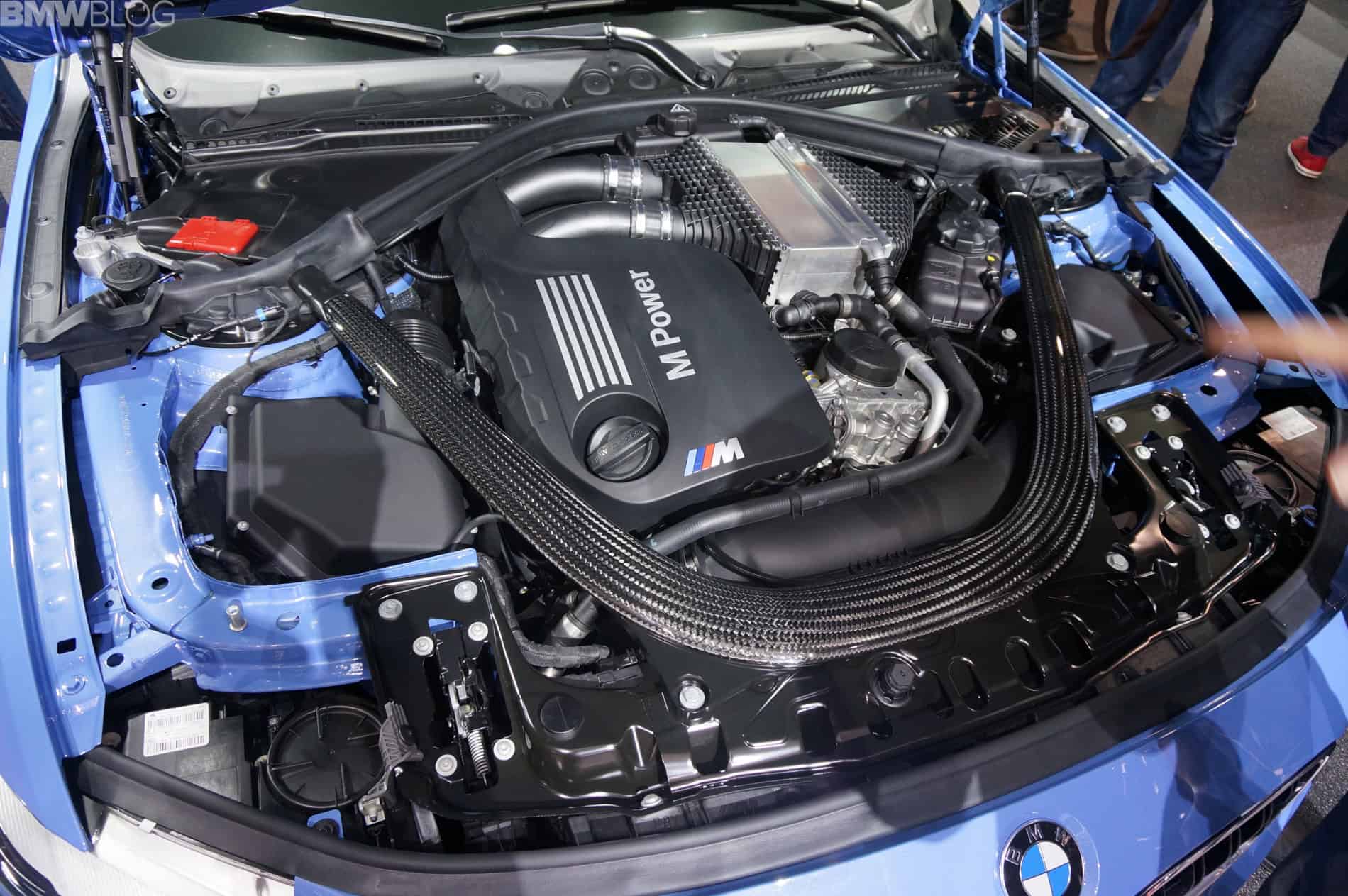 The display model sports the Yas Marina Blue paint job which is also available for the M4 Coupe. The M3 Sedan and M4 Coupe can be ordered in Alpine White, Sakhir Orange, Black Sapphire, Silverstone, Mineral White, Mineral Grey, Austin Yellow and Yas Marina.