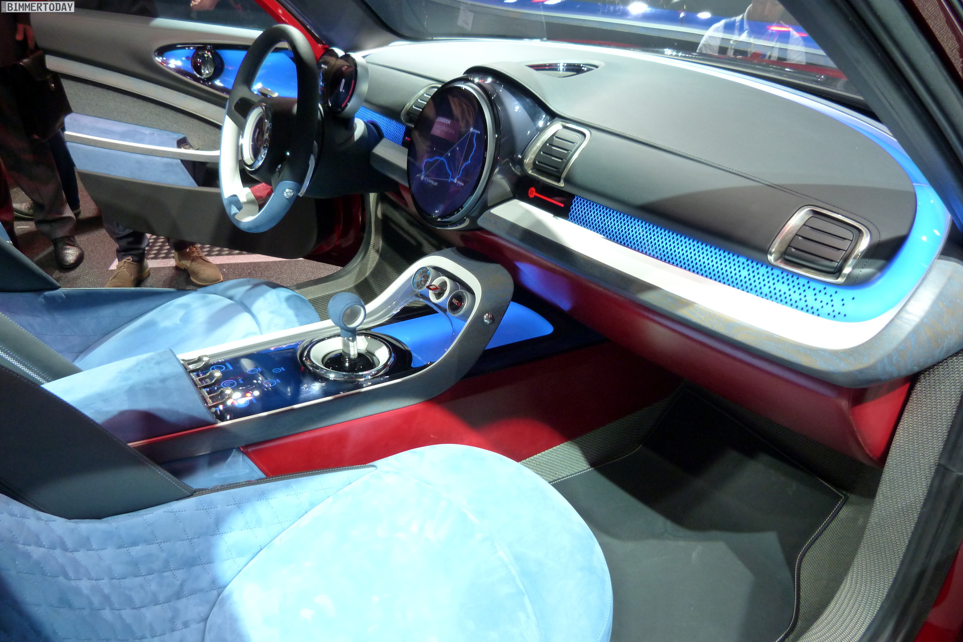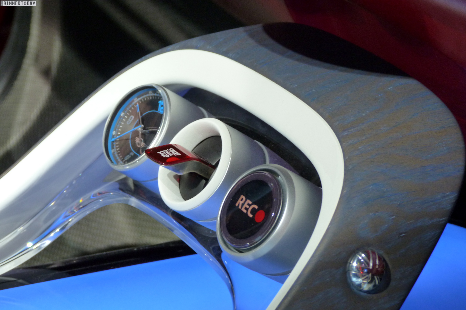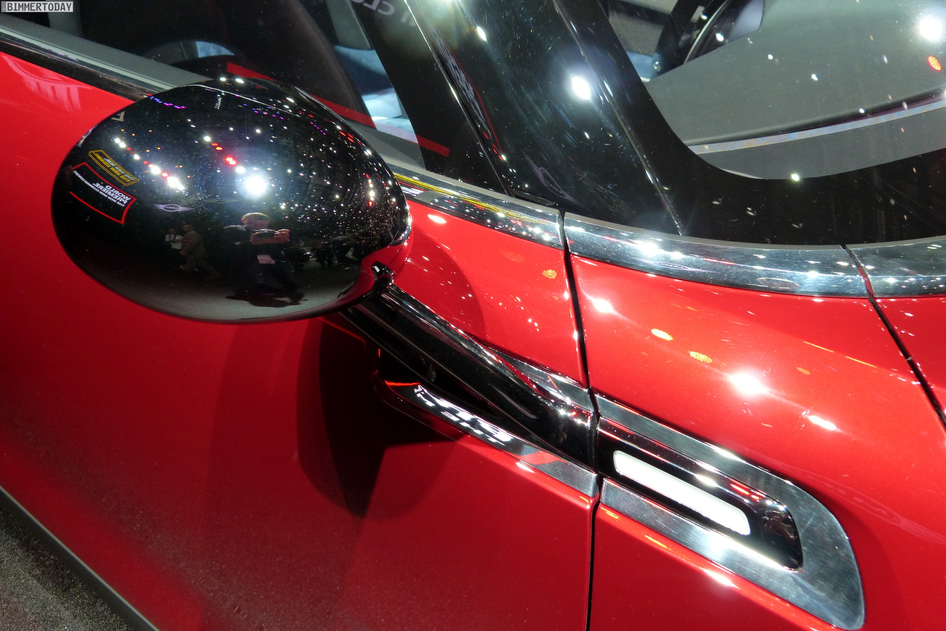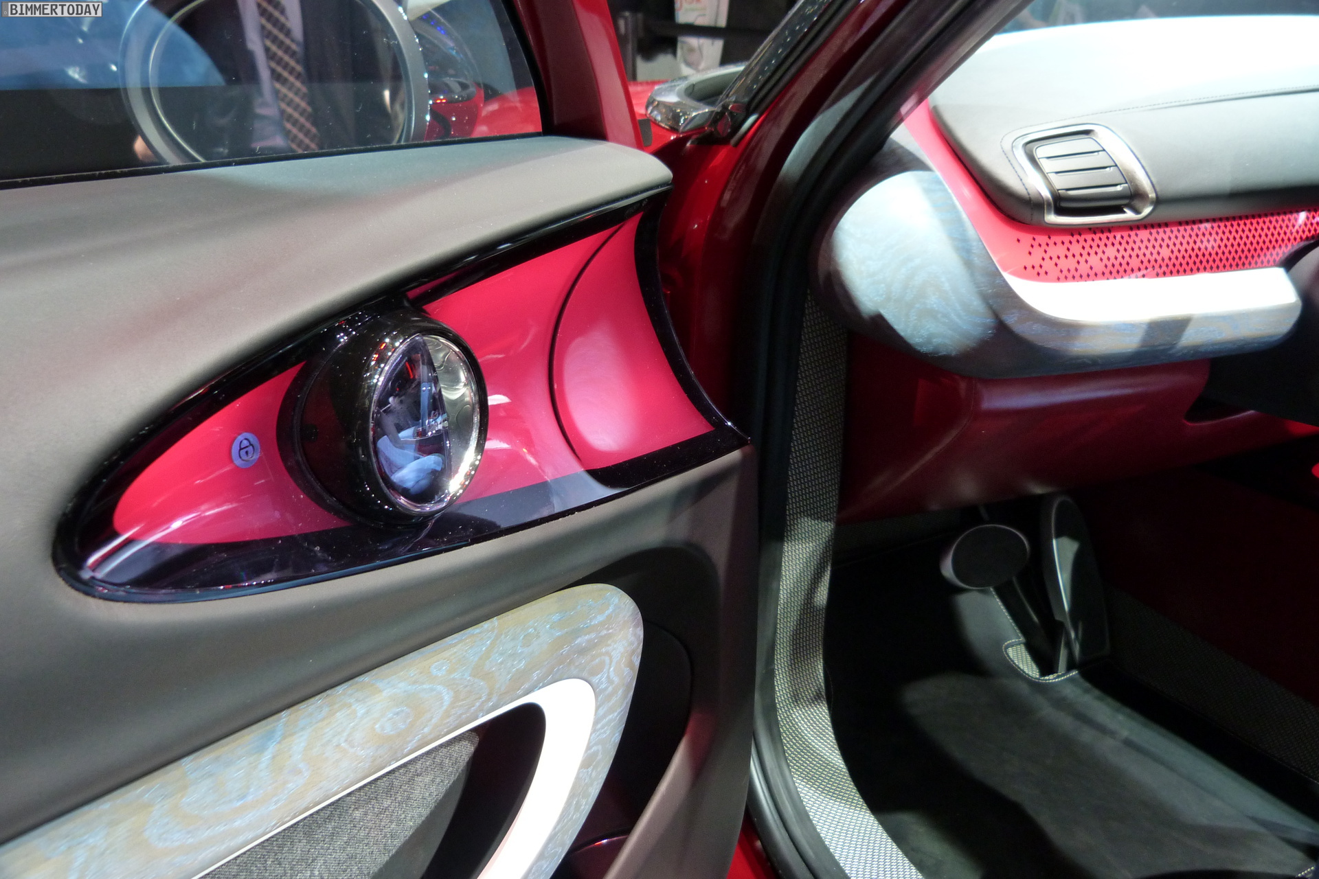 MINI CLUBMAN CONCEPT stands out with the characteristic agility of the MINI proportions, the prolonged roof line clearly reflects the car’s extensive utility space. It also gives the silhouette a distinctive elegance, underscored by generous surfaces. The powerful, warm Berry Red color shows surfaces and shapes to optimum effect. The roof in the color “Blade” – a metallic grey – creates an elegant contrast with the warm red of the corpus.
