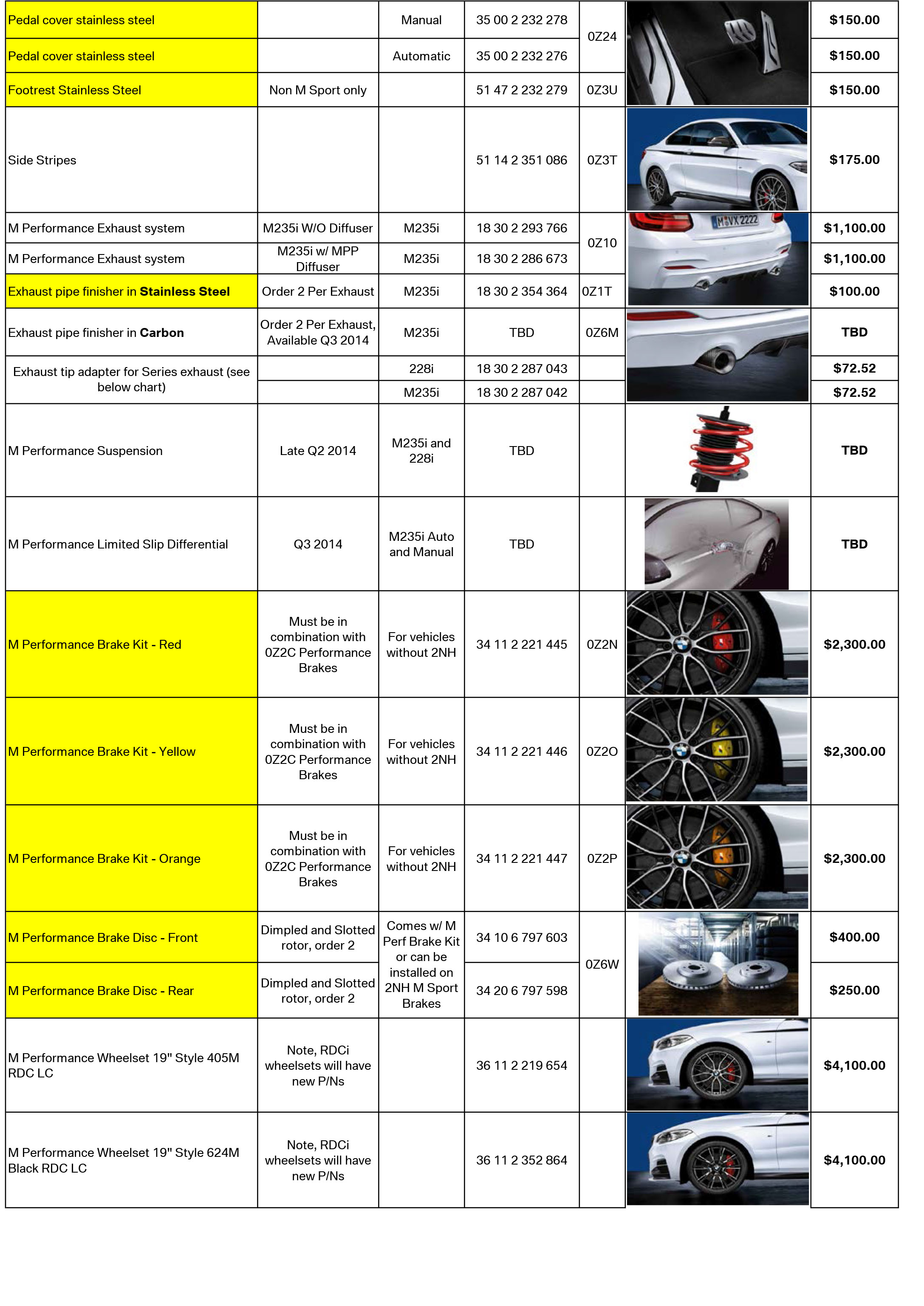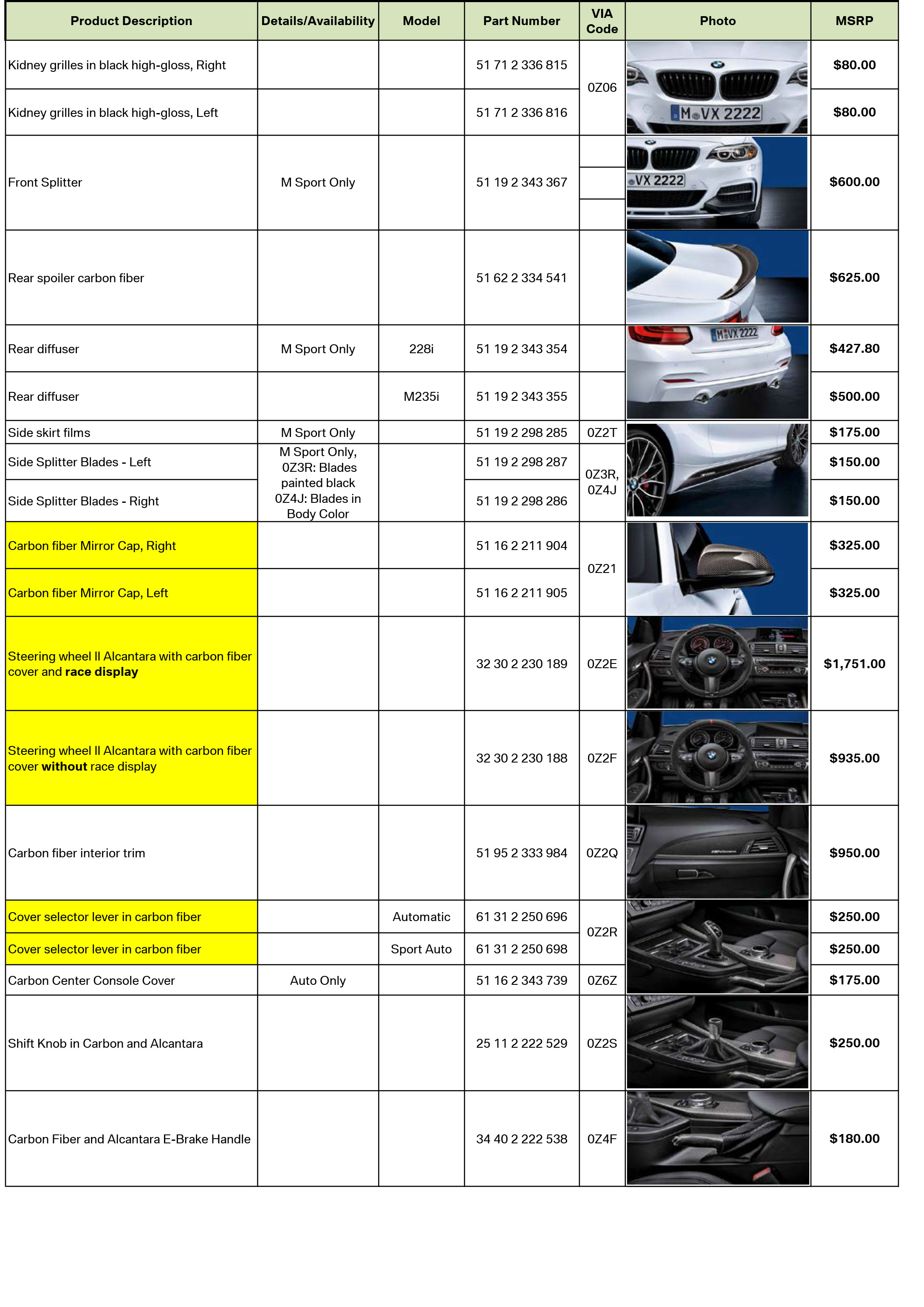 If you have been stocking M Performance Parts for your 3 Series and 4 Series customers, many of these parts can be applied to the 2 Series! For a full list, see items that are highlighted in yellow below.