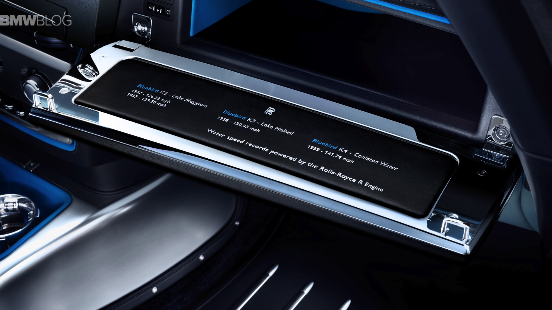 The car is finished in a specially developed ‘Maggiore Blue’ exterior paint, inspired by Bluebird’s famous colour scheme. Nine layers of paint are applied before an exhaustive process of hand-sanding and the application of a cutting-edge powdered lacquer is undertaken to ensure an impeccable finish. For the first time in Rolls-Royce history the exterior finish extends to the engine, creating a visually striking homage to the power behind Campbell’s records. The finish also adorns the car’s specially developed, fully-polished eleven-spoke wheels for the first time, providing a subtle decorative accent.