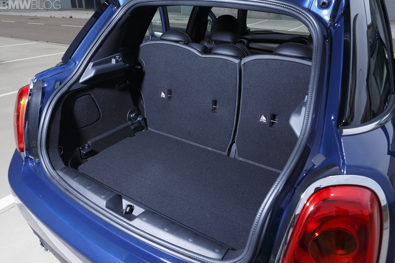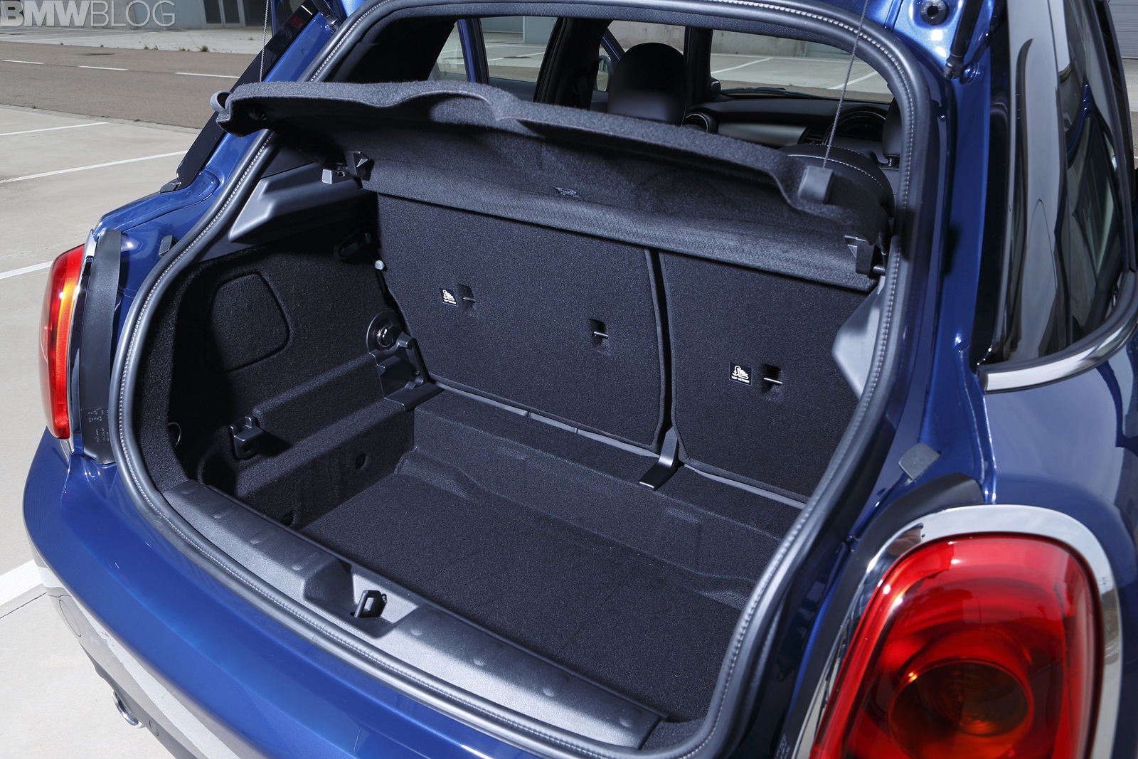 - Wheelbase expanded by 72 millimetres (to 2,567 millimetres) over the new MINI; creates space for three seats in the rear, with 72 millimetres more foot space and legroom, 15 millimetres more headroom and 61 millimetres more interior width at elbow height; luggage compartment space boosted to 278 litres, 67 litres more than in the 3 door model; excellent figures for the small car premium segment; rear backrest with 60:40 split; optional storage package including luggage compartment floor which can be locked into place at varying points.