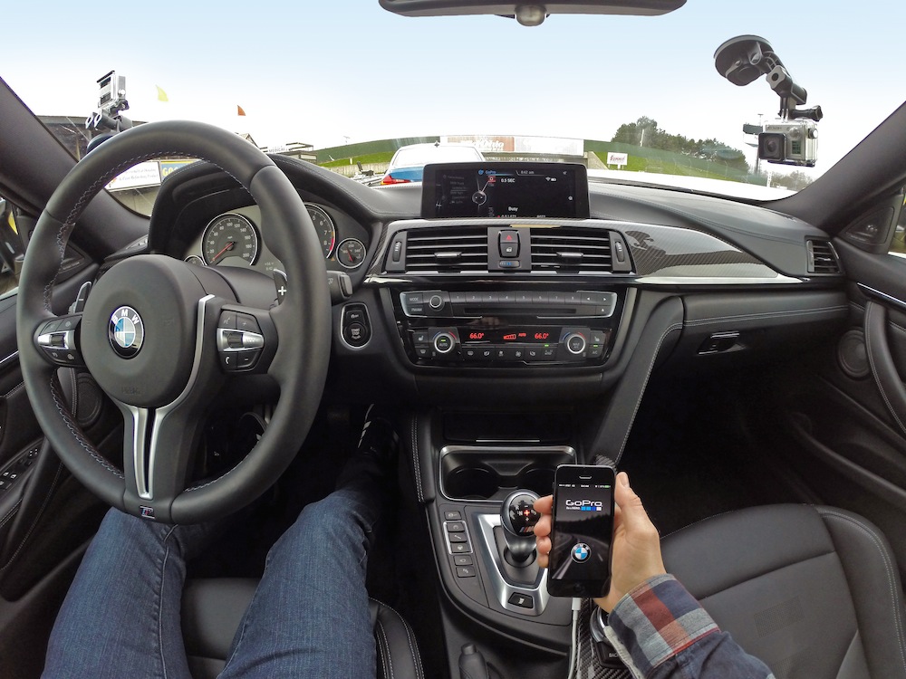 Now, BMW and MINI owners have GoPro camera control directly through either the iDrive or MINI Connected with any Wifi-enabled GoPro cameras. As we piled into the gaggle of GoPro-laden M3’s and M4’s, GoPro staff showed us just how easy it was to use the new app-based system. Upon squeezing in behind the wheel and thumbing the start button, all that was needed was to open the GoPro app on an iPhone integrated in with the M4’s iDrive system.