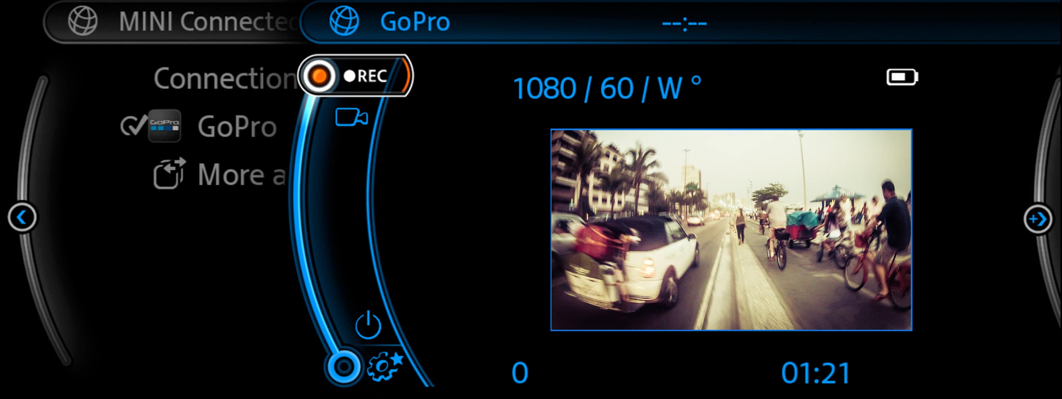 This makes MINI the first automobile in the world whose operating system can be used to control GoPro cameras. The car has to be fitted with the Radio MINI Visual Boost, the MINI navigation system or the Professional navigation system, and it must also have the MINI Connected option. The integration of the app in the vehicle operating system is taken care of via the customer’s Apple iPhone, while the signal exchange with the GoPro camera is ensured by means of a WLAN connection. This enables the camera to be controlled wirelessly – regardless of whether it is mounted inside or outside the car – for example on a bumper, on the roof or on an exterior mirror – so as to be able to take photos and films high-speed road action.
