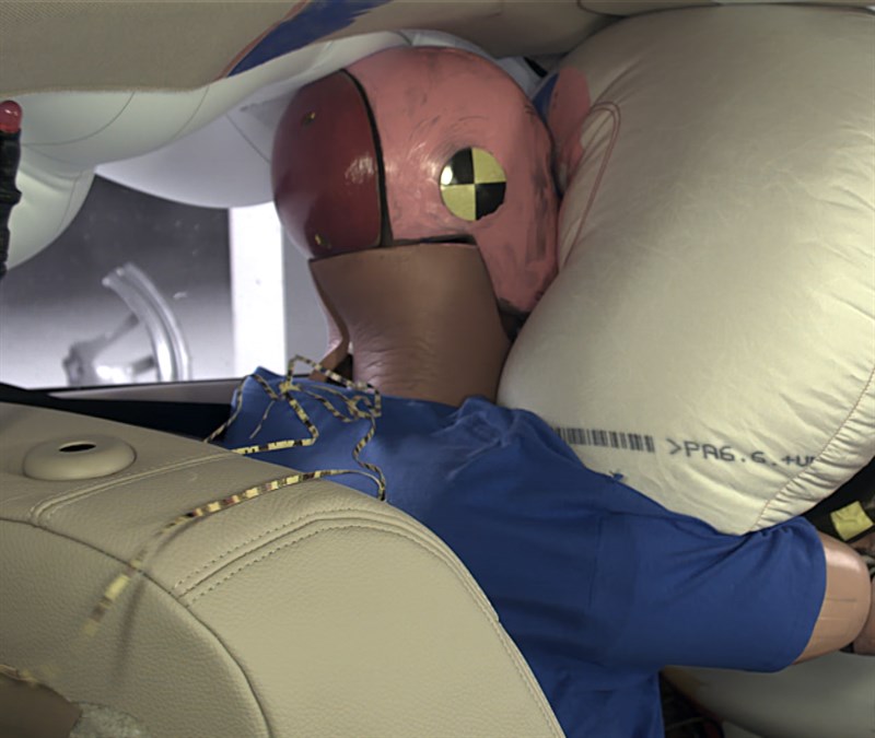 The dummy’s movement was well controlled. The dummy’s head loaded the frontal airbag, which stayed in front of the dummy until rebound. The side curtain airbag deployed and has sufficient forward coverage to protect the head from contact with side structure and outside objects.