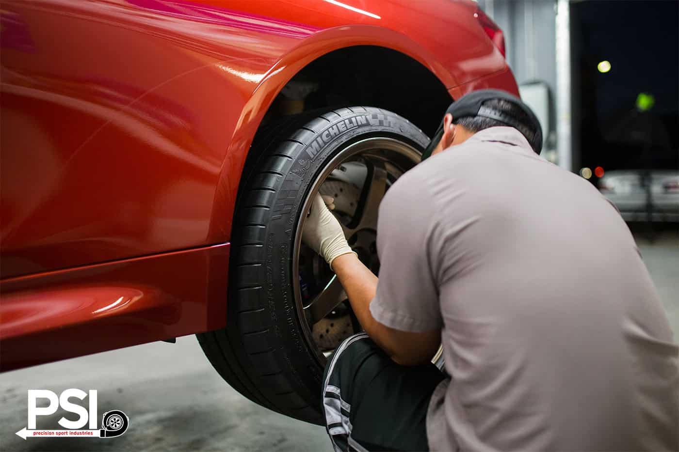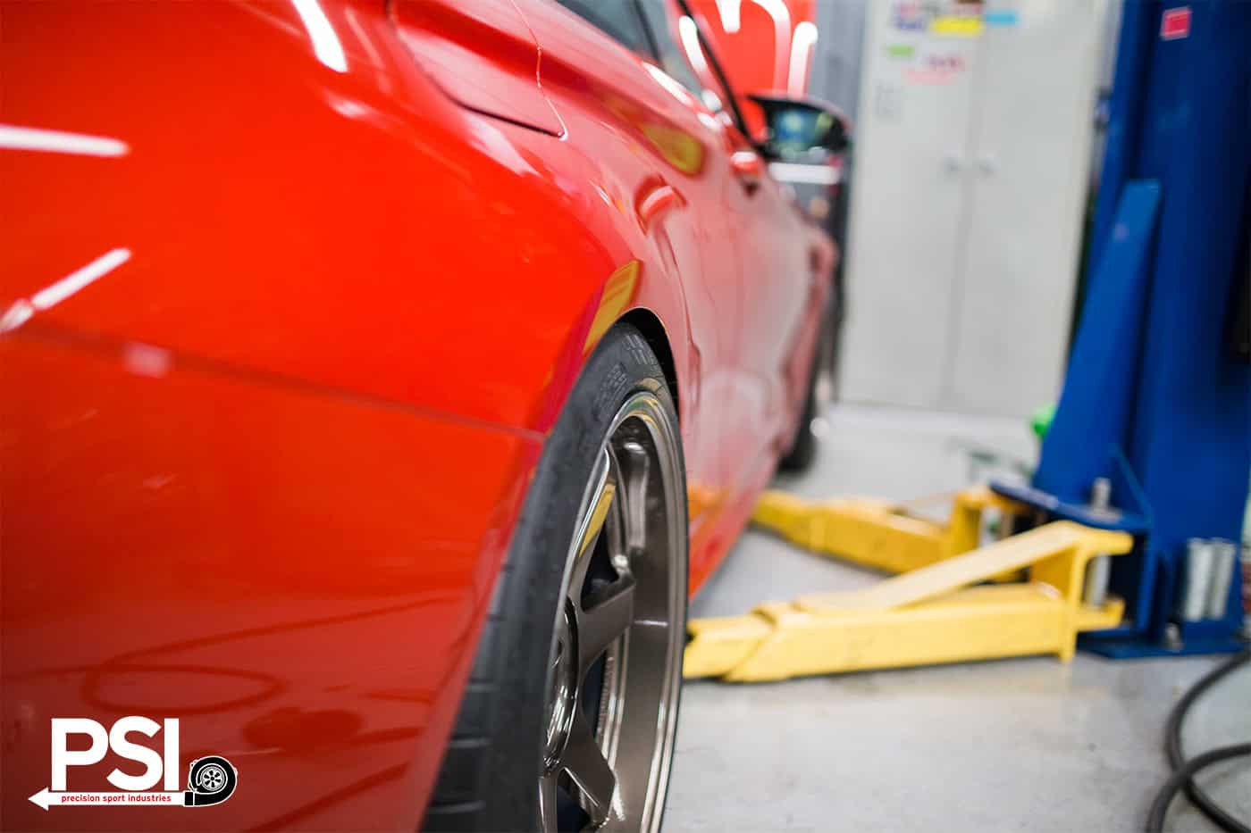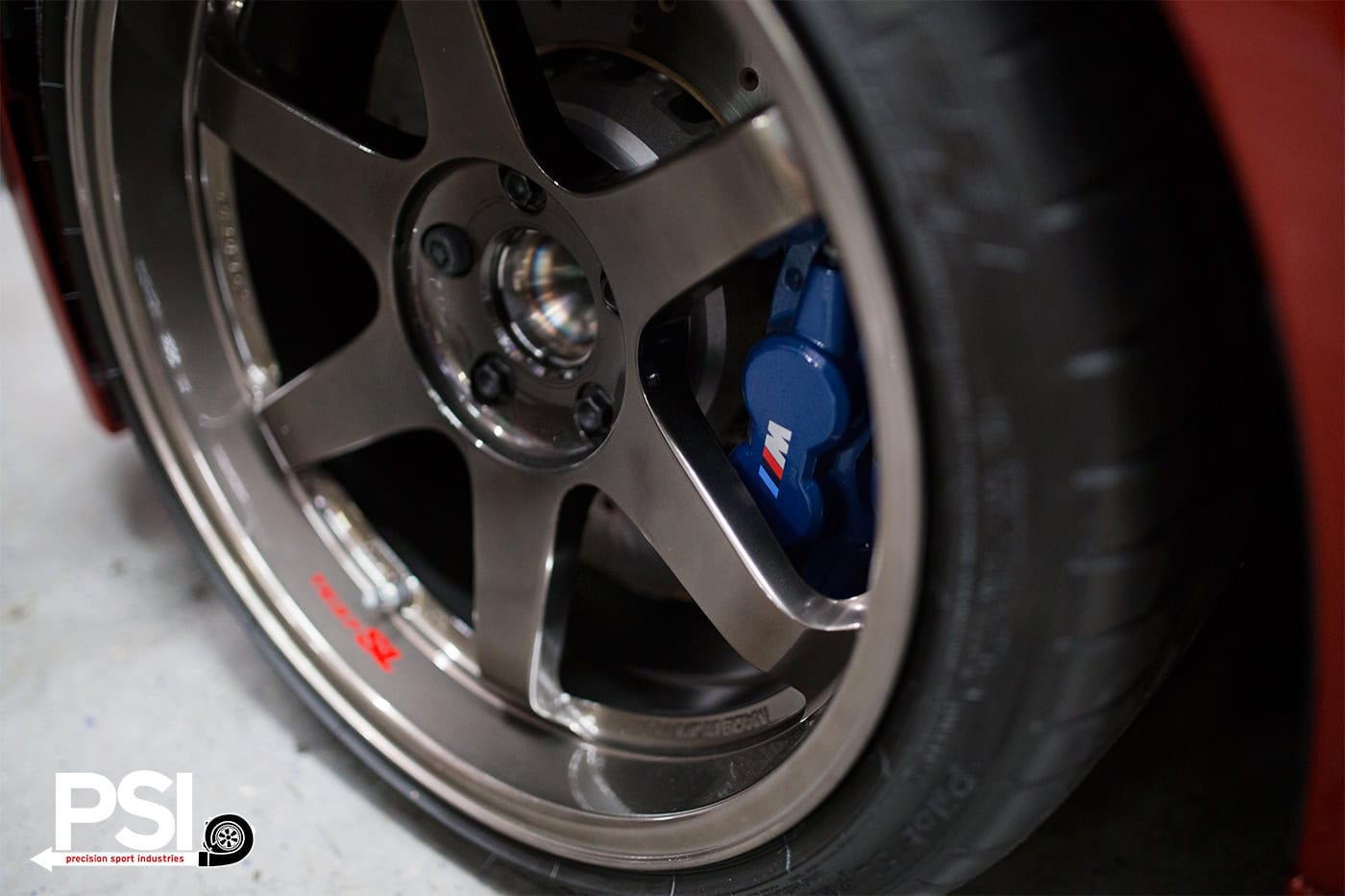 Most of the night was spent methodically capturing every aspect with our photographer, and fitting the first of many modifications to come. Wheel measurements were recorded, and a beautiful set of 19″ Hyper Bronze Volk Racing TE37 SL wheels were fitted in place of the OEM 19s along with H&R Super Sport springs.