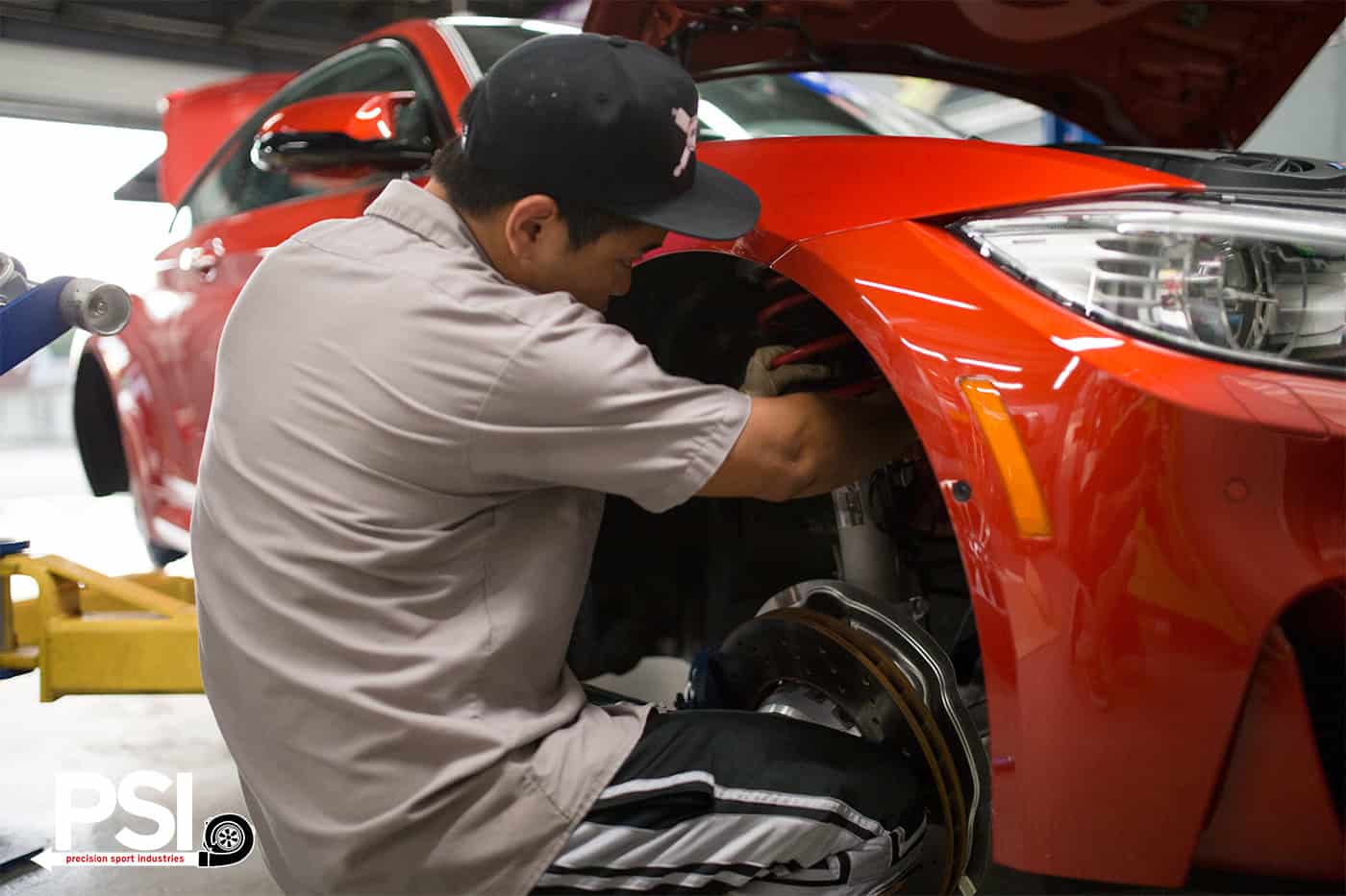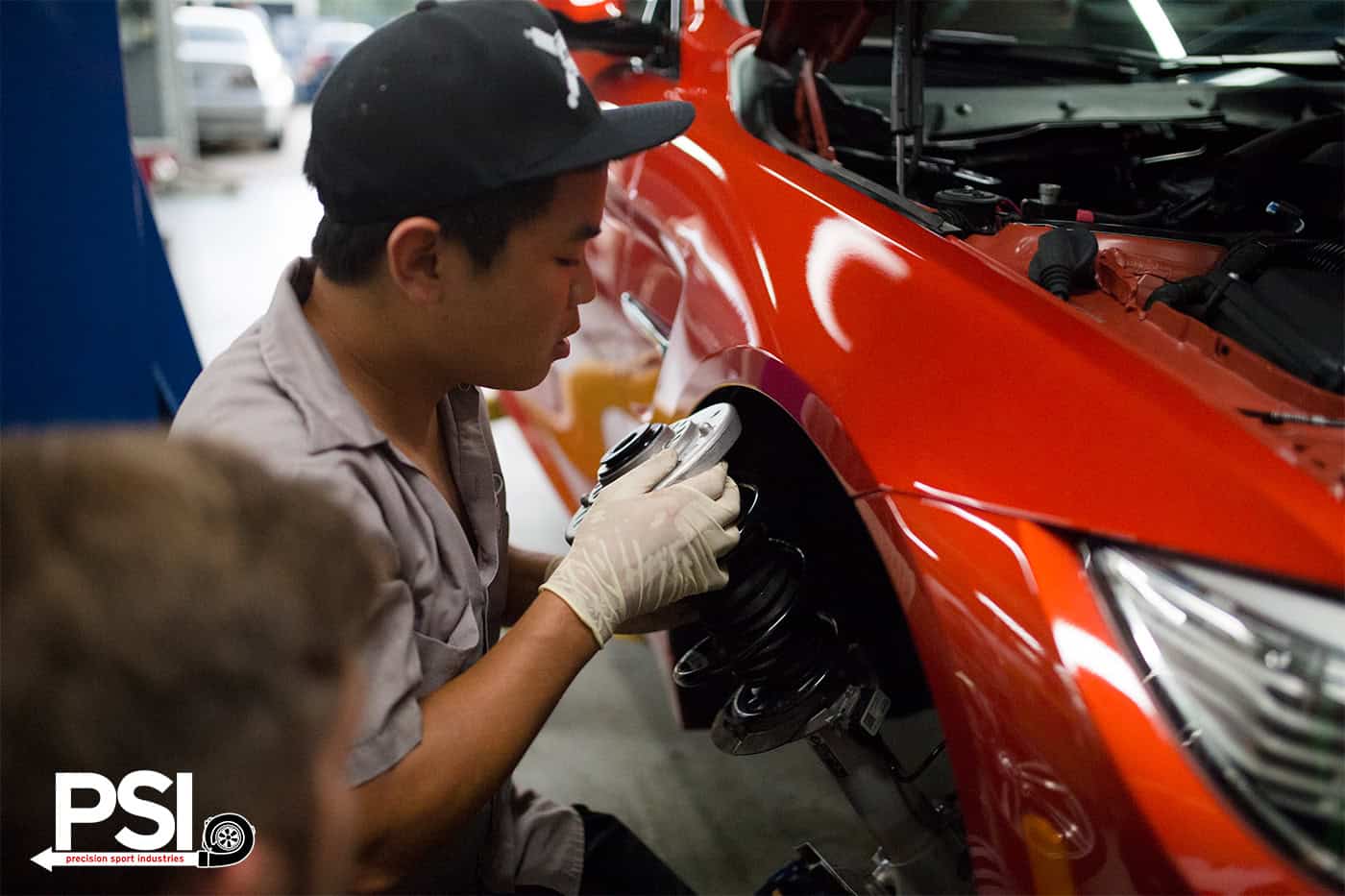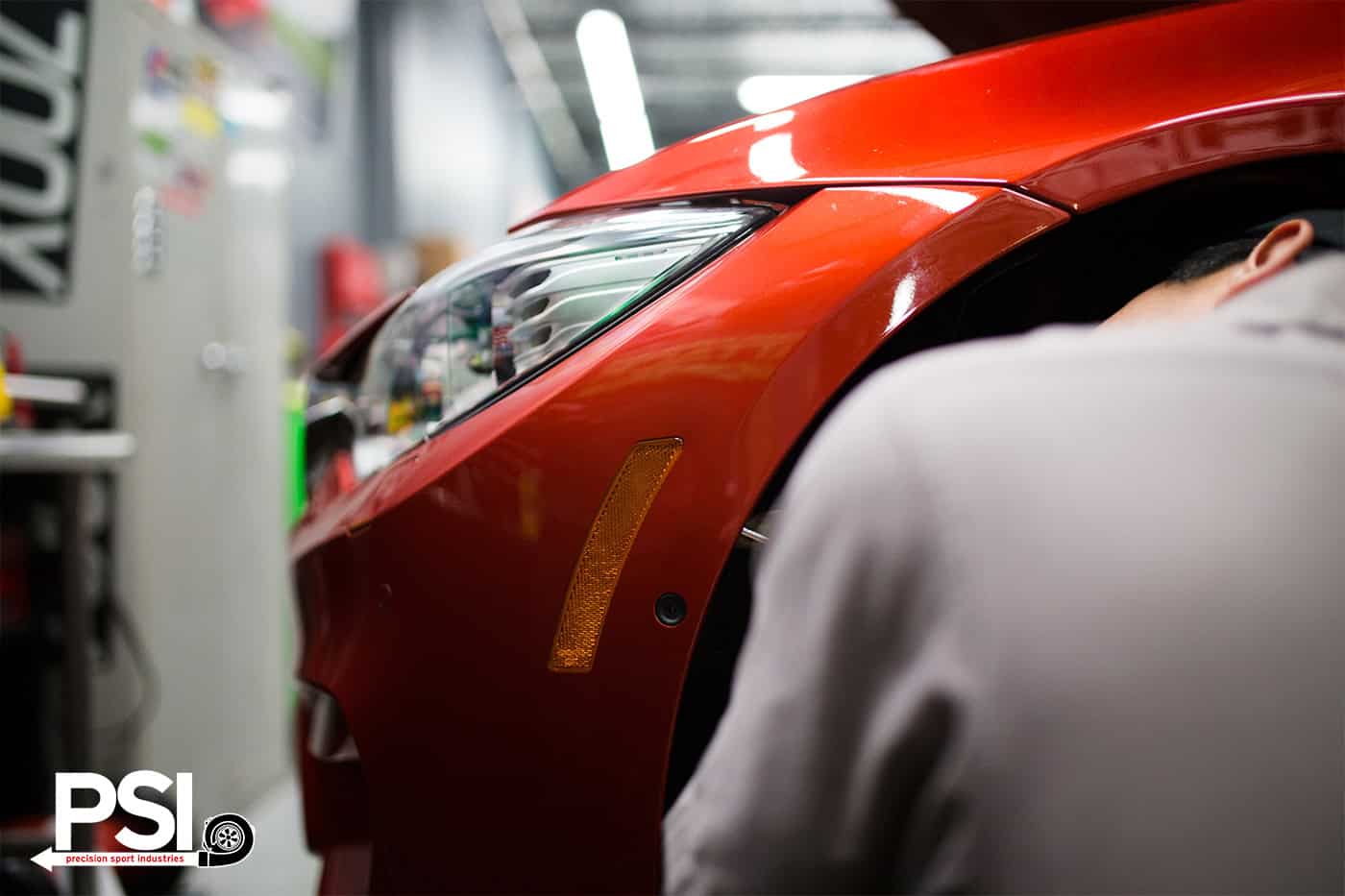Most of the night was spent methodically capturing every aspect with our photographer, and fitting the first of many modifications to come. Wheel measurements were recorded, and a beautiful set of 19″ Hyper Bronze Volk Racing TE37 SL wheels were fitted in place of the OEM 19s along with H&R Super Sport springs.