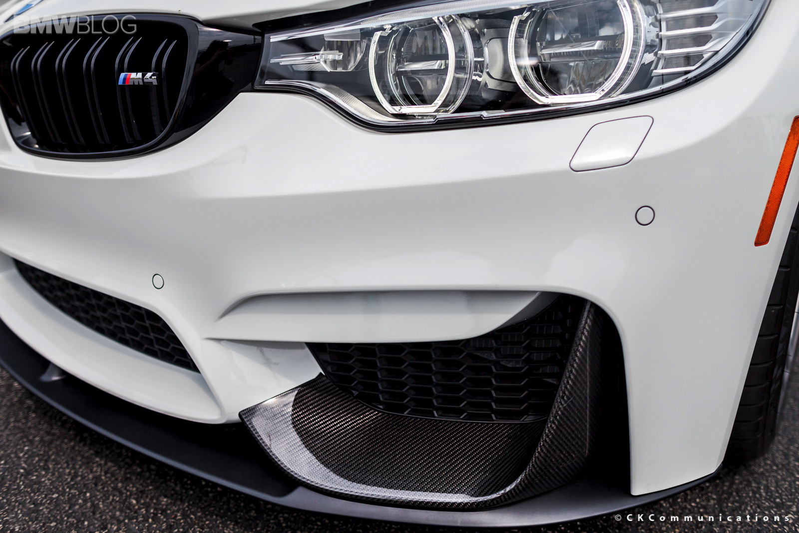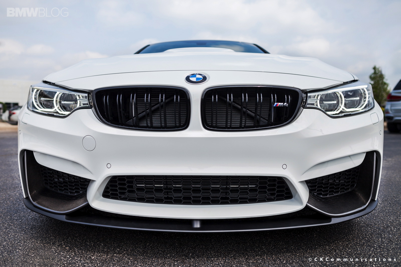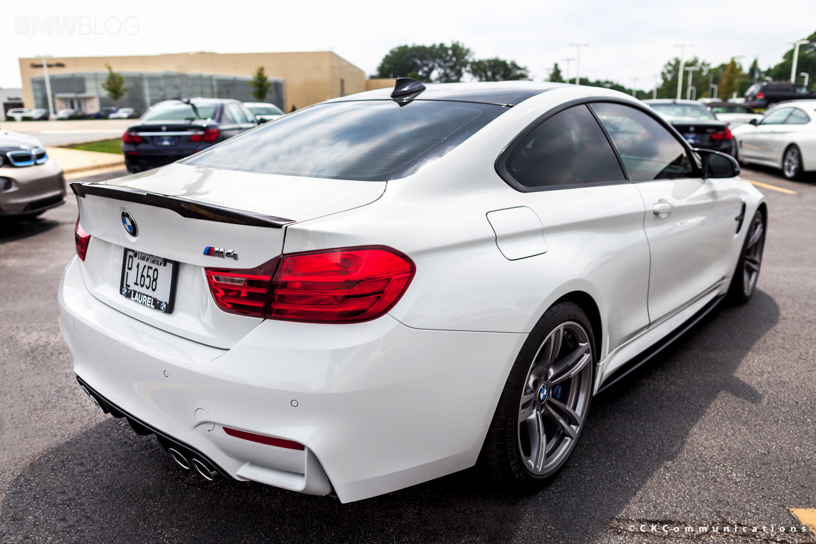 The new BMW M4 Coupe just went on sale and owners, along with BMW dealerships are already experimenting with different performance parts. The BMW M4 Coupe shown here was tuned up by Laurel BMW of Westmont and shows how well the Alpine White color goes with the carbon fiber M Performance Parts. At the front, the M4 gets the M Performance Front Lip made of carbon fiber while in the rear, the carbon fiber diffuser incorporates the M four tailpipes. Also in the back we have the M Performance Spoiler which not only gives the car a better look but also helps with downforce.