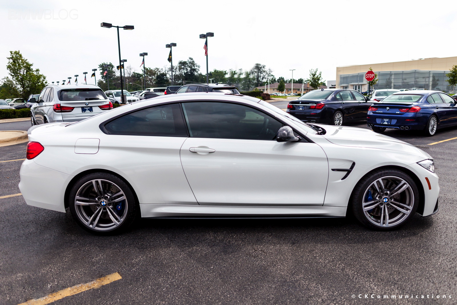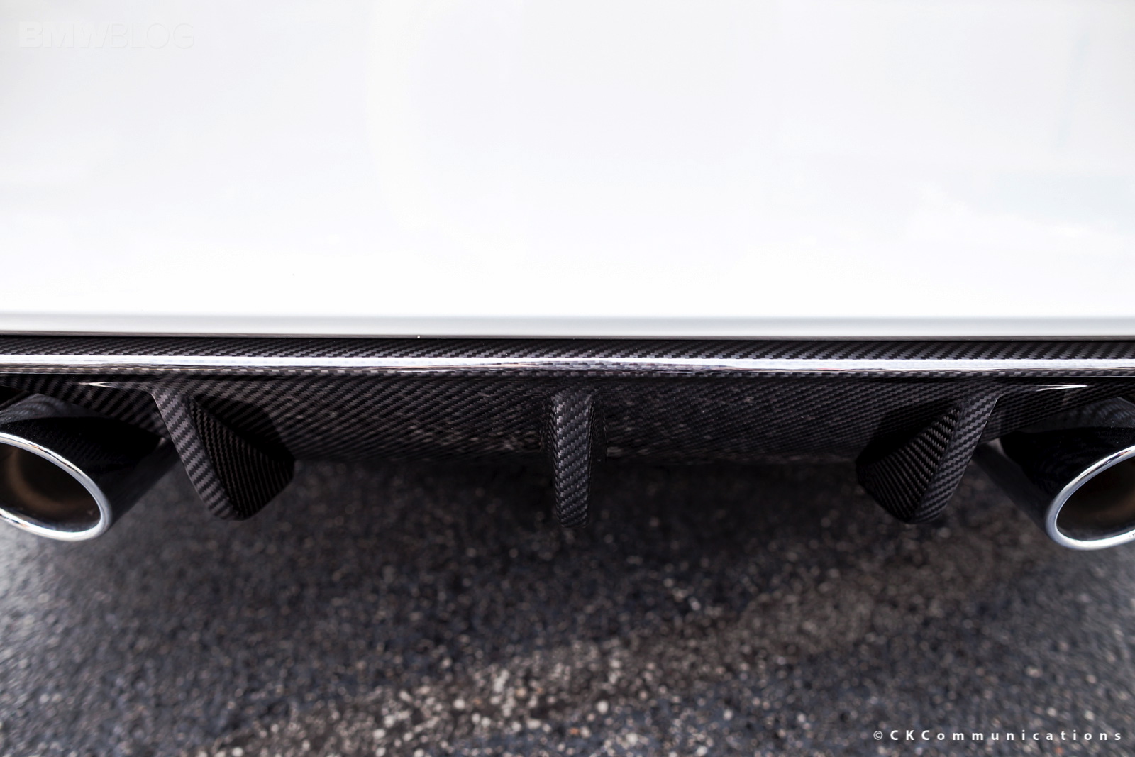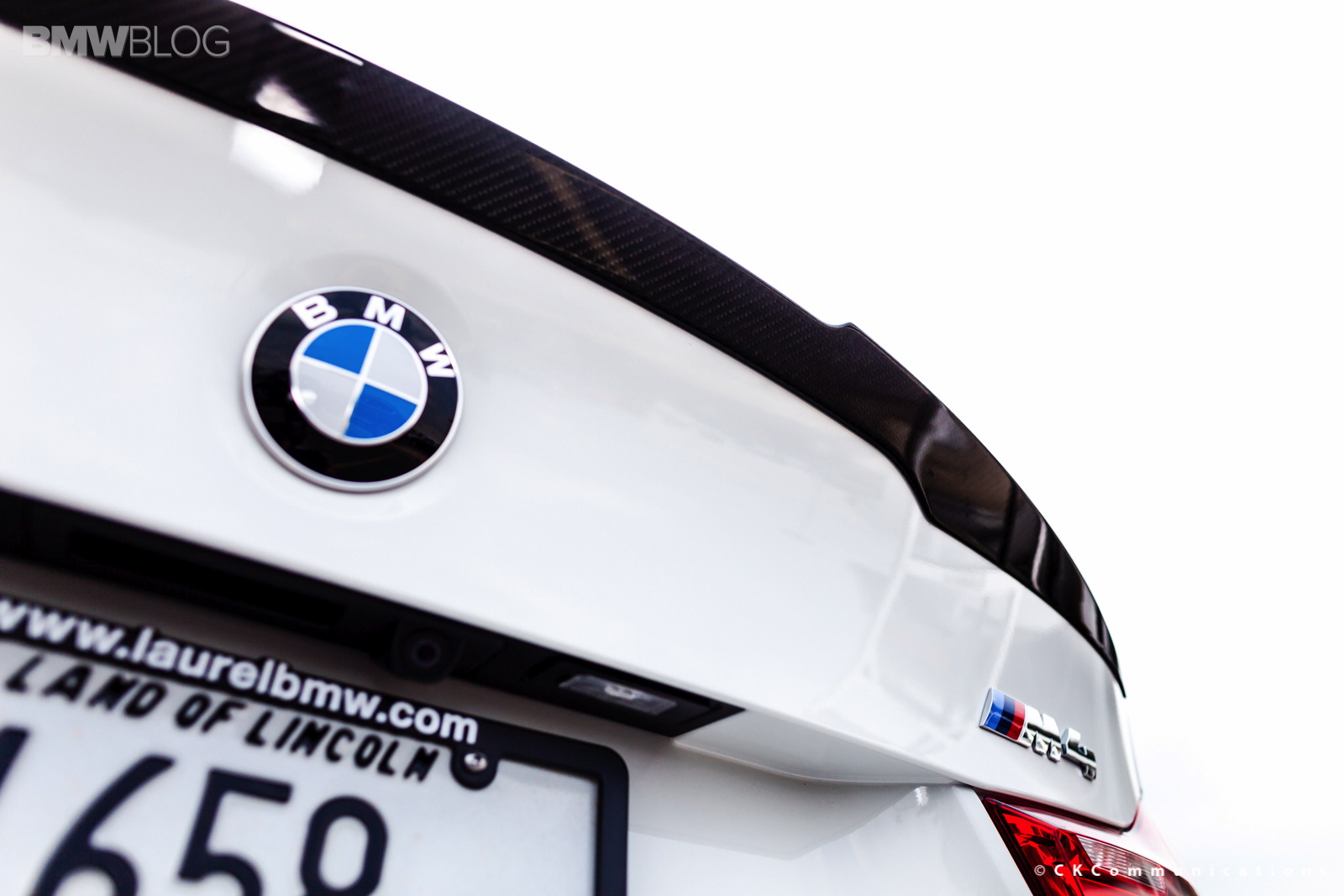 The new BMW M4 Coupe just went on sale and owners, along with BMW dealerships are already experimenting with different performance parts. The BMW M4 Coupe shown here was tuned up by Laurel BMW of Westmont and shows how well the Alpine White color goes with the carbon fiber M Performance Parts. At the front, the M4 gets the M Performance Front Lip made of carbon fiber while in the rear, the carbon fiber diffuser incorporates the M four tailpipes. Also in the back we have the M Performance Spoiler which not only gives the car a better look but also helps with downforce.