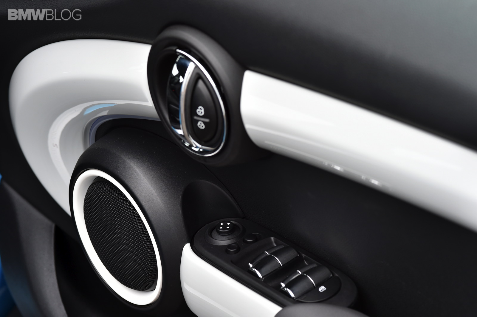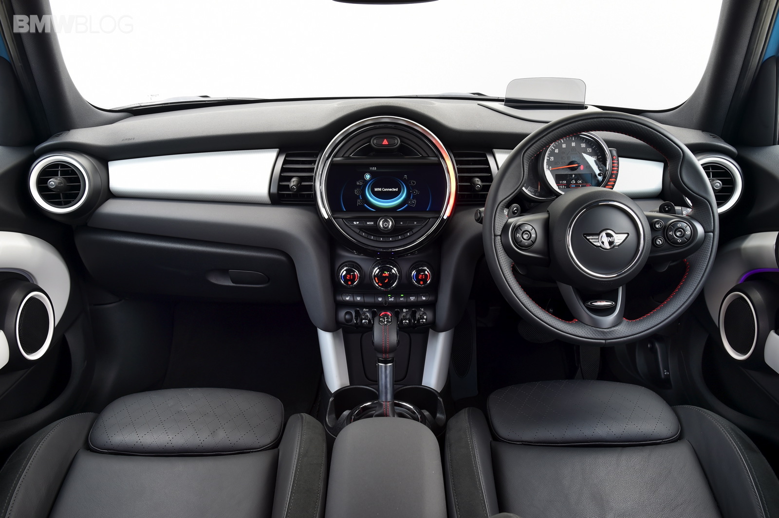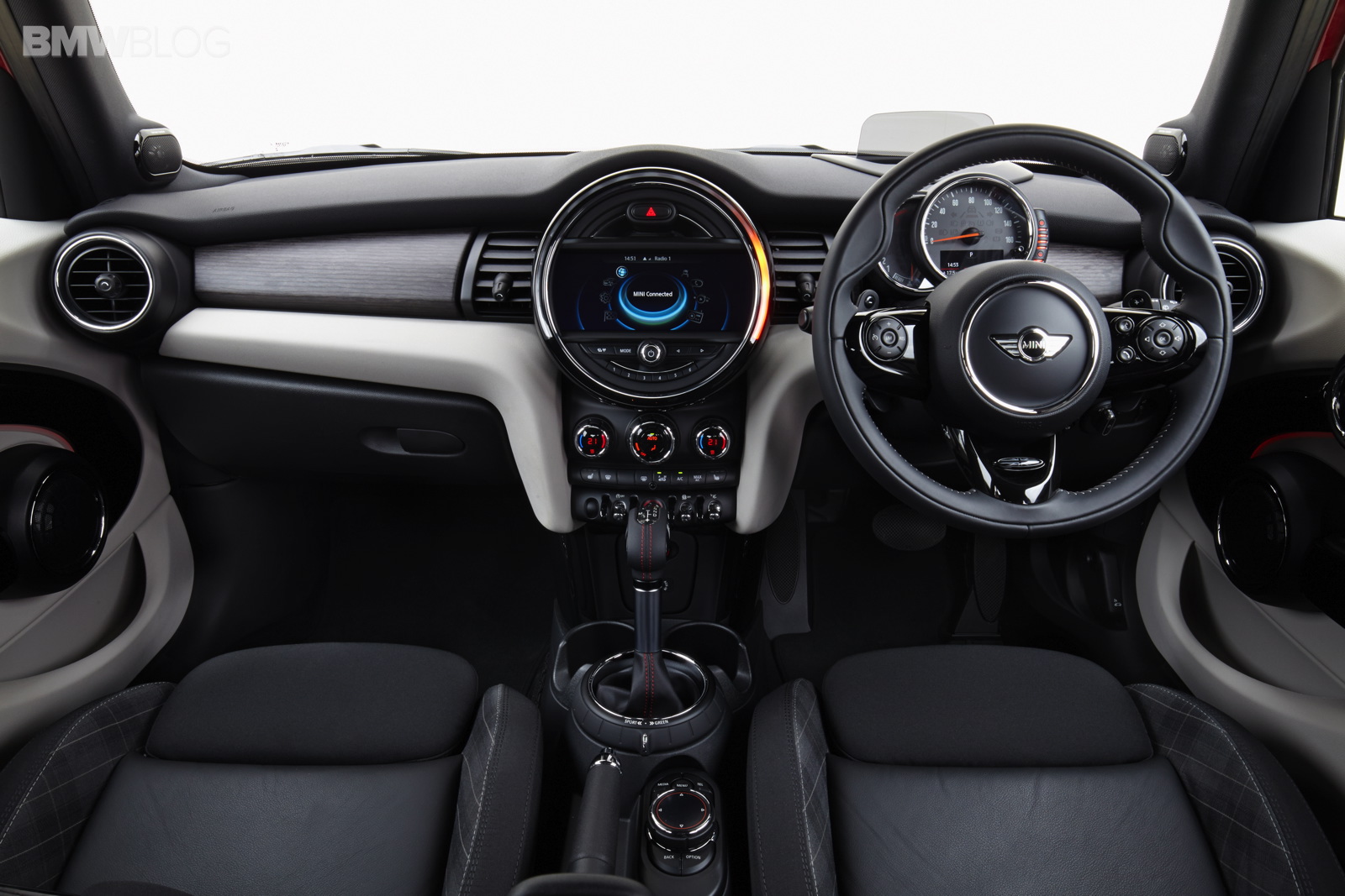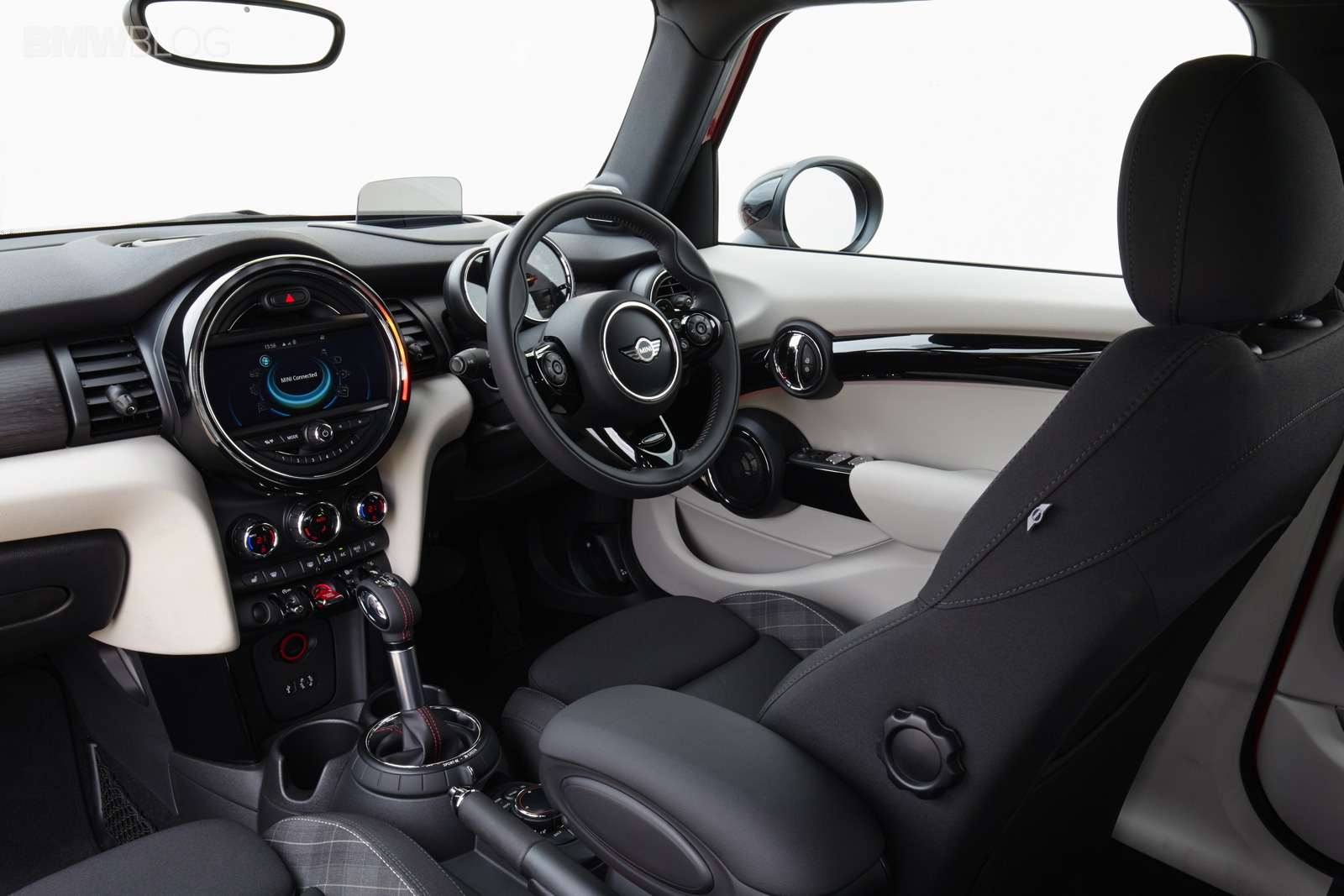 New display and operating concept: instrument cluster on the steering column showing road speed and engine speed, colour display for vehicle status details and fuel level; central instrument with new display elements and coloured lighting configuration including LED ring for visual feedback in response to numerous functions, 4-line TFT display as standard or optional colour display up to 8.8 inches in size; operation of navigation, entertainment, telephone and vehicle functions using MINI Controller in centre console with the relevant feedback provided on the on-board computer; start/stop button at the centre of the toggle switch bar on the centre console, can be activated without key insertion; power window lifts in the door trim panels; operating panel for lights in the dashboard.