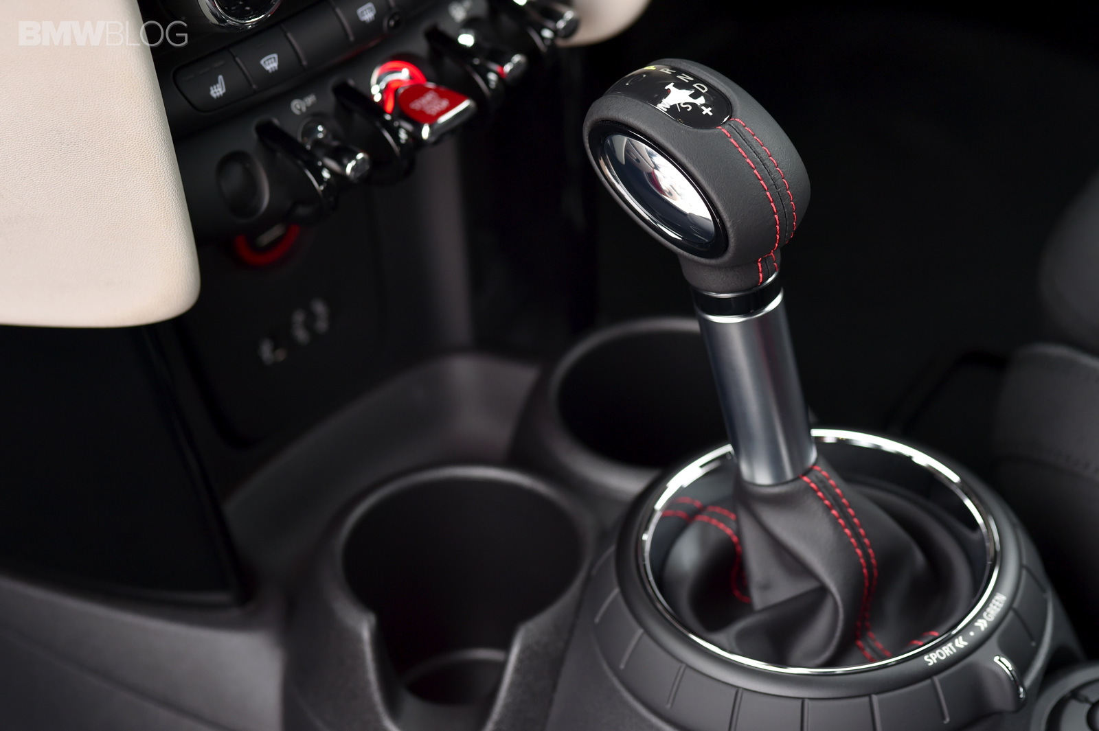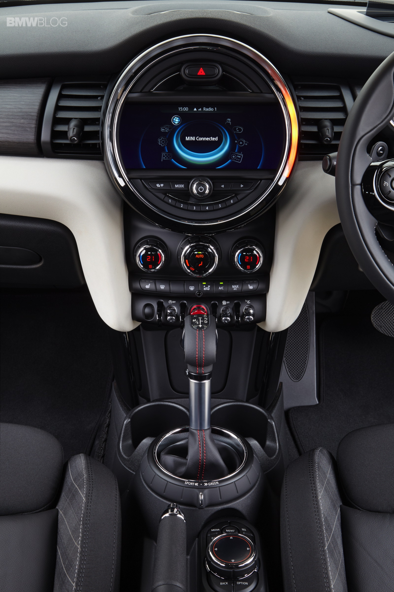 Car set-up can be varied using optional MINI Driving Modes with rotary switch at the base of the gear or selector lever; standard setting MID mode, SPORT and GREEN mode can be activated; needs-based influence can be exercised on characteristic curve of the acceleration and steering, shift dynamics of the Steptronic transmission and Dynamic Damper Control; GREEN mode in conjunction with Steptronic transmission including coasting with decoupled drivetrain.
