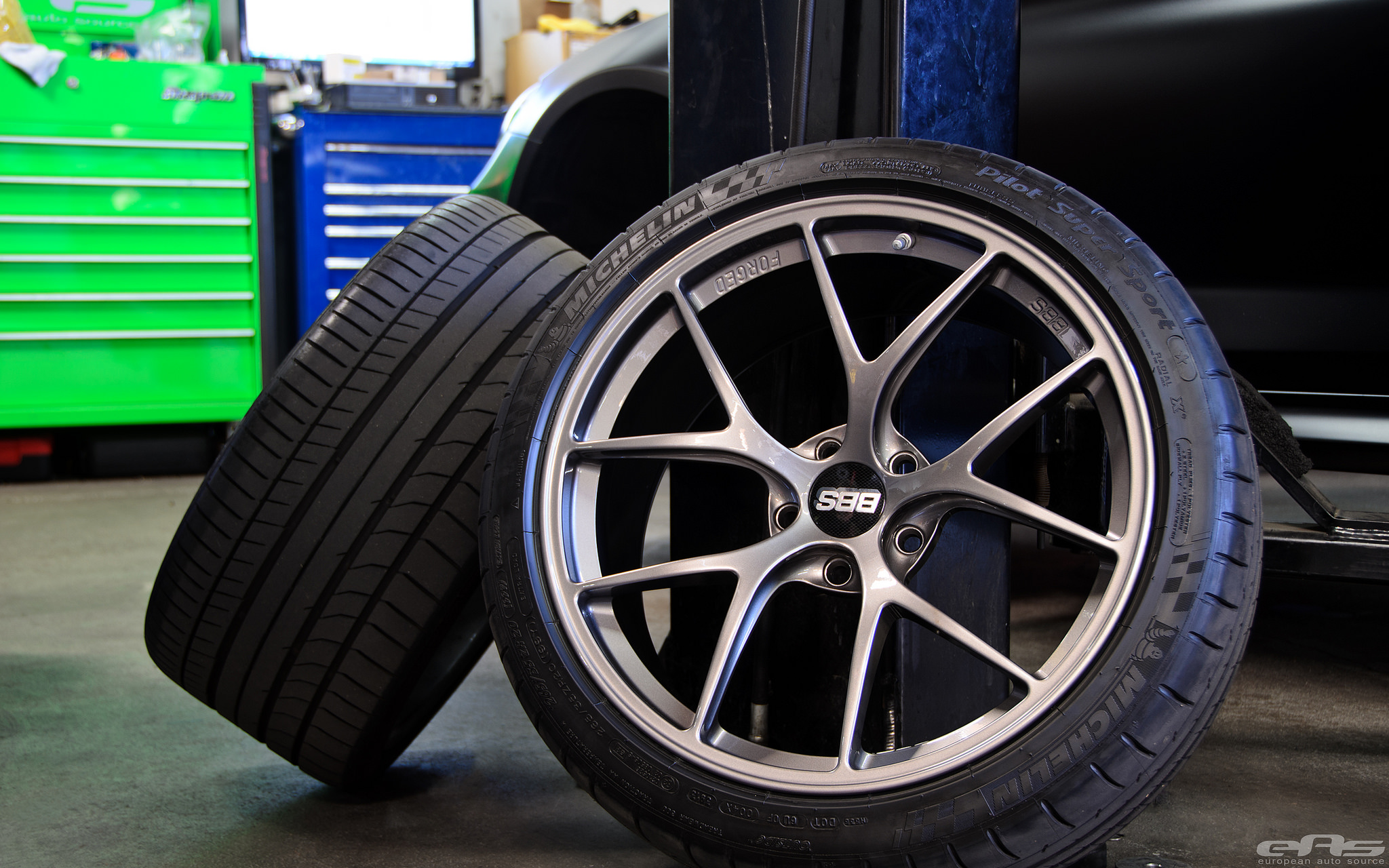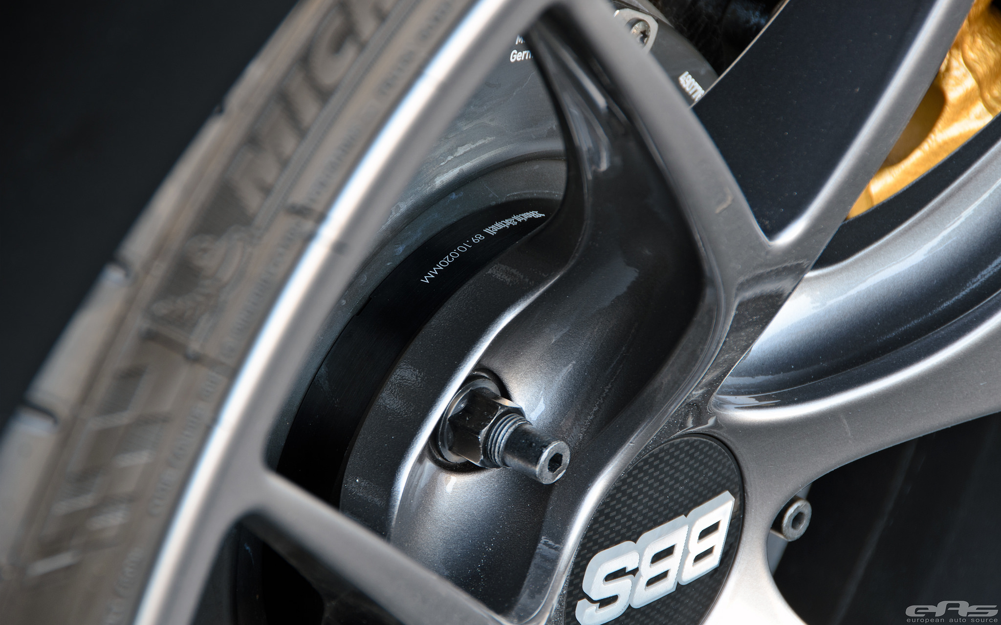Having been aggressively lowered on a set of KW V3 coilovers, the stock wheels just weren’t going to cut it any more. Replacing them are these 20″ BBS FIs, which do an excellent job of showcasing the massive carbon ceramic brakes.