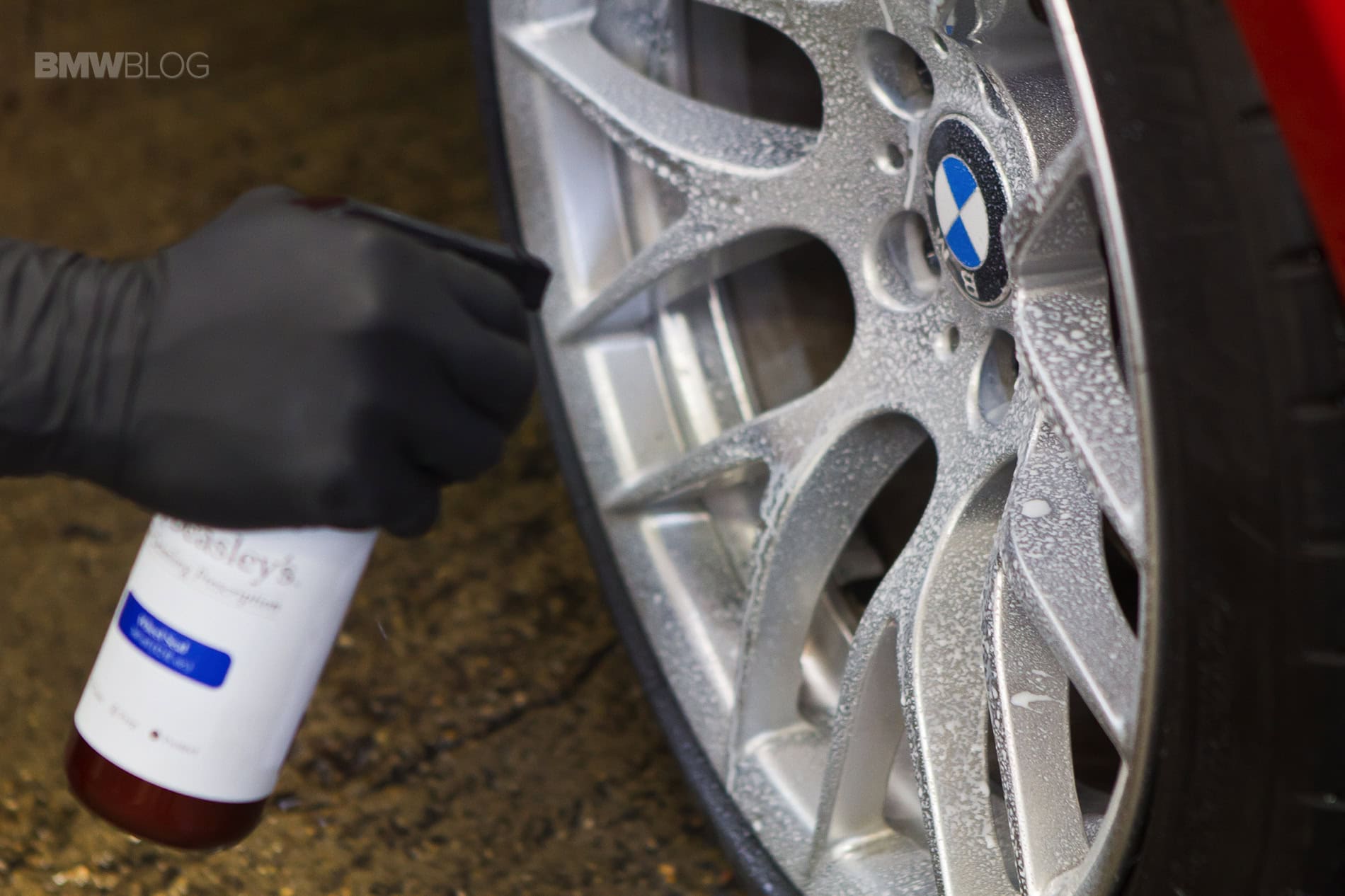 Now that the wheels been cleaned, we coated the wheels with a sealant. A wheel sealant with no flash point will protect the wheels from brake dust, road grime, and salt. The lack of a flash point means that however hot the wheels get, the sealant won’t come off.
