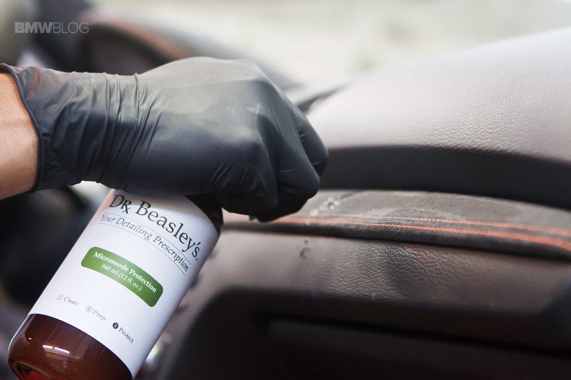 The name of the game when it comes to detailing though, like the outside of the car, is protection. It’s vital to protect every surface in the car so that they are resistant to staining, UV damage, and even abrasion, which makes them easier to clean. We went through and protected the leather with Leather Lock, the carpet with Carpet and Upholstery Protection, and the Alcantara with Microsuede Protection.