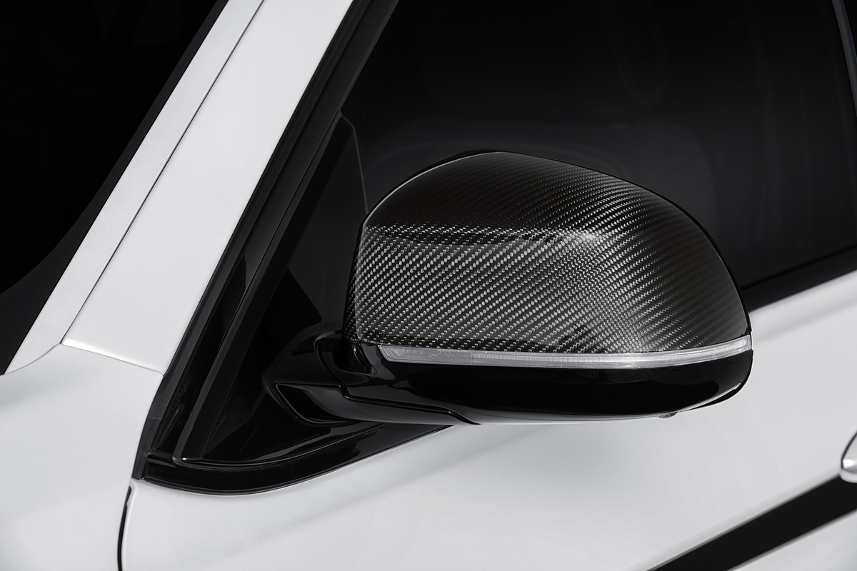 The Aerodynamics Package lends the BMW X6 an instantly more sporting and masculine appearance. It includes a carbon front splitter, rear diffuser and rear spoiler, as well as rear fins and rear side flaps in an elegant yet sporty high-gloss black. These features are complemented by lavishly hand-built carbon BMW M Performance exterior mirror caps, whose high-tech character shines an even brighter spotlight on the individuality and sporting credentials of the BMW X6. A radiator grille with black slats and frame offers a further personalisation option for the X6. The high-gloss black rear fins, meanwhile, lend the car a particularly dynamic and elegant appearance and help to further improve its aerodynamics.