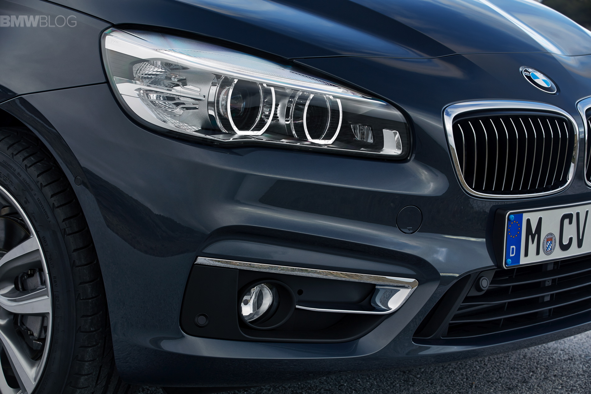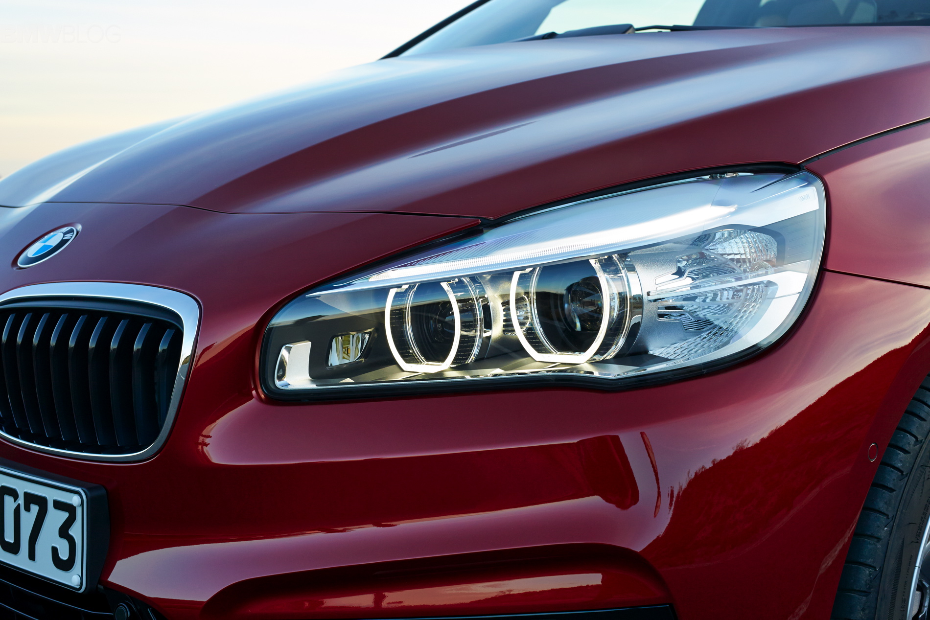 The BMW 2 Series Gran Tourer injects an unprecedented dose of dynamics into its vehicle segment. At the front end the hallmark trio of BMW icons – the twin kidney grille, twin round headlights and brand logo – unambiguously display the vehicle’s family affiliation. Despite the spacious interior, the front aspect is sporty and flat. The interplay of a low windscreen and high engine compartment cover significantly reduces the perceived height of the BMW 2 Series Gran Tourer, while the clearly defined and muscularly sculpted bonnet leaves no doubt as to the engine power lurking beneath it. Along with the focused look of the twin round headlights, the powerful play of lines that accentuate the car’s width and the large air intakes sited on the far edges of the front, it all makes for a sporty, agile front-end look.
