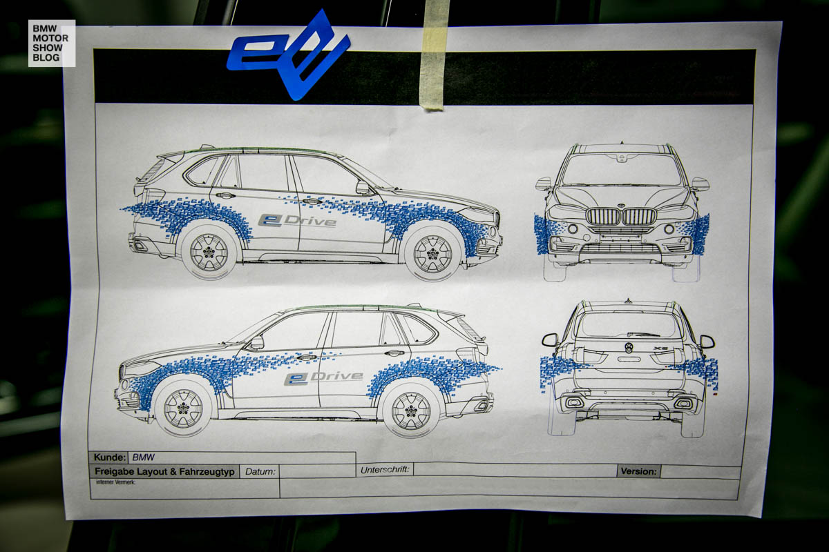 The blue foil wrap’s theme revolves around the coined term “eDrive” and features a series of “e” letters across the entire car. The trademark ‘eDrive’ will be used for all BMW using an electrical component for driving – as all electrical drive, or Plug-in Hybrid.