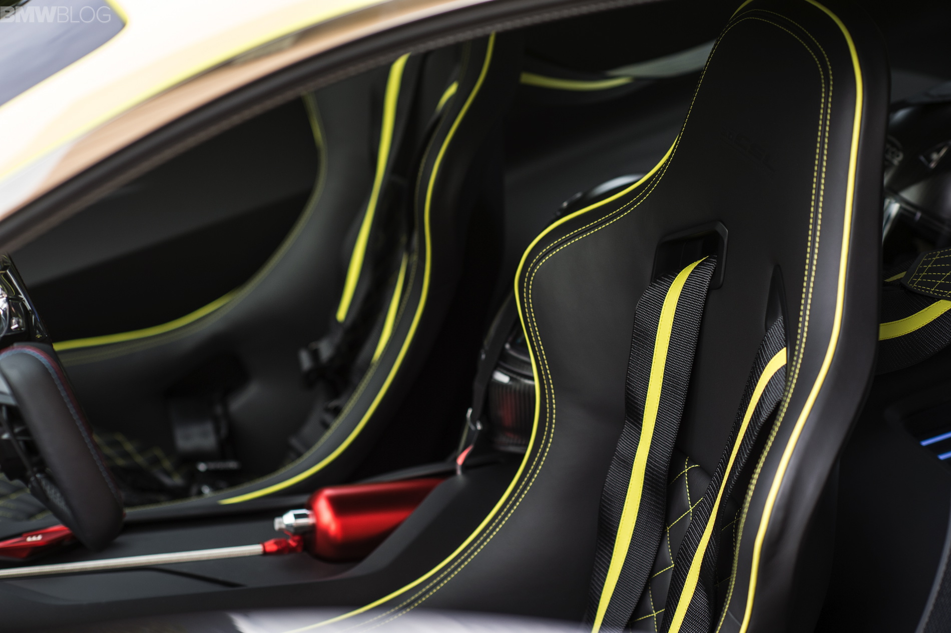 From the front end, a continuous horizontal line runs the sides of the car. In profile, this line is seen across the entire length of the long wheelbase, giving the car a long, low and sleek look. Dark CFRP (Carbon Fiber Reinforced Plastic) sideskirts lend a visual gap between the bright yellow color of the bodywork and the pavement below. While the low hood and roofline, combined with the massive 21” wheels give the CSL Hommage a very low looking stance. You’ll also notice the side-mounted exhaust pipes mounted just in front of the rear wheels. The CSL Hommage even has BMW Roundels mounted at the base of the C Pillars, a throwback to the same design on the original CSL.