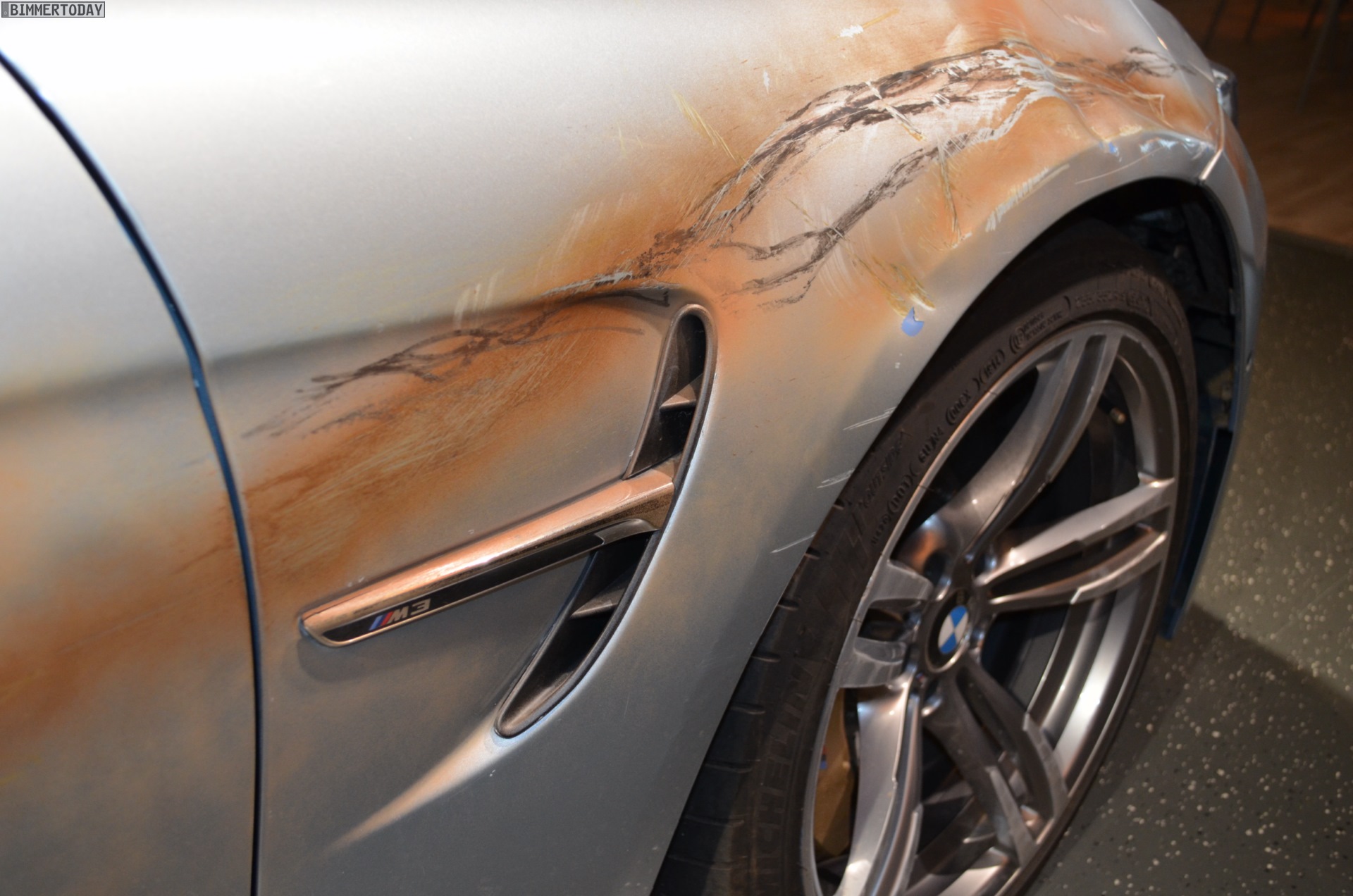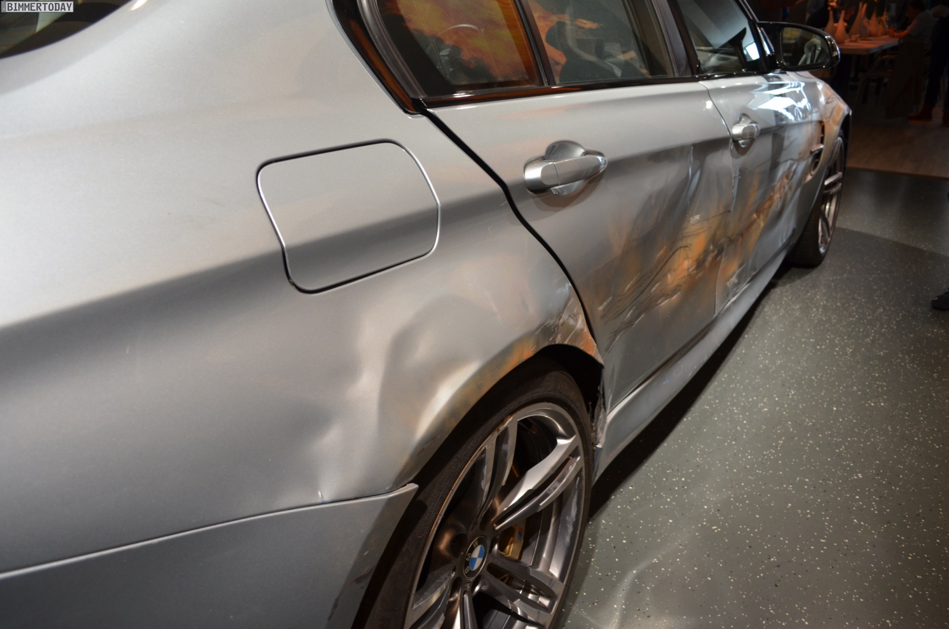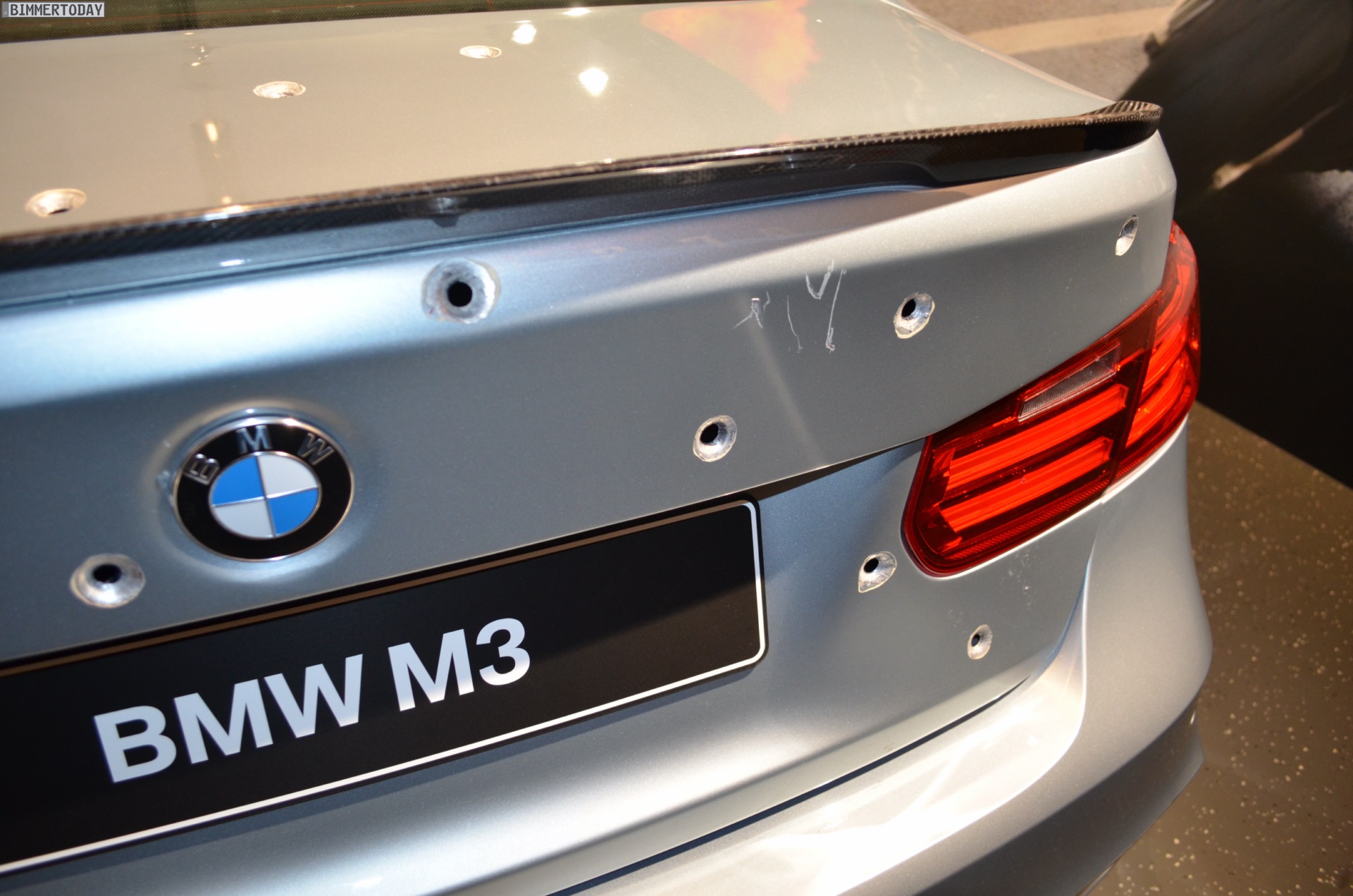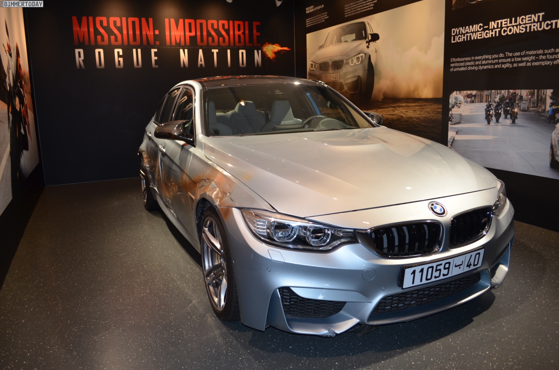 During film shooting, several F80 M3s have been damaged, but one of them was saved from the trash compactor and displayed at the BMW M facility in Garching, just outside Munich. The Silverstone Metallic sedan shows visible signs of body damage and lots of bullet holes obtained during the stunts performed in the movie.