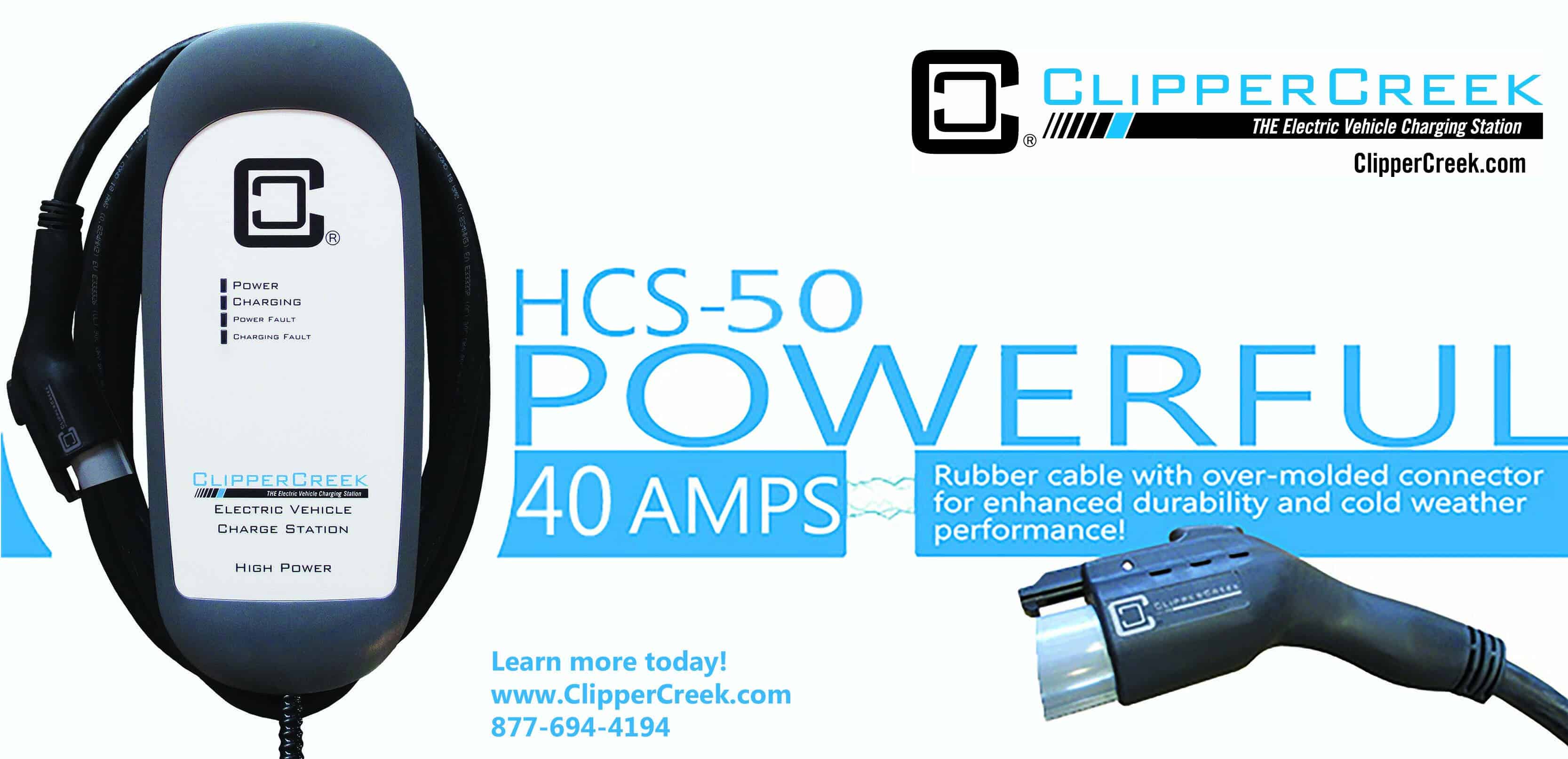 ClipperCreek has added the HCS-50 electric vehicle charging station to their product line. The HCS-50 is a powerful and rugged 40 amp station paired with a highly durable rubber overmolded cable and vehicle connector. The HCS-50 was built to serve the residential and commercial markets and comes with a 3-year warranty, a fully sealed, rugged NEMA 4 station enclosure, and 25 feet of charge cable. It also uses a rubber over-molding to fully seal the connector’s head, an unique feature to ClipperCreek.