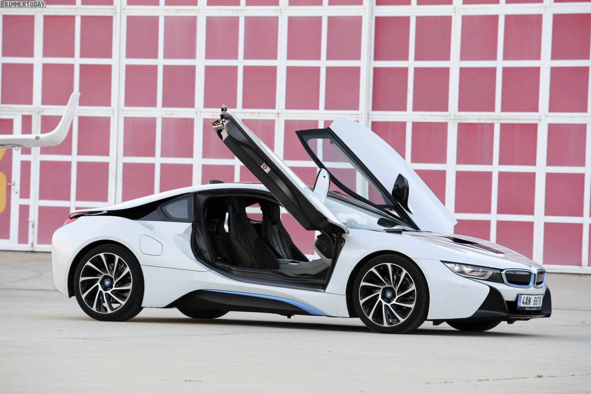 From Bulgaria, we bring you a new photo gallery of the BMW i8. The hybrid sportscar went on sale last year and quickly became an icon for the Bavarian brand. This Crystal White i8 found a home near a private airfield surrounded by small jets, a common theme around the world.
