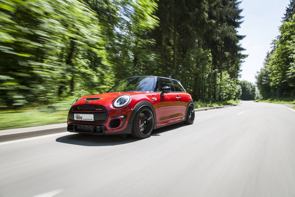 If the sporty setup of the Mini-John-Cooper-Works-series suspension kit is too inharmonious after a while, or if the Mini is mainly driven on bad roads, the KW Street Comfort suspension kit is the ideal alternative. Besides a continuous lowering of 15 – 35 mm, it convinces by the comfort-oriented setup. “The spring rate and the damper setup are designed for harmonious driving, without that the handling suffers at fast load changes”, describes KW Product Manager Johannes Wacker regarding the driving behavior of the Mini John Cooper Works with a Street Comfort suspension kit.