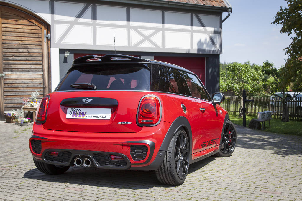KW Automotive launches their stainless steel KW coilovers for the new Mini John Cooper Works. Depending on the kit, the coilovers enable a lowering of 20 – 45 mm at the front and rear axle. The stainless steel suspension kits are tailored to both street driving and track racing with the KW Clubsport coilover kit and the Street Comfort suspension kit which also allows for a continuous lowering.