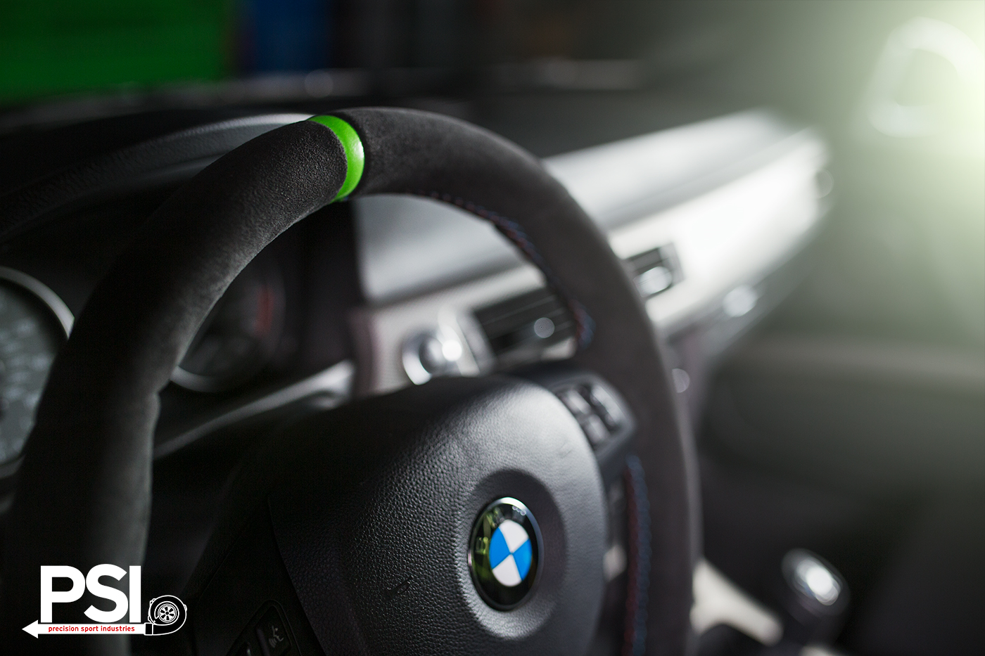 To guide the assault, a BMW M Performance alcantara steering wheel with Ithaca Verde stripe was installed, and a P3 Cars boost vent gauge monitors vital signs. Power is delivered in short order by a BMS JB4 for N54, BMW DCI, and a healthy pair of VRSF catless downpipes. Active Autowerke, who have teamed up with PSI, supplied a charge pipe and BOV, their excellent front-mount intercooler and a full stainless exhaust system. The careful combination of all these parts ensures a never-ending surge of building acceleration off the line and out of each corner.
