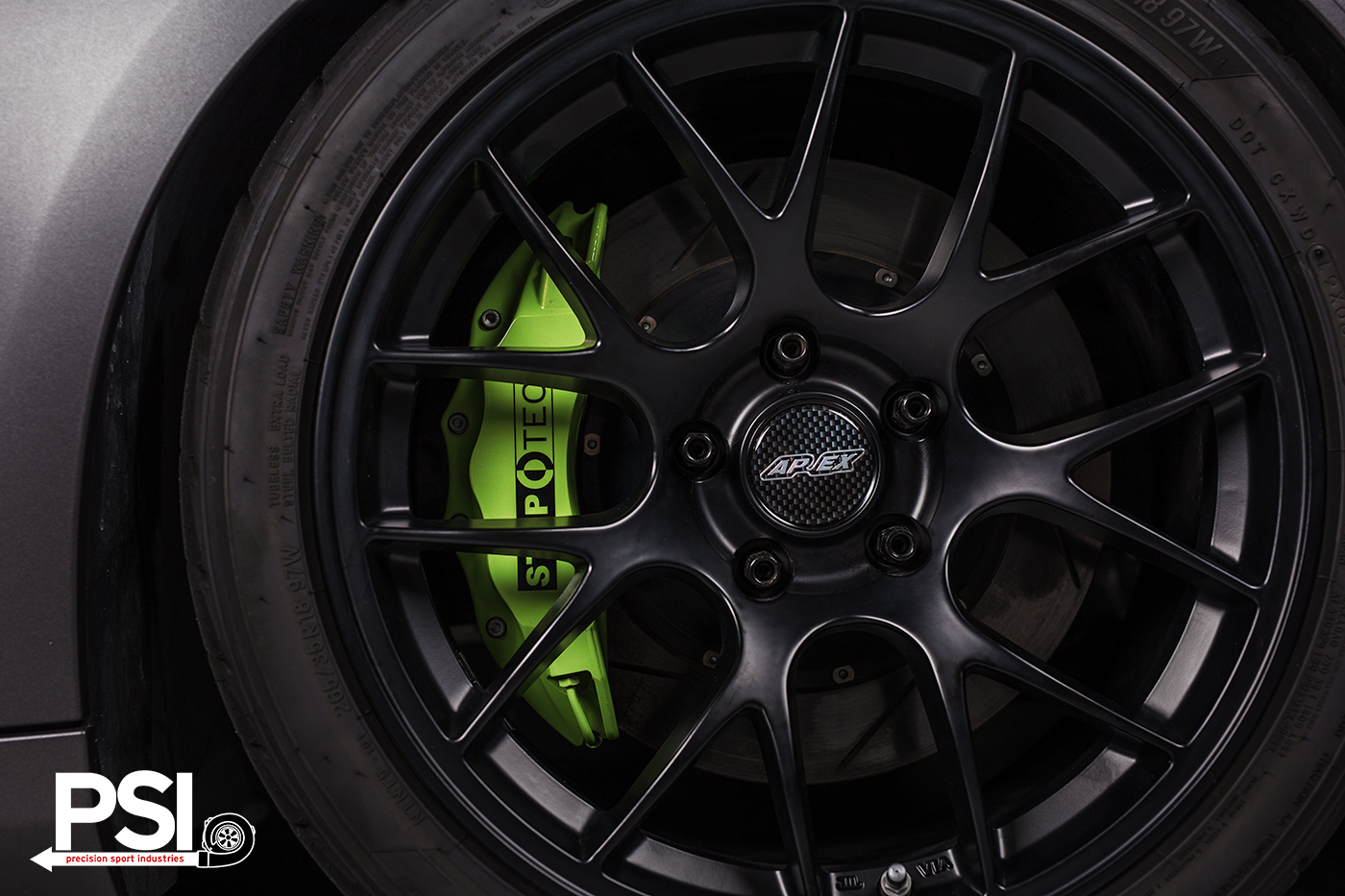 For the perfect ride height while maintaining good compliance, PSI installed a set of KW Clubsport coilovers that allow for fine-tuning the critical compression and rebound attributes of a suspension setup. In front of those are a complete high-visibility StopTech 355mm/345mm big brake kit with calipers painted in Ithaca Verde for maximum contrast with the body color and wheels. These monster units ensure fade-free speed reduction, lap after lap, while the sturdy SPEC Stage 2 clutch and UUC short shifter enable quick, fluid movement between gears. A gorgeous set of Apex EC-7 18″ wheels wrapped in Nitto NT05s help reduce weight, look fantastic, and grip like a cat being held over a pool.