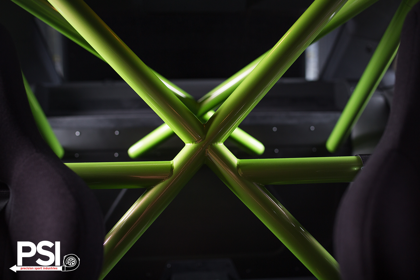 The shop also wanted maximum chassis stiffening, so a full bolt-in roll bar was sourced from Fall-Line Motorsports, also painted Ithaca Verde, and a snug set of the venerable Recaro Pole Position seats were fastened down, using Macht Schnell floor mounts. For FIA-level restraints, PSI turned once again to Sabelt, who delivered an amazing 6-point harness to hold the driver in place while engaged in combat. Behind everything, working in concert with the roll bar, is a new PSI Edition alcantara rear seat delete and closeout with custom stamped aluminum panels.