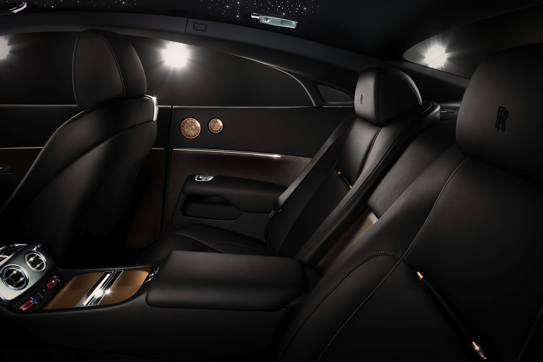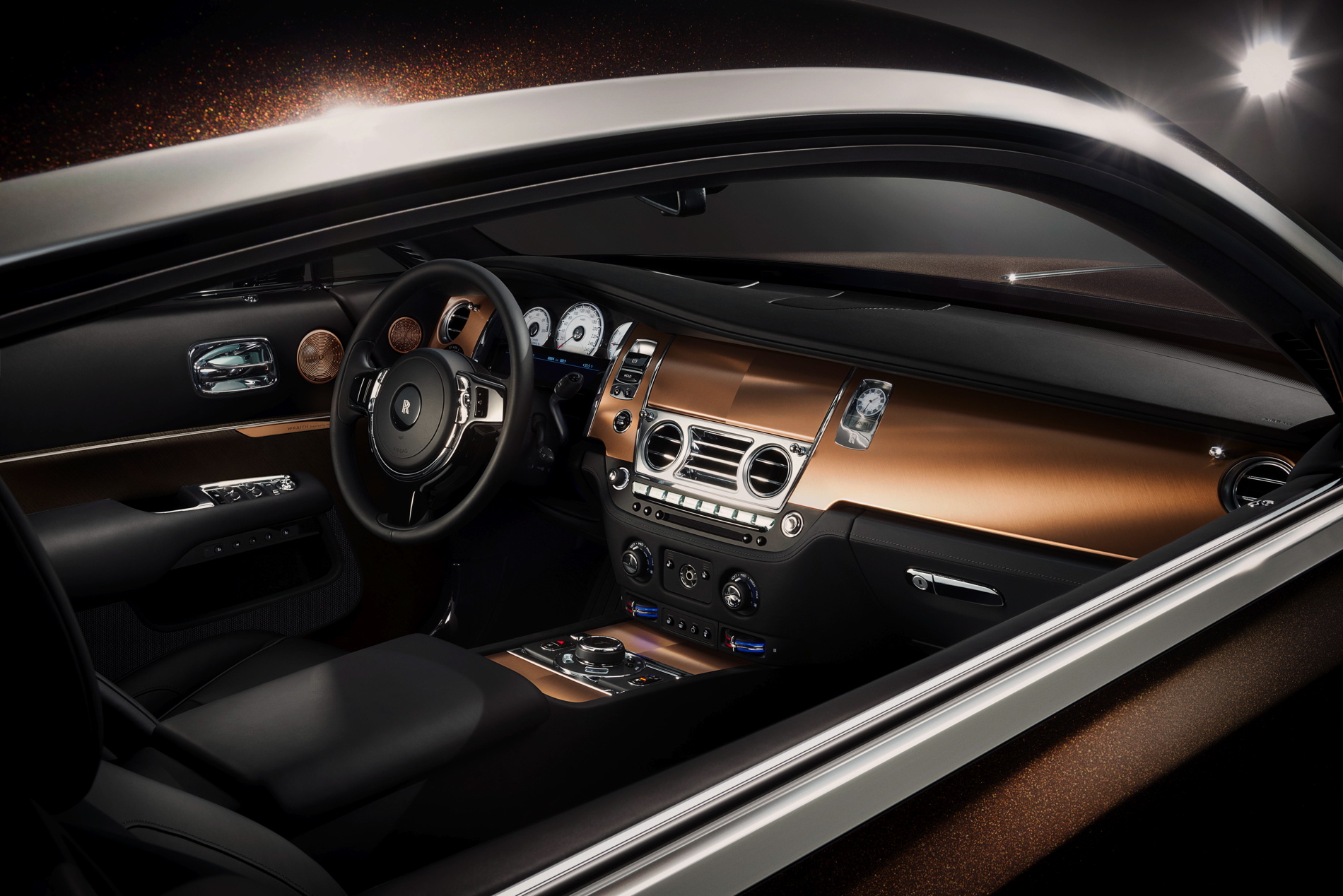 A book matched copper finish features for the first time on Wraith’s fascia, boldly extending the car’s theme. The same copper tone extends to Wraith’s signature seat bullets.