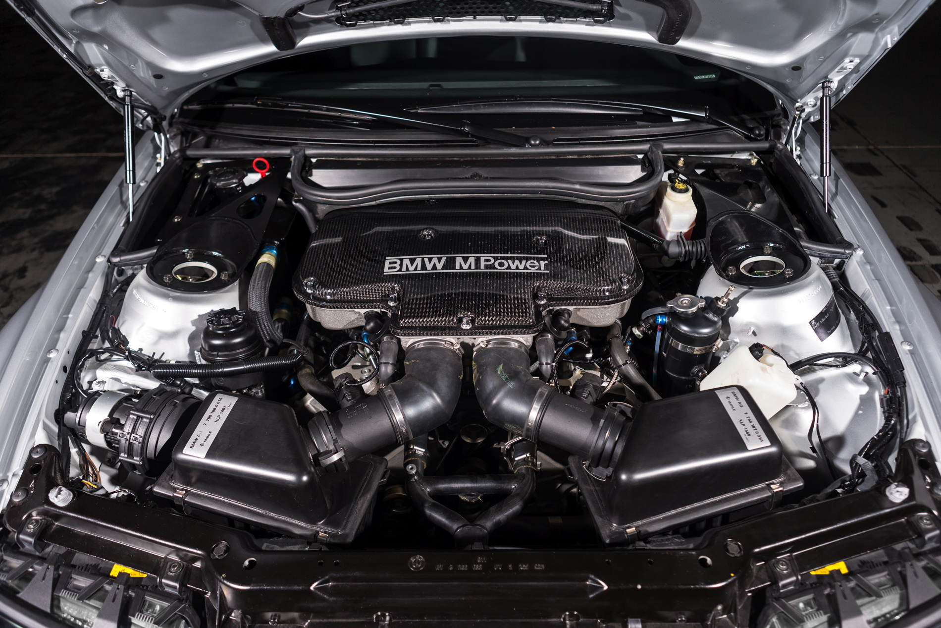 In order to fulfill the homologation requirements, the M3 GTR road car was built in parallel with the racing program in the special vehicles department of the BMW Regensburg Plant. The road car used a slightly detuned version of the P60 rated at 380 horsepower at 7,000 rpm – complete with dry-sump lubrication and sharply canted radiator with hood venting. Power was transmitted through a racing style twin-disc clutch to a 6-speed manual gearbox and variable locking M differential.