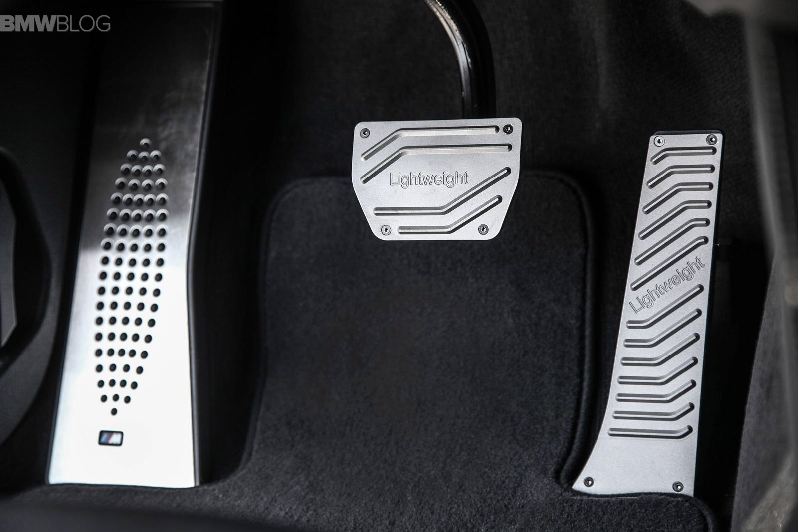 Black Alcantara with double contrast stitching can be found inside the cabin along with aftermarket parts like an aluminum pedal set, velour floor mats and an auxiliary display which has replaced the central-left air vent.