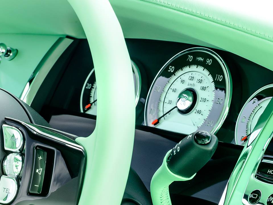 The exterior color is carried into the interior’s leather and veneer finishes, lamb’s wool floor mats, steering wheel, instrument dials, dashboard, speaker covers, and rear view mirror housing. Matte black and chrome round up the bespoke look of this Rolls.